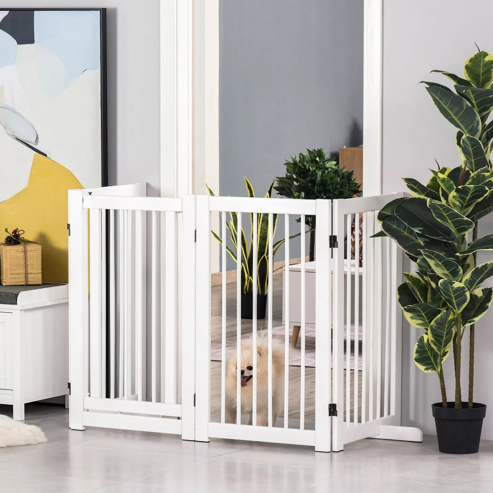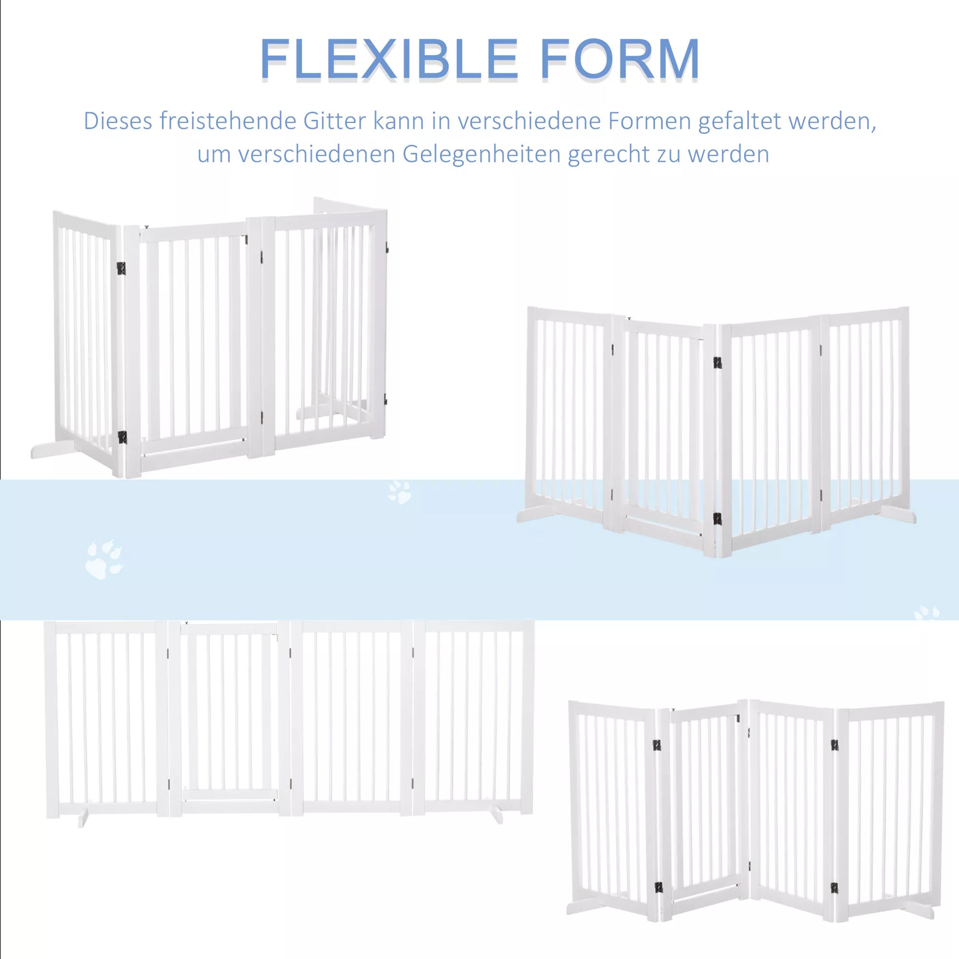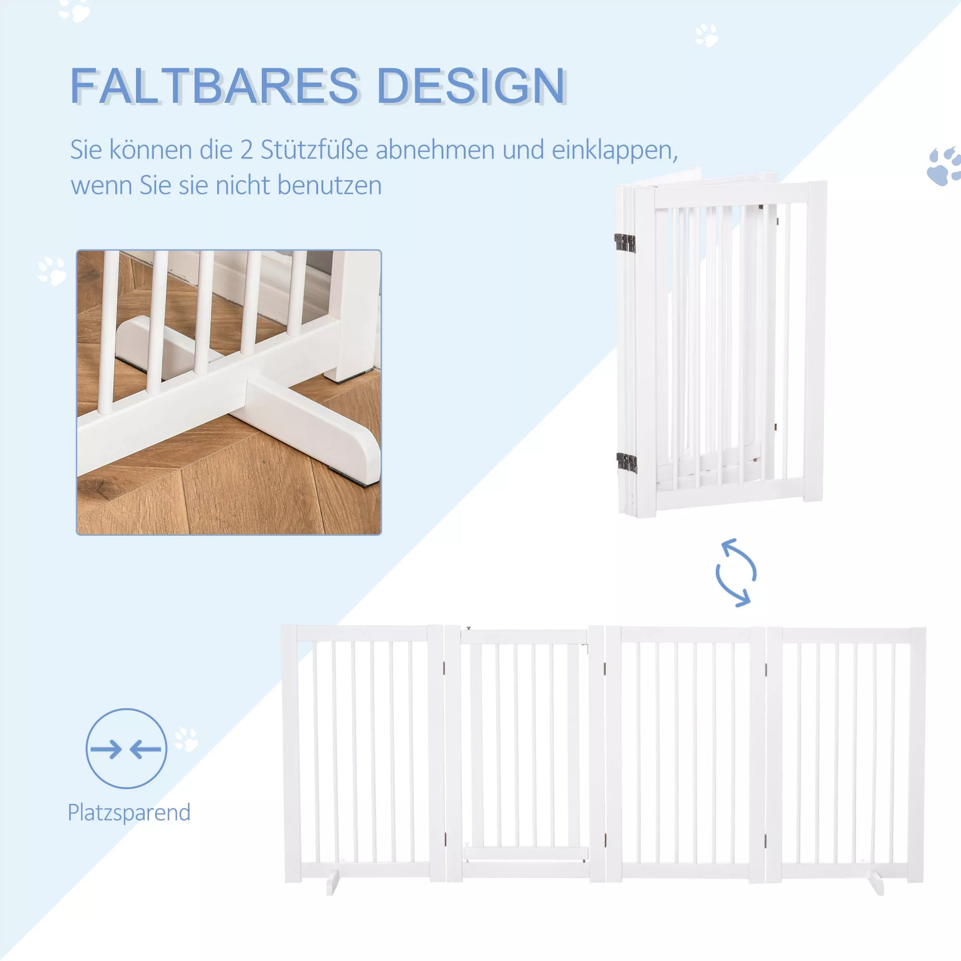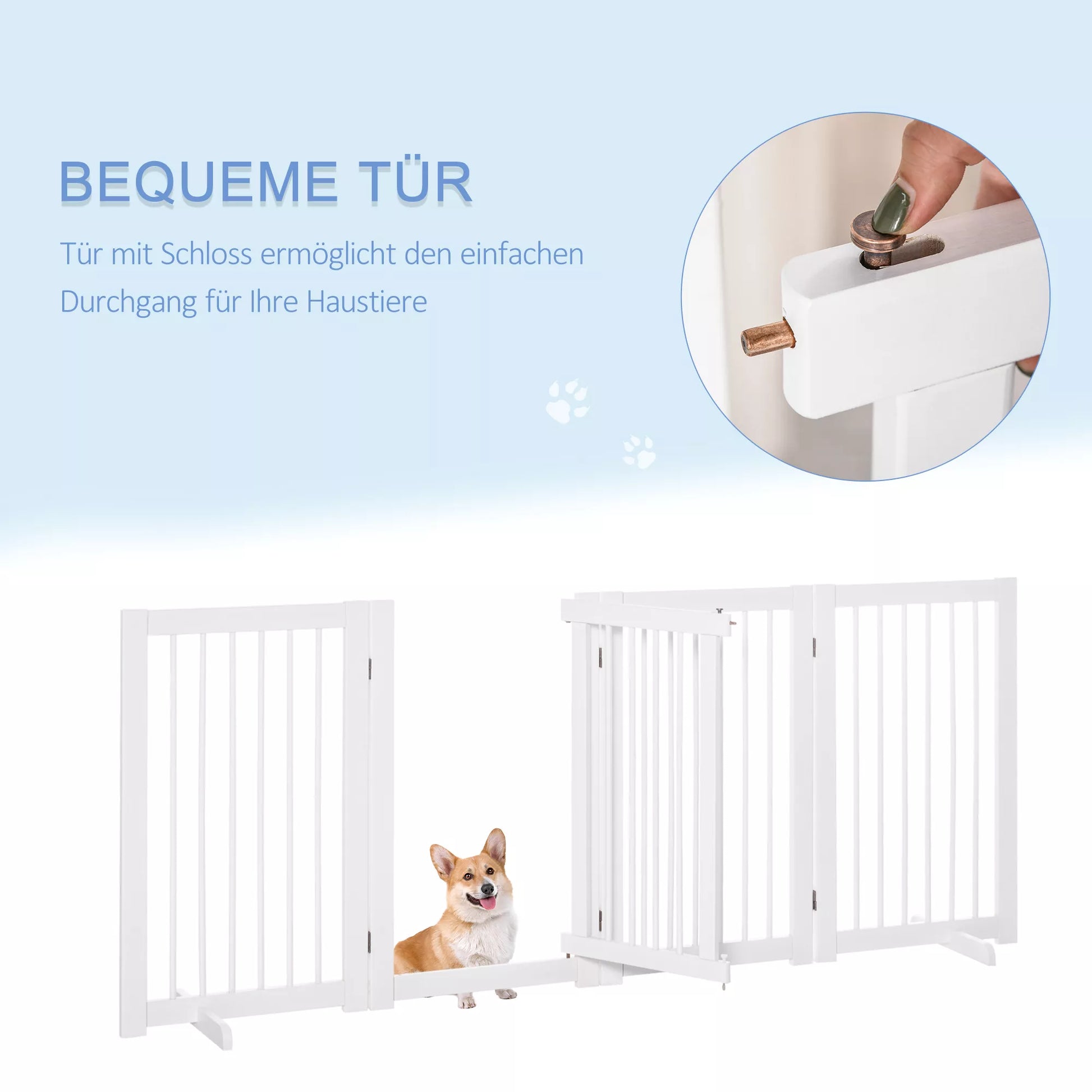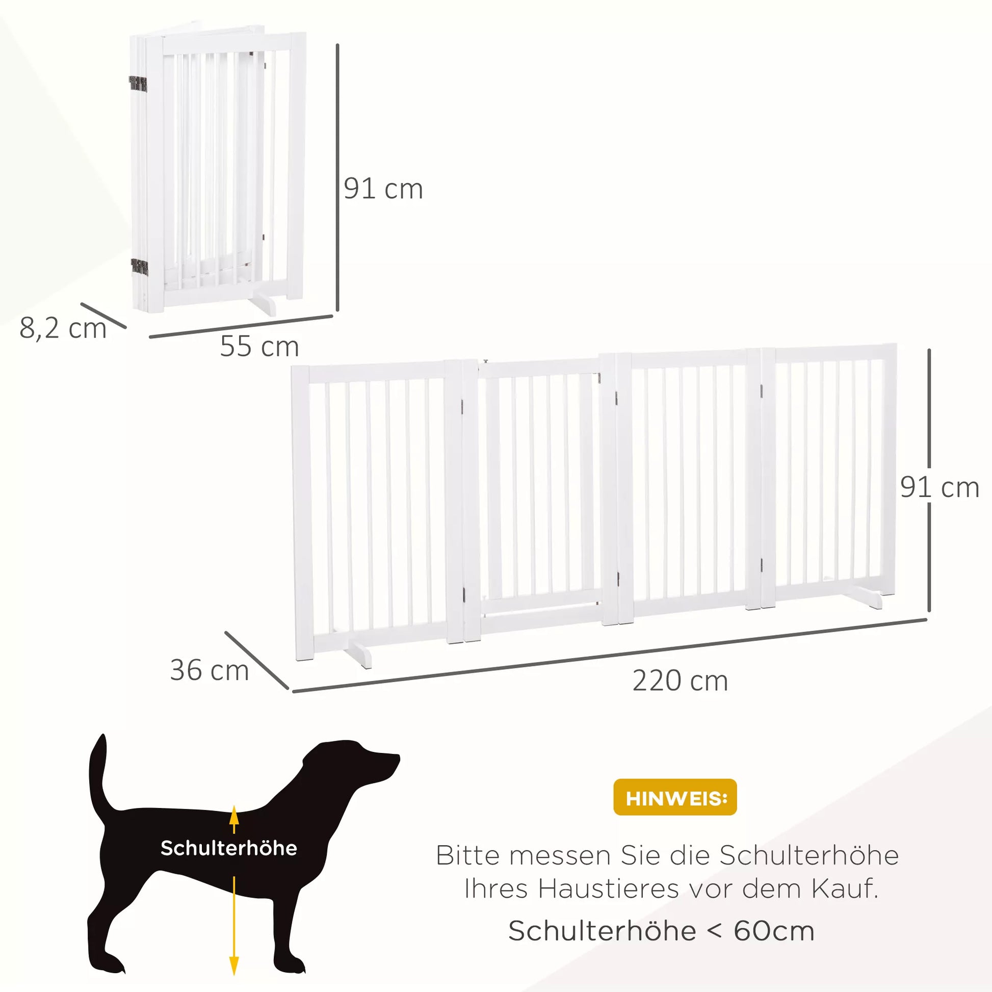 Suņu drošības vārtiņi, 4 daļu, 220 x 91 cm, salokāmi, drošības vārtiņi ar durvīm, brīvi stāvoši suņu vārtiņi ar 2 atbalsta kājām, koka kāpņu vārtiņi gaitenim, virtuvei, kāpnēm, balti