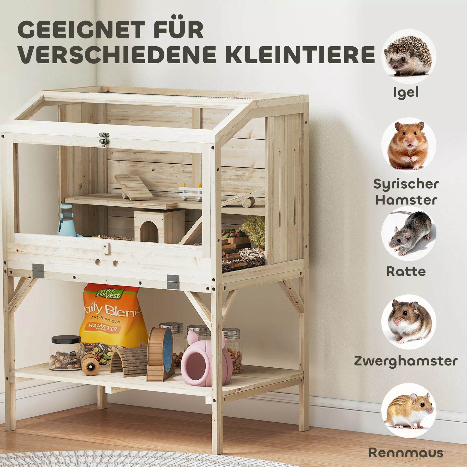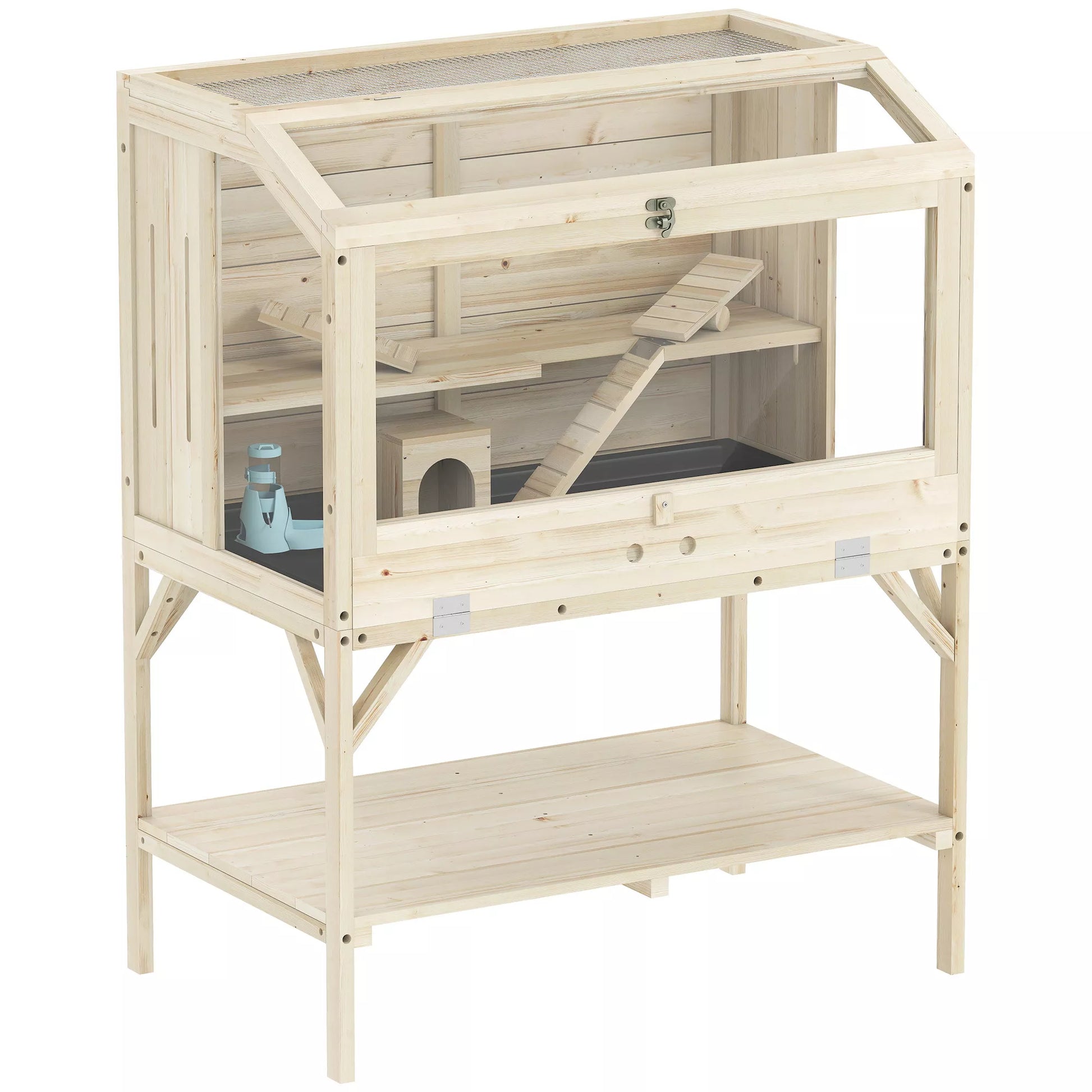 Jūsų mažieji gyvūnėliai gali laipioti, žaisti jaukiose slėptuvėse ir džiaugtis pridedamais sūpuoklėmis ir rampos. Skaidrus PET plokštės ir šoninė ventiliacija užtikrina aiškų matomumą ir šviežio oro srautą, o tvirtas pušies medžio rėmas su neslystančiomis kojelėmis užtikrina stabilumą. Apatinis skyrius suteikia papildomos saugojimo vietos ir daro šį narvą saugia ir praktiška buveine žiurkėnams ir smiltpelėms.