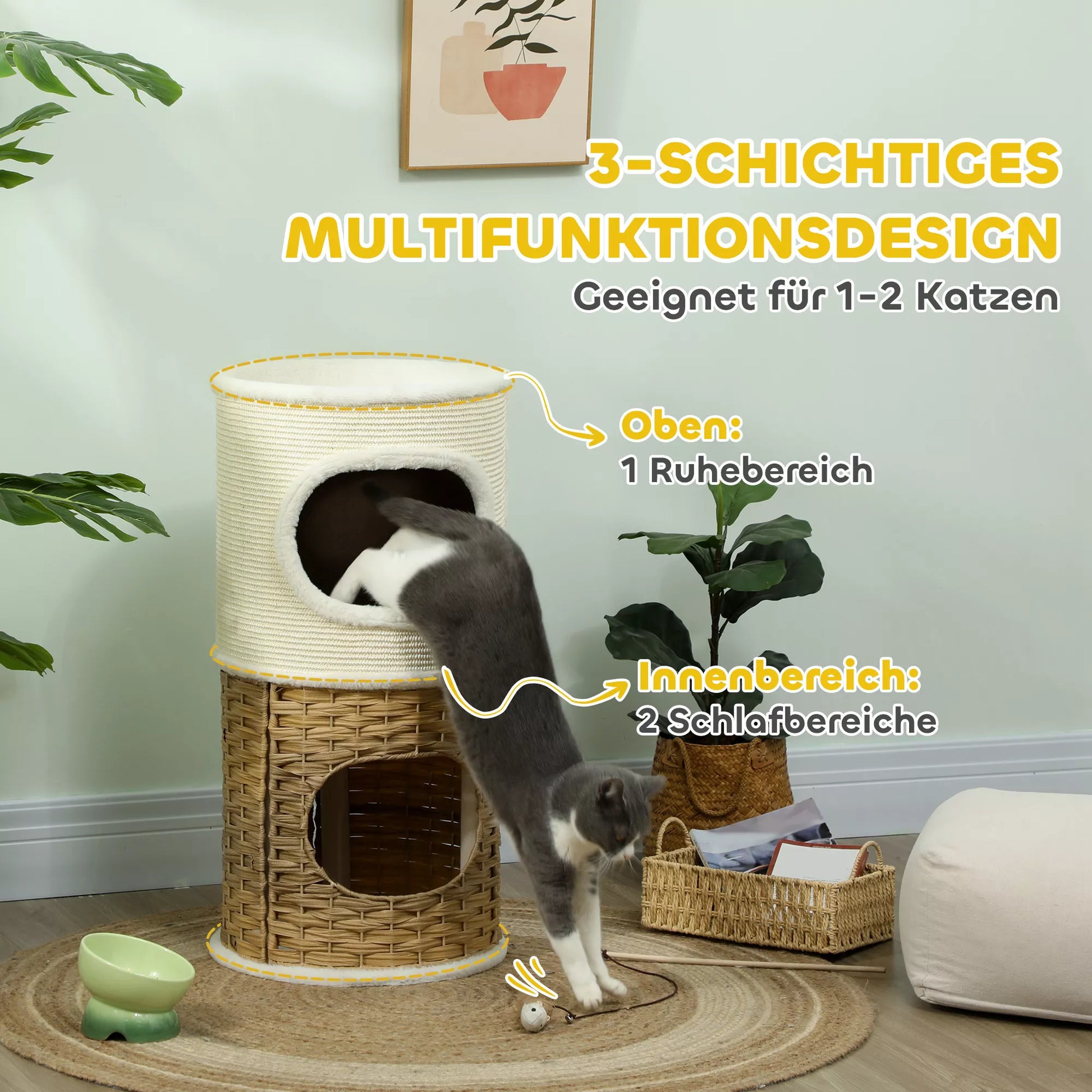 Atklājiet Kaķu māju: trīsvietīga kaķu paradīze ar divām ieejām ērtai piekļuvei. Šī kaķu māja, kas izgatavota no skaidu plātnes, truša kažokādas un PE rotangpalmas, garantē stabilitāti un ir aprīkota ar sizala skrāpējamo stabu, kas palīdz asināt nagus un aizsargā mēbeles. Tās ir stilīgas un mājīgas mājas jūsu mīļotajam kaķim!