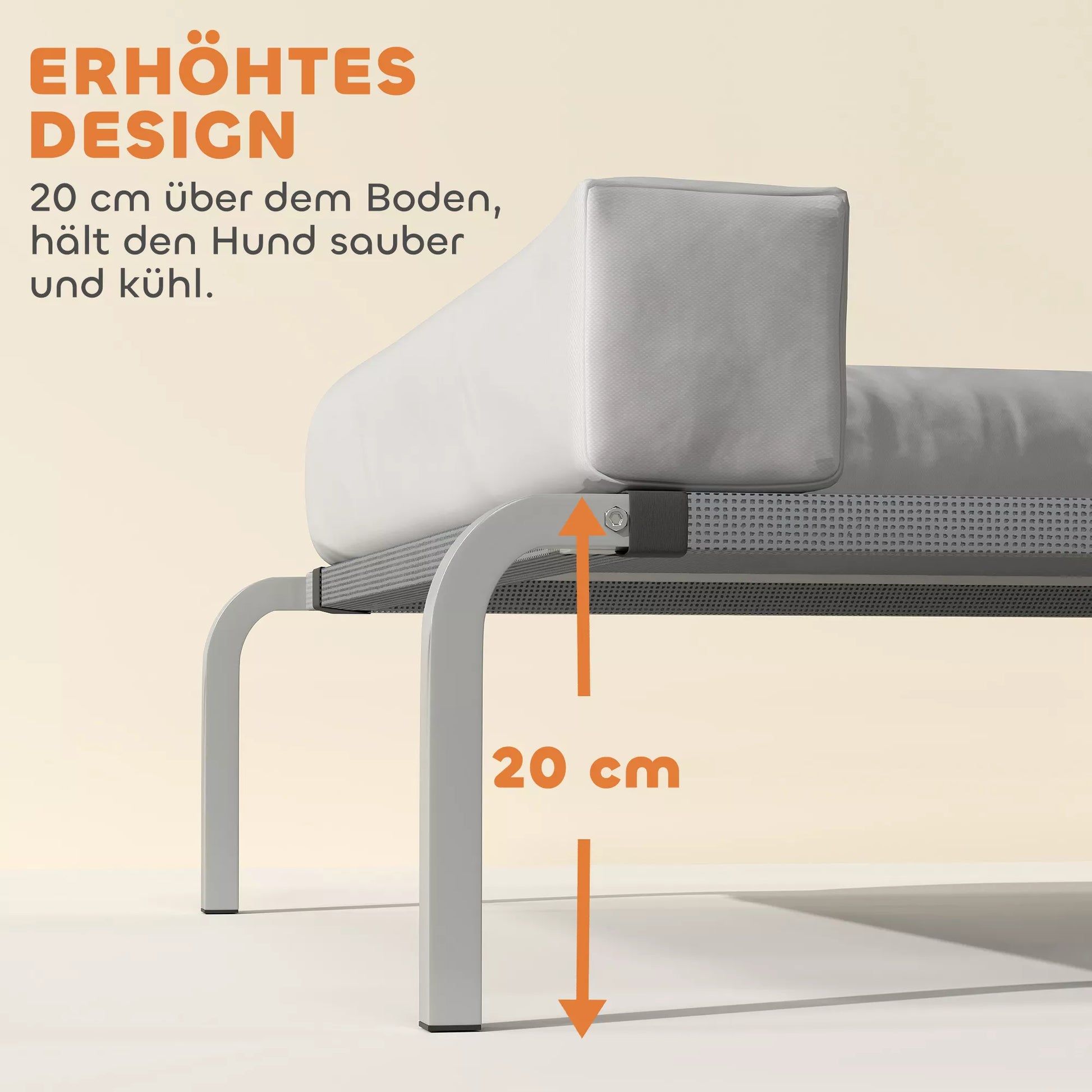 Izbaudiet āra suņu gultas komfortu, kas ir paaugstināta par 20 cm ar kājām, kas nodrošina sausu un stabilu guļvietu. Āra suņu gultas L-veida spilvens veicina jūsu suņa relaksāciju, maigi apņemot tā galvu un ķermeni. Āra suņu gultas Textilene audums garantē elpojamību un komfortu visu gadu - vēss vasarā un mājīgs ziemā. Īsta paradīze jūsu četrkājainajam draugam!