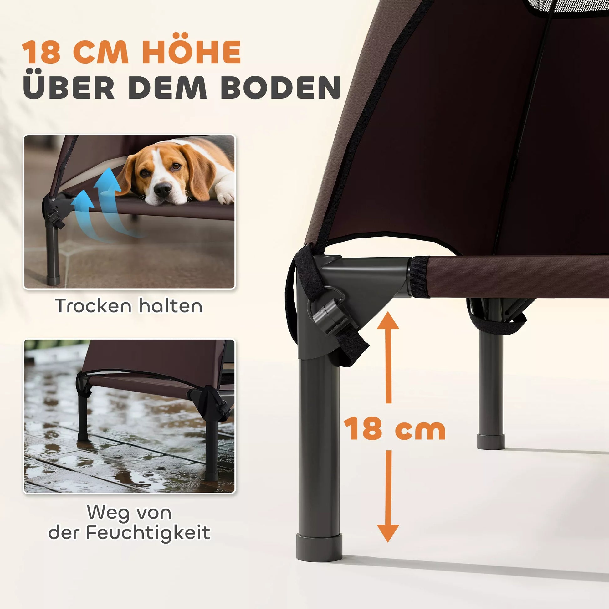Palutiniet savu pūkaino draugu ar āra suņu gultu ar jumtiņu, kas uzturēs to vēsu un aizsargātu. Āra suņu gultas inovatīvais dizains ietver trīspusēju jumtiņu optimālai aizsardzībai no saules, ko ir viegli noņemt. Gulta ir pacelta 18 cm virs zemes, lai nodrošinātu sausumu un stabilitāti. Izgatavota no elpojoša tekstila sieta, āra suņu gulta ir ideāli piemērota vidējiem un lieliem suņiem līdz 30 kg, nodrošinot tiem ideālu atpūtas vietu. Lieliski piemērota lietošanai mājās vai ceļā - komplektā ir iekļauta uzglabāšanas/pārnēsāšanas soma!
