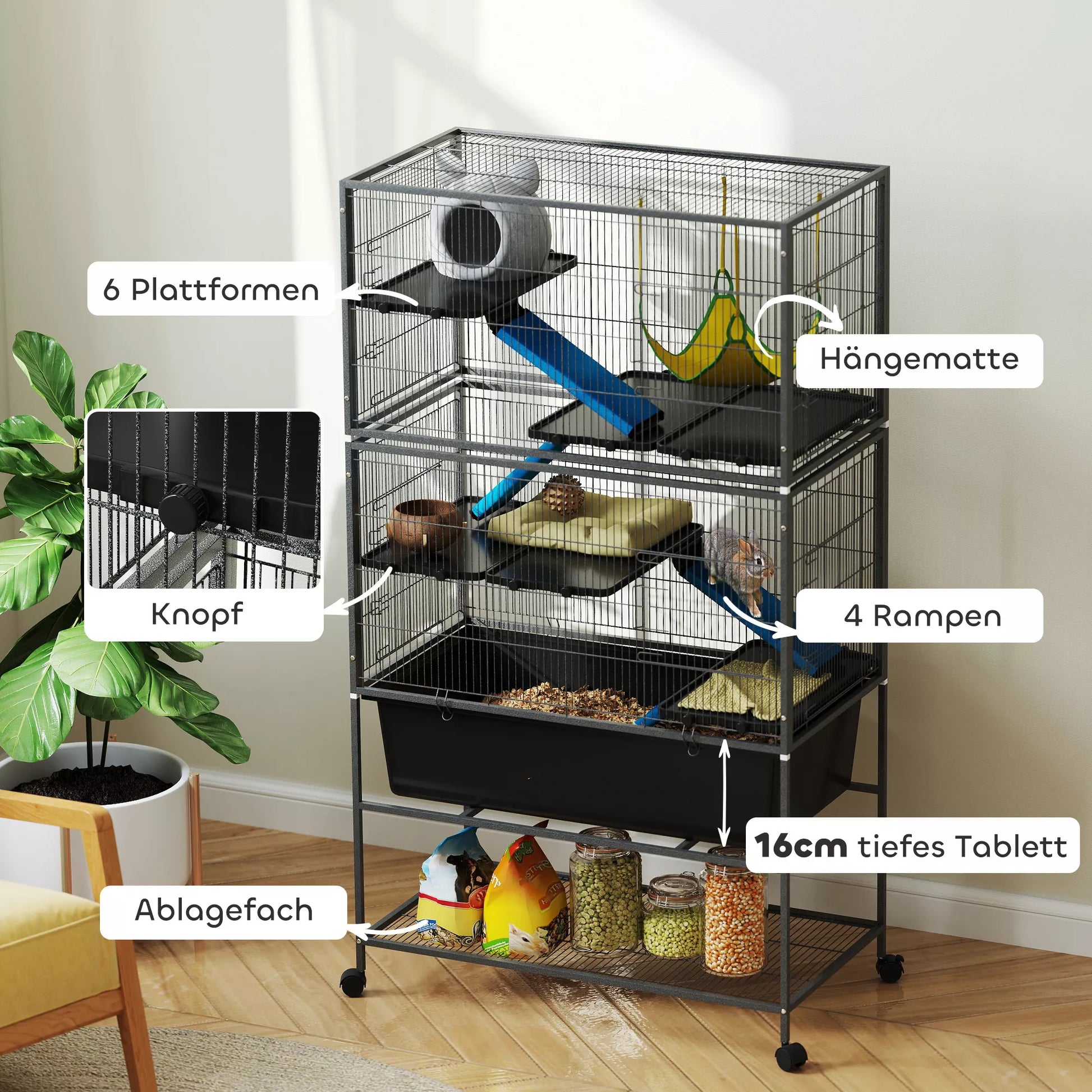 - ✔ Apatinis graužikų narvelio daiktadėžė leidžia laikyti reikmenis po ranka ir tvarkingai
