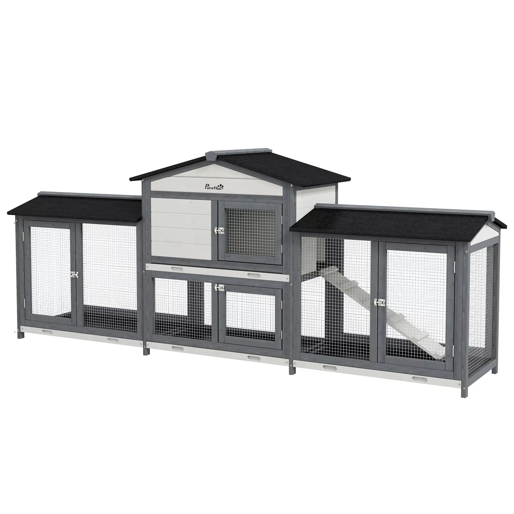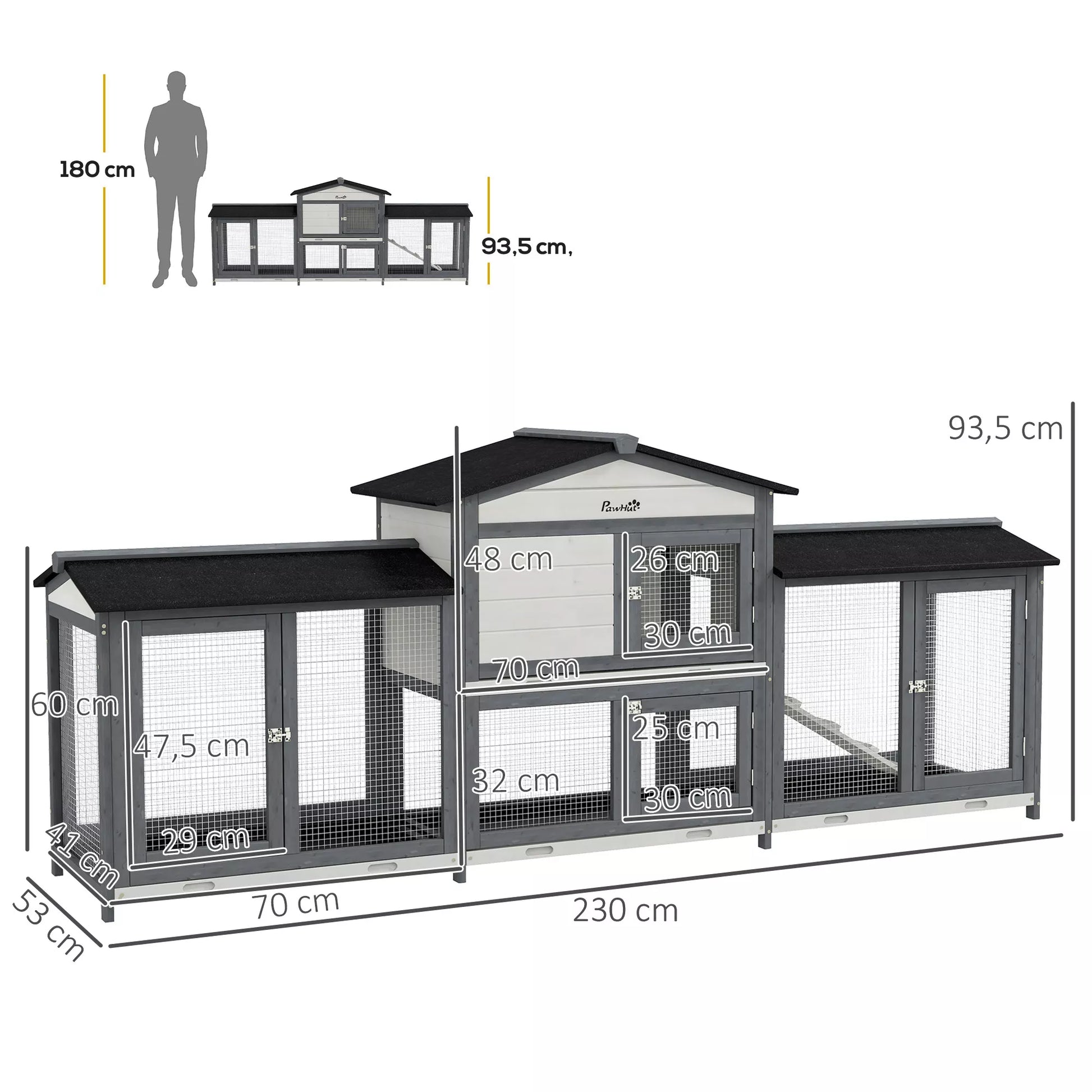 - ✔ Durų dydis: 30L x 26H cm (pagrindinis namelis), 30L x 25H cm (išbėgimo dėžė po pagrindiniu nameliu), 29L x 47,5H cm (šoninės išbėgimo dėžės)