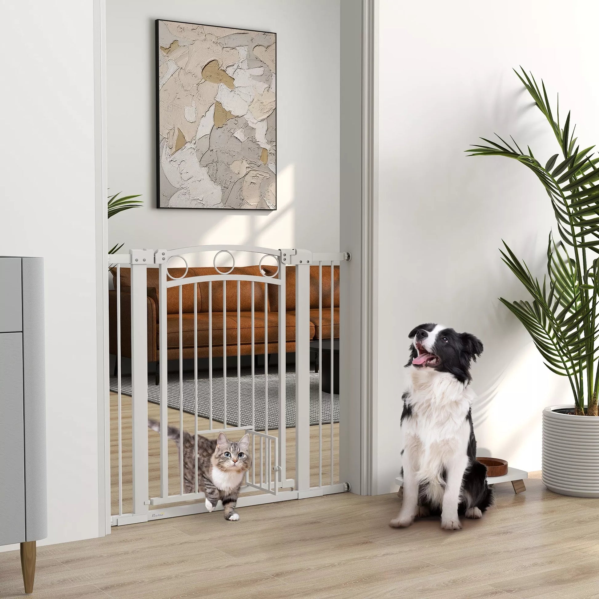 Mājdzīvnieku vārtiņi, 96 cm, drošības vārtiņi kāpnēm, regulējams platums 76-104 cm, ar kaķu durvīm, kāpnēm un durvju ailēm, balti