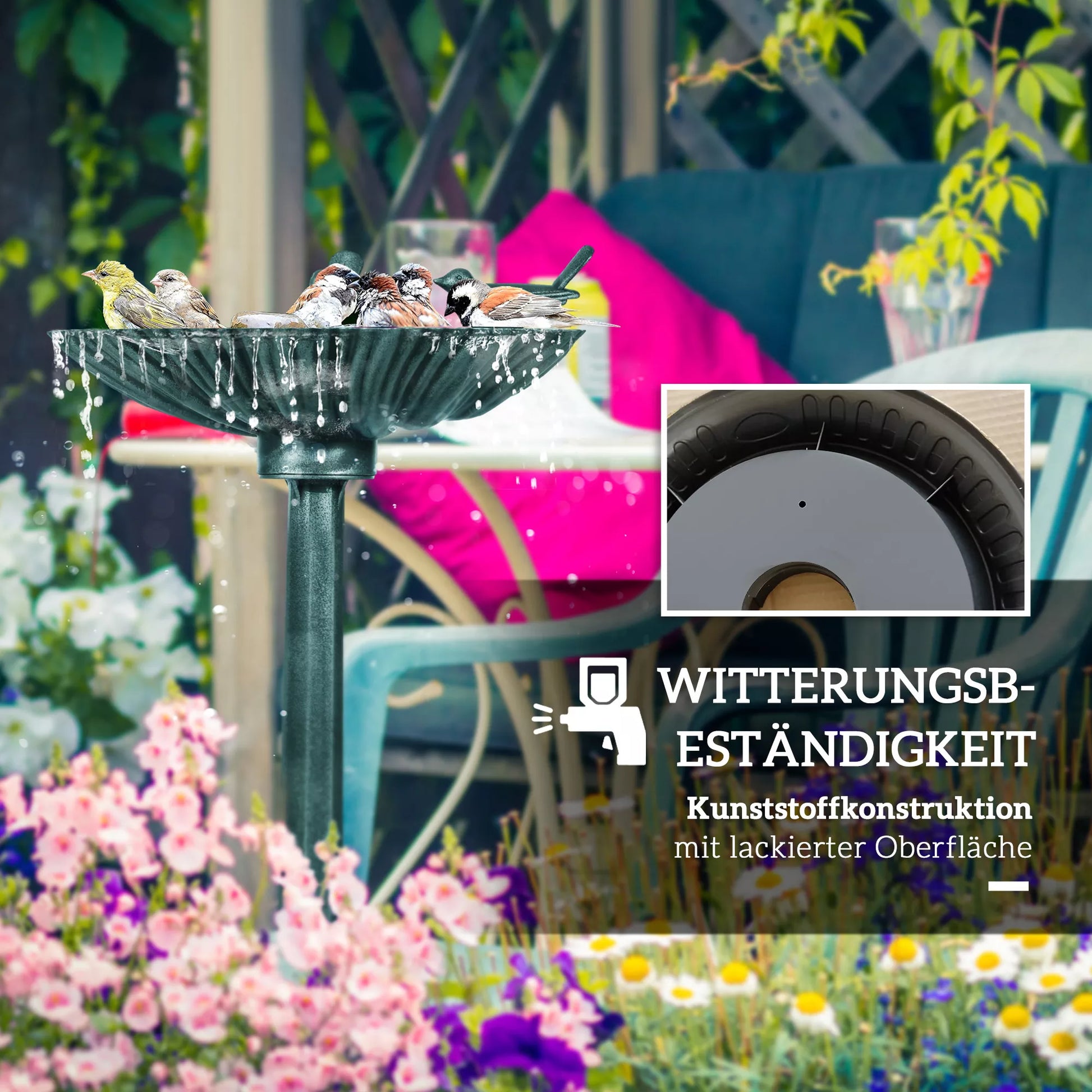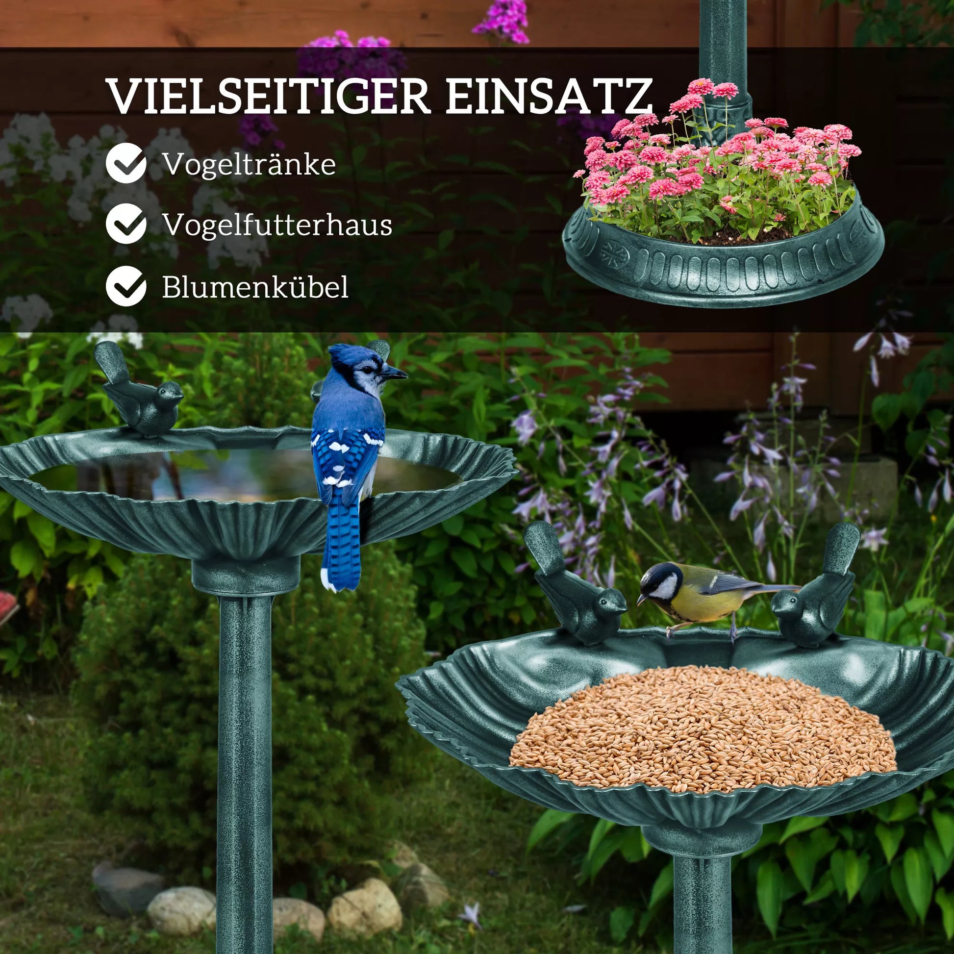 Mūsų plastikinė paukščių vonia sodui, klasikinio dizaino ir patogi konstrukcijos, visus metus paverčia jūsų sodą įvairių paukščių rūšių susitikimo vieta. Ši stovinti paukščių vonia turi du dubenėlius pašarui ir vandeniui. Paukščių vonia su dubenėlio formos vonia ir dviem paukščių figūromis suteikia jūsų lauko erdvei elegantišką akcentą su savo atspariai oro sąlygoms, šalčiui ir senoviniu metalo išvaizda.