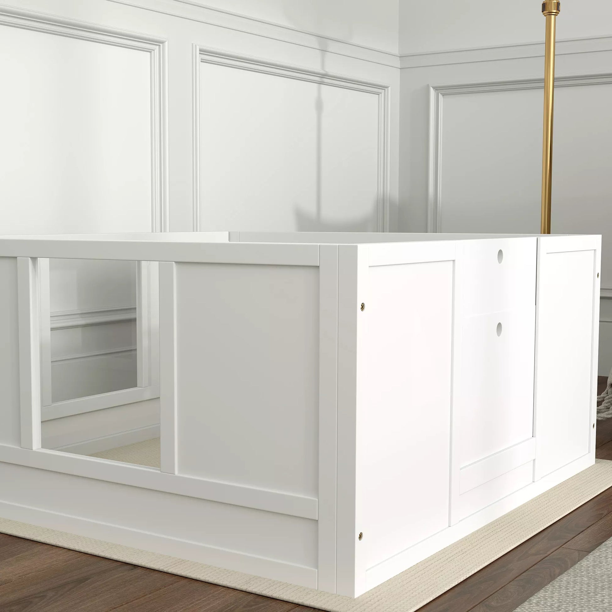 Kucēnu būris maziem un vidēja lieluma suņiem, kucēnu būris ar regulējamu ieeju, neslīdošiem kāju paliktņiem, balts