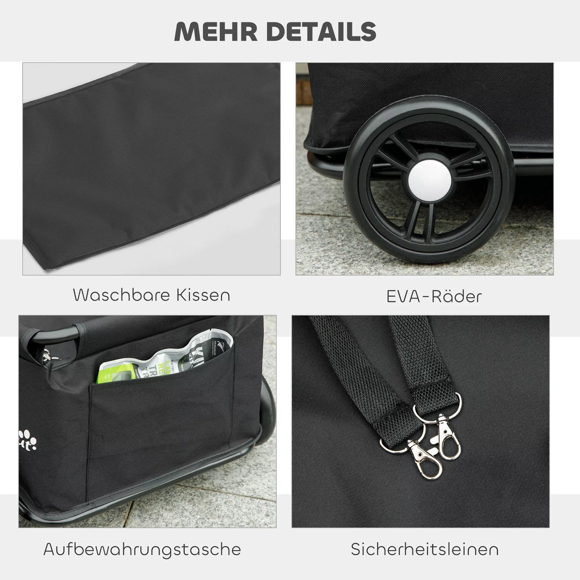 Suņu ratiņi, saliekami suņu ratiņi maziem suņiem līdz 4 kg, saliekami kaķu ratiņi ar rokturi, mazgājams spilvens, drošības siksnas, uzglabāšanas kaste, 4 riteņi, melni