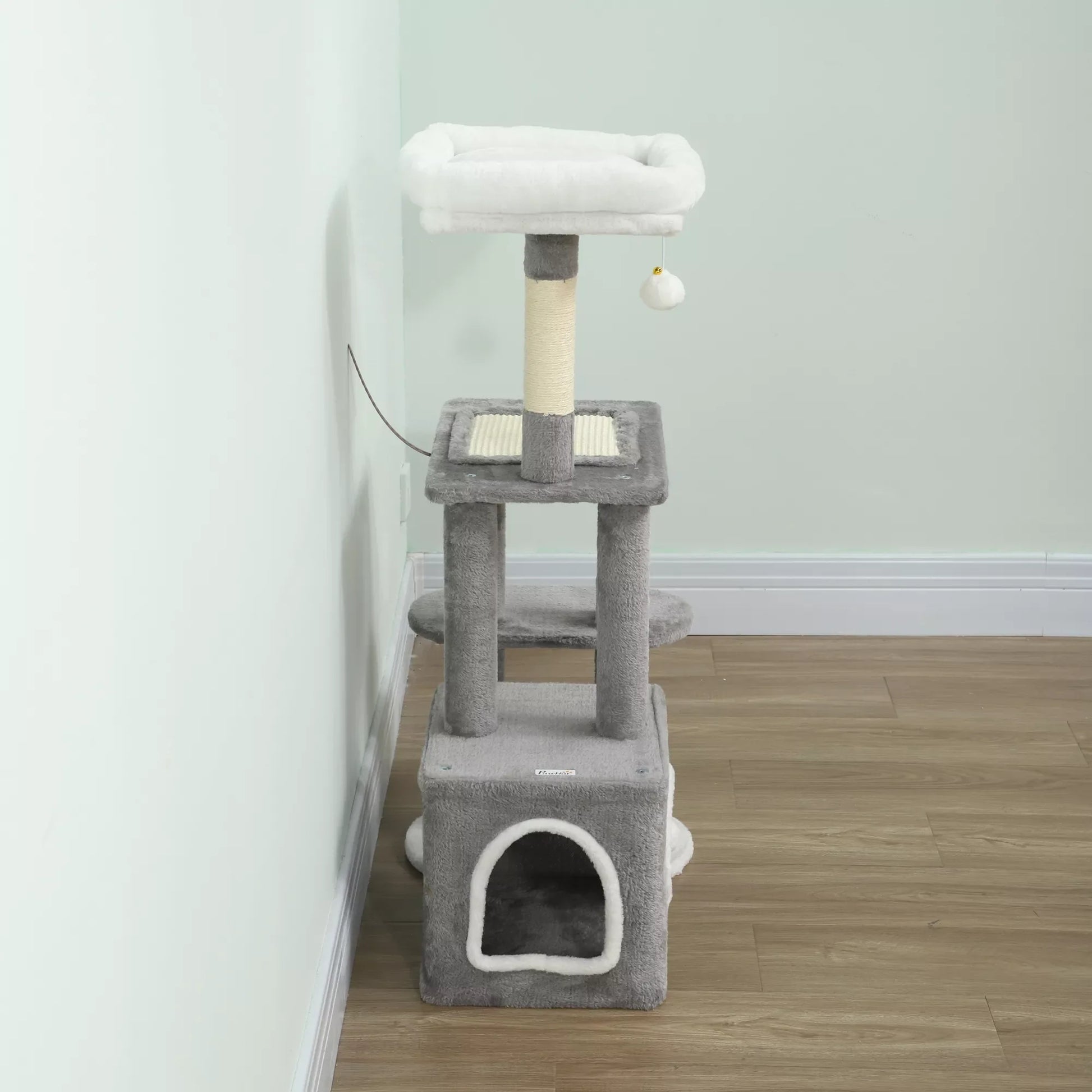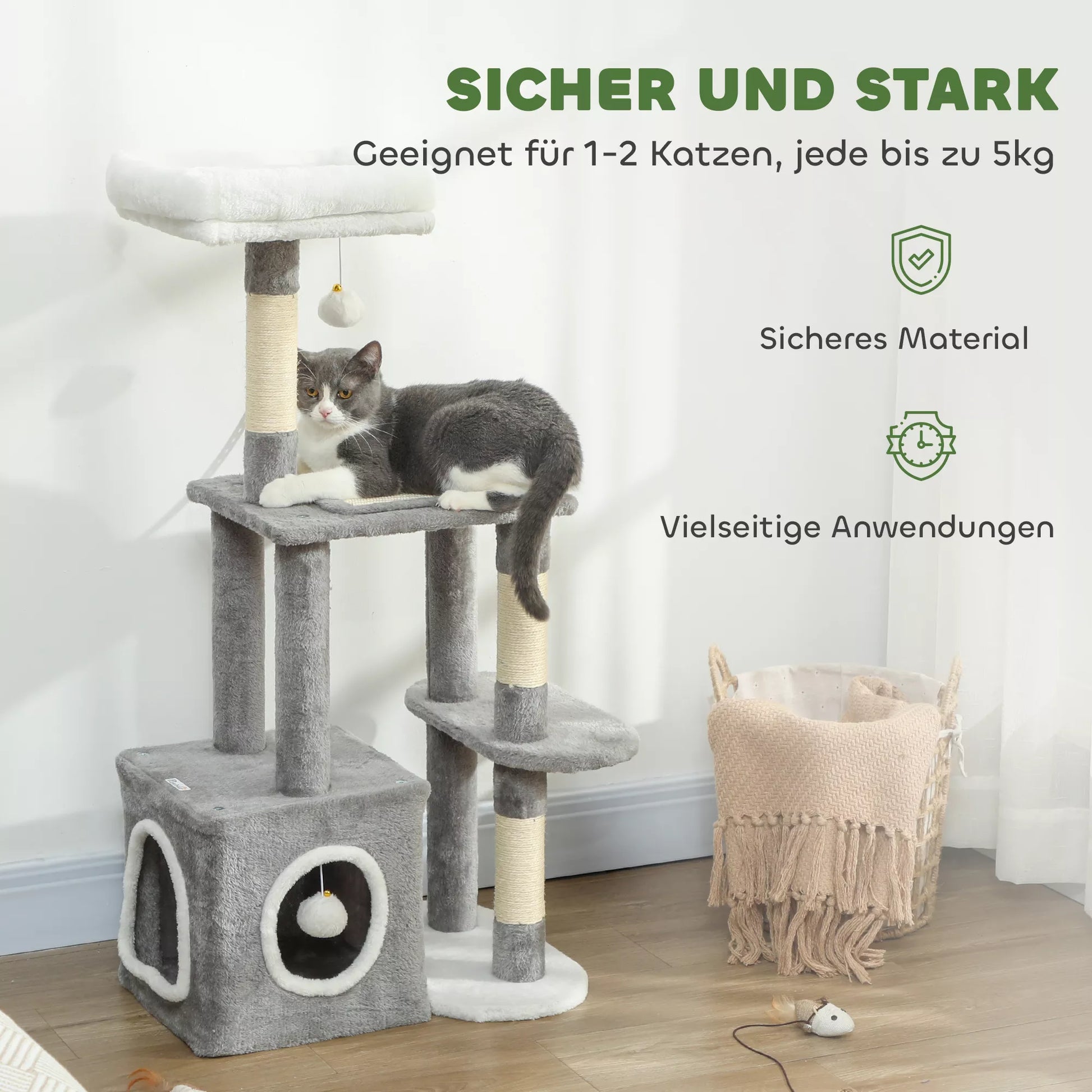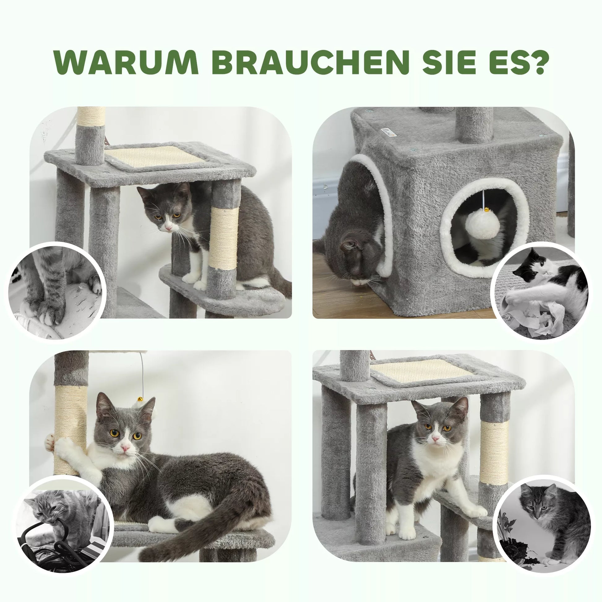 107 cm kačių medis, kačių bokštas su urveliu, 2 pliušiniai kamuoliukai, sisaliniai stiebai, didelė platforma, 55x40x107 cm, pilkos spalvos