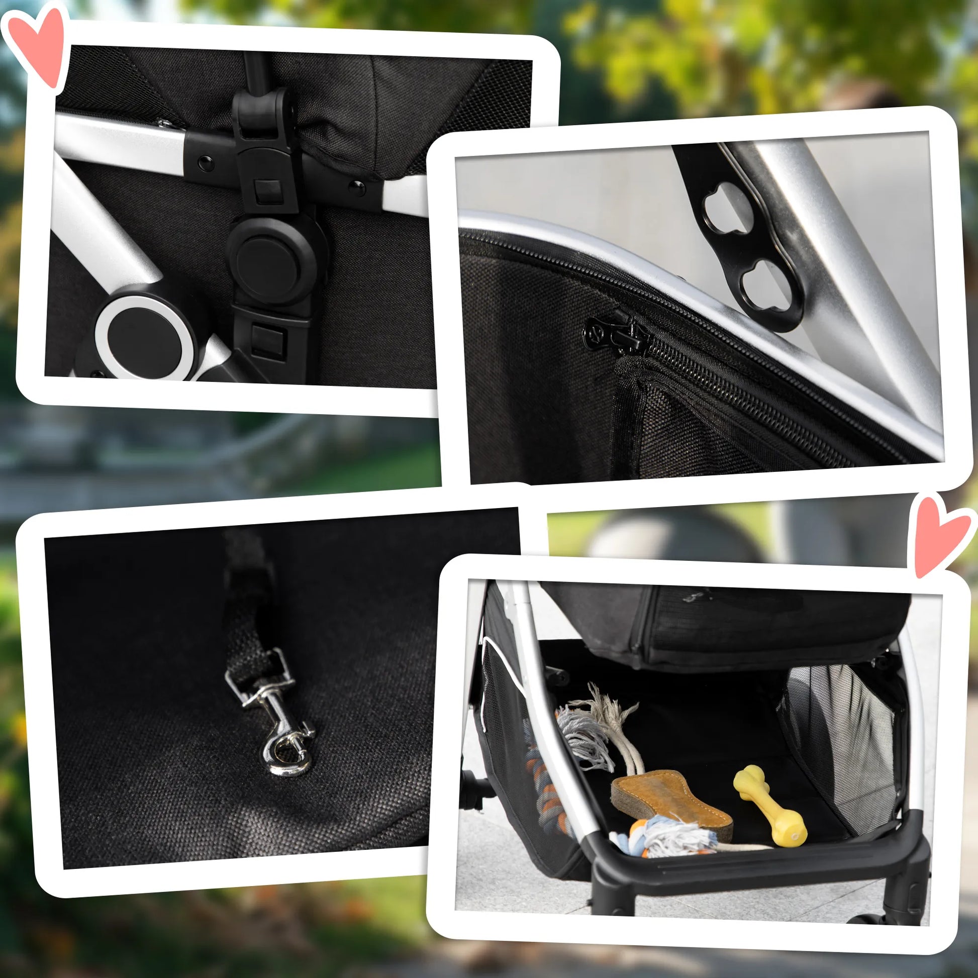 Su šia šunų vežimėlio (neberodoma prekės ženklo pavadinimo) galėsite saugiai ir patogiai transportuoti savo augintinį. Jis turi keturis lengvai riedančius ratus ir rankeną, todėl jį lengva pasiimti su savimi keliaujant. Šunų vežimėlis yra erdvus, todėl jūsų plaukuotas draugas turės daug vietos viduje. Jame yra tinkliniai langai gerai ventiliacijai ir keturių pakopų reguliuojamas stogelis. Vežimėlis turi papildomą krepšį, kuriame galėsite laikyti reikmenis.
