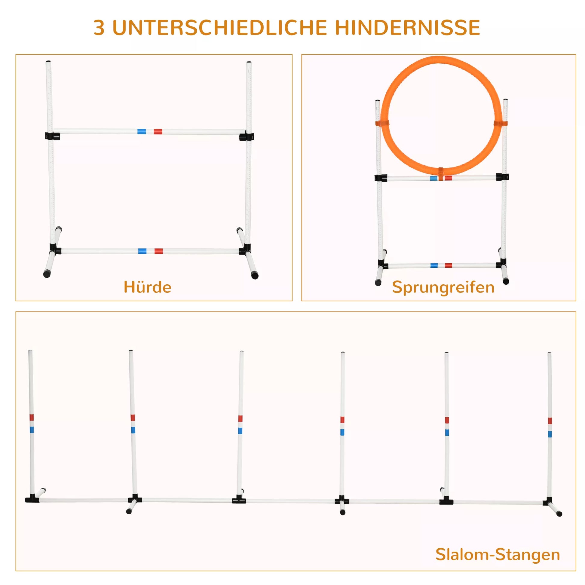 Šis PawHut naminių gyvūnėlių mokymo rinkinys yra puikus būdas pagerinti jūsų augintinių natūralius instinktus ir užmegzti glaudų ryšį tarp jūsų ir jūsų augintinių. Jis taip pat gali padėti treniruoti jūsų augintinius su įvairia įranga, įskaitant aukštą šuolį, 6 pintus pagaliukus ir reguliuojamą šuolių žiedą. Pridedamas tvirtas krepšys, kad visi priedai tilptų kartu ir būtų patogiai transportuojami.