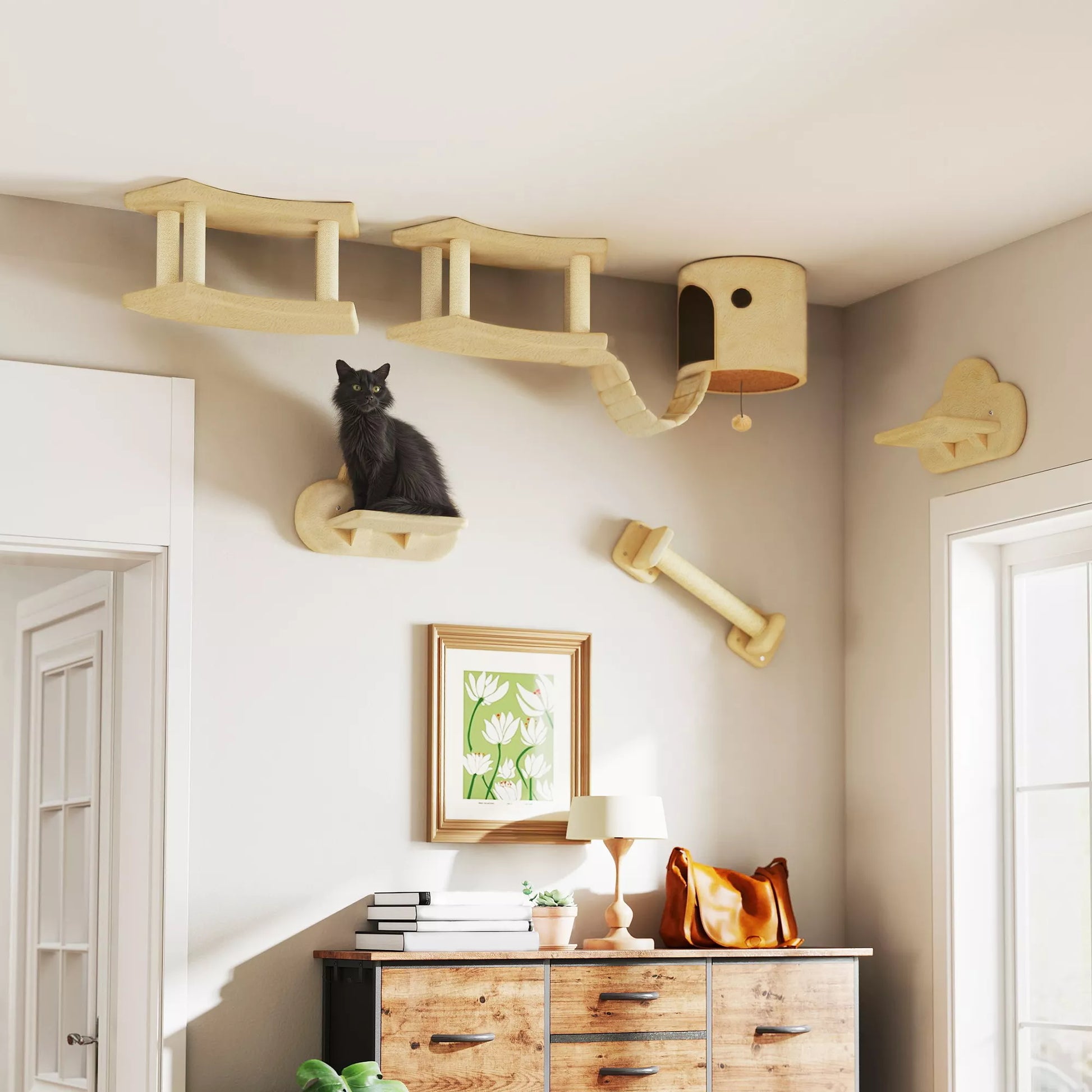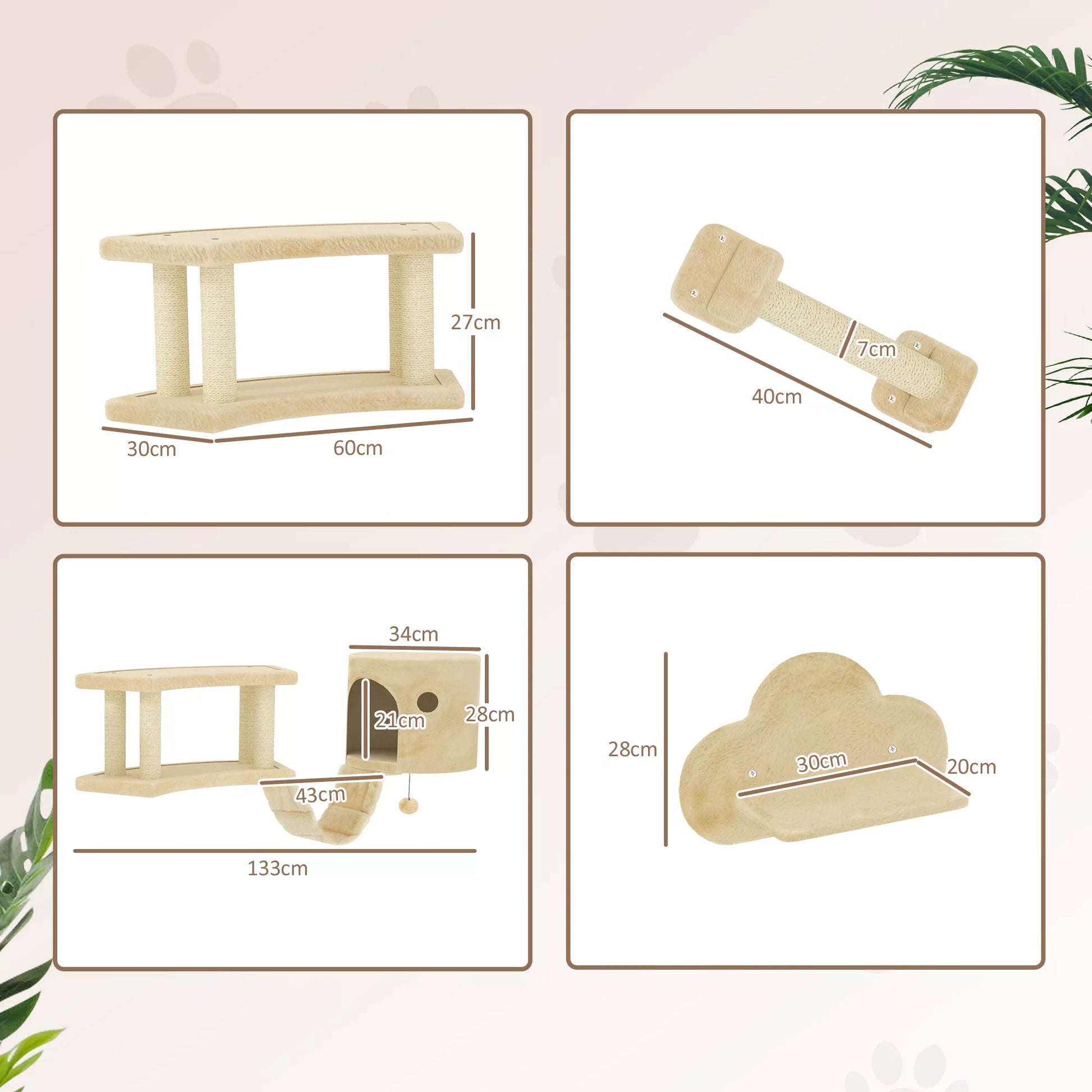 5 dalių kačių laipiojimo komplektas su draskomaisiais stulpais, šokinėjimo platformomis, kopėčiomis, nameliu, tvirtinimu prie sienos, smėlio spalvos