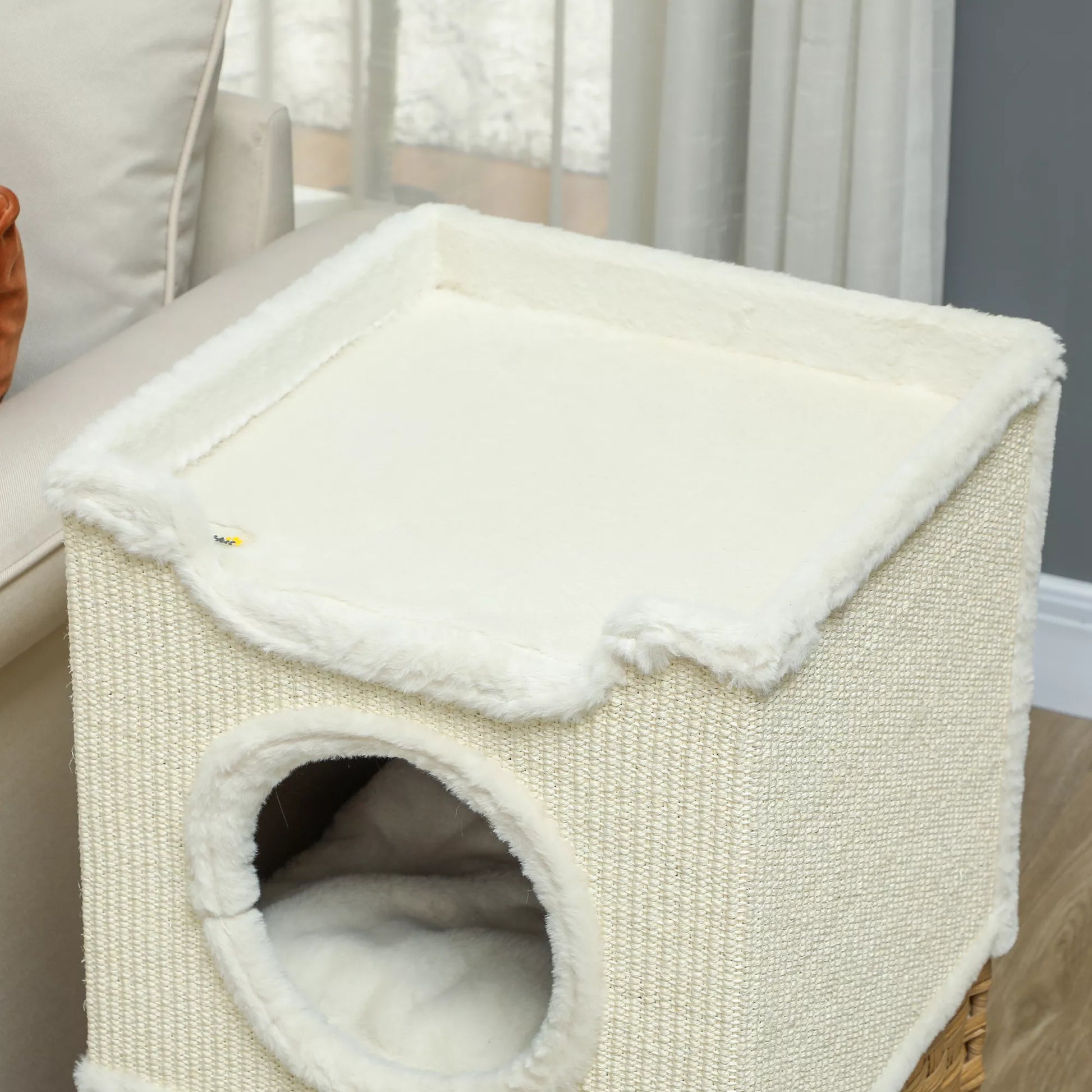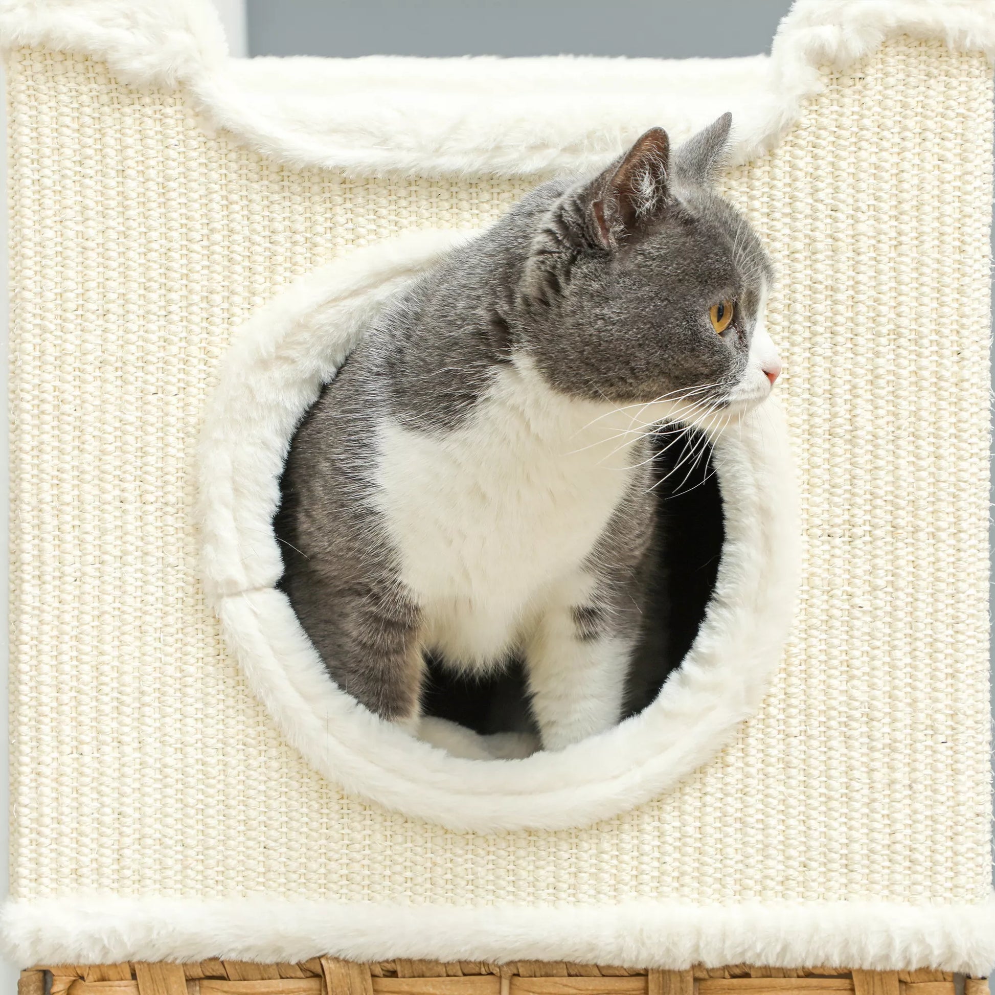 Atraskite kačių bokštelį: trijų lygių kačių rojus su dviem įėjimais, kad būtų lengva prieiti. Pagamintas iš medžio drožlių plokštės, triušio vilnos ir PE rotango, šis kačių bokštelis pasižymi tvirta konstrukcija su sizalio draskykle, kuri padeda šlifuoti nagus ir apsaugo jūsų baldus, bei puikiai dera prie jūsų interjero. Tai stilingi ir jaukūs namai jūsų brangiai katei!