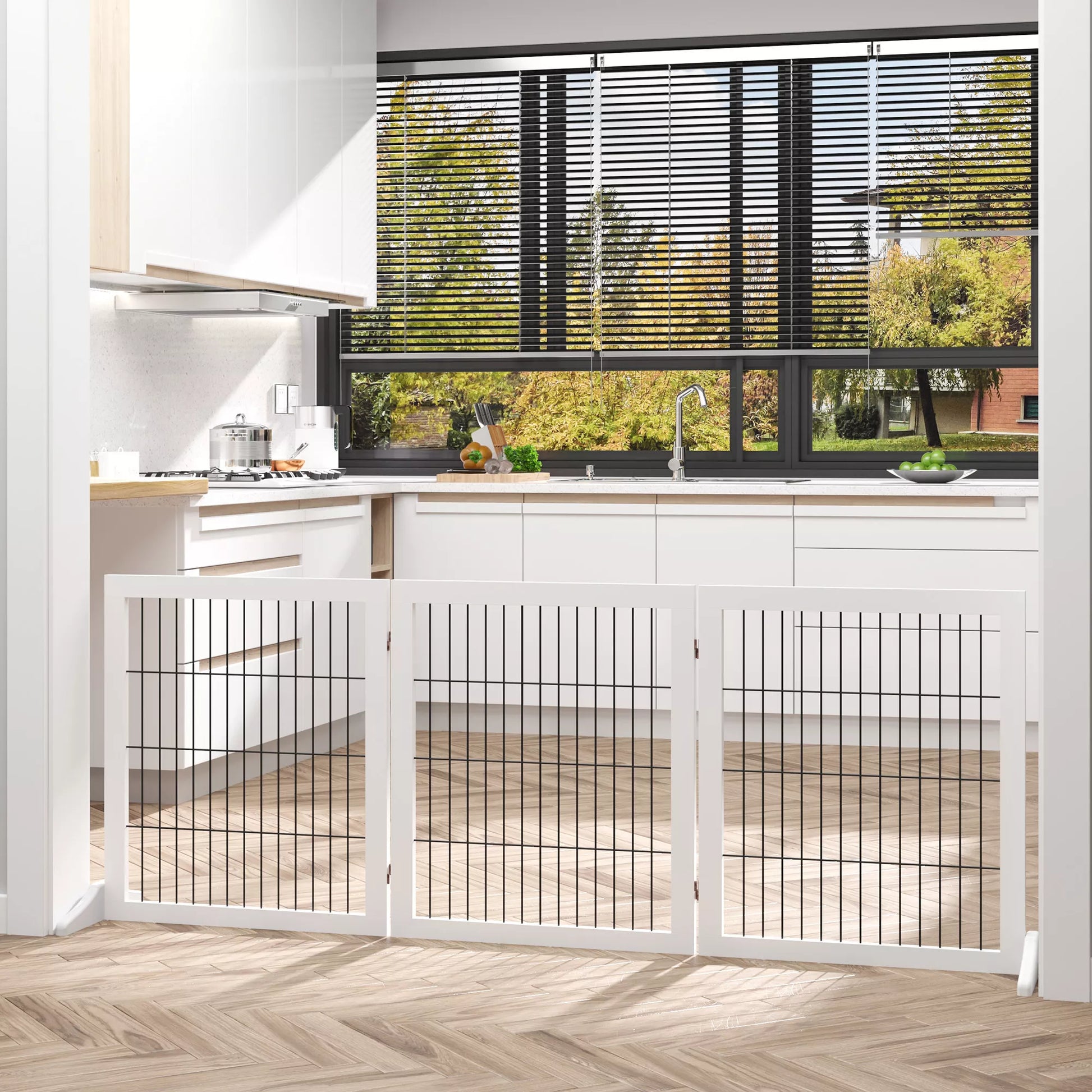 Apsauginiai varteliai gali saugiai ir efektyviai apriboti jūsų augintinio judėjimo erdvę. Trys masyvios medienos rėmo tvorelės, sujungtos vyriais, gali būti pasuktos įvairiais kampais. Jos tinka montuoti siauruose koridoriuose, laiptinėse ar erdviose patalpose. Kai jos nenaudojamos, jas galima lengvai sulankstyti ir jos užima labai mažai vietos.
