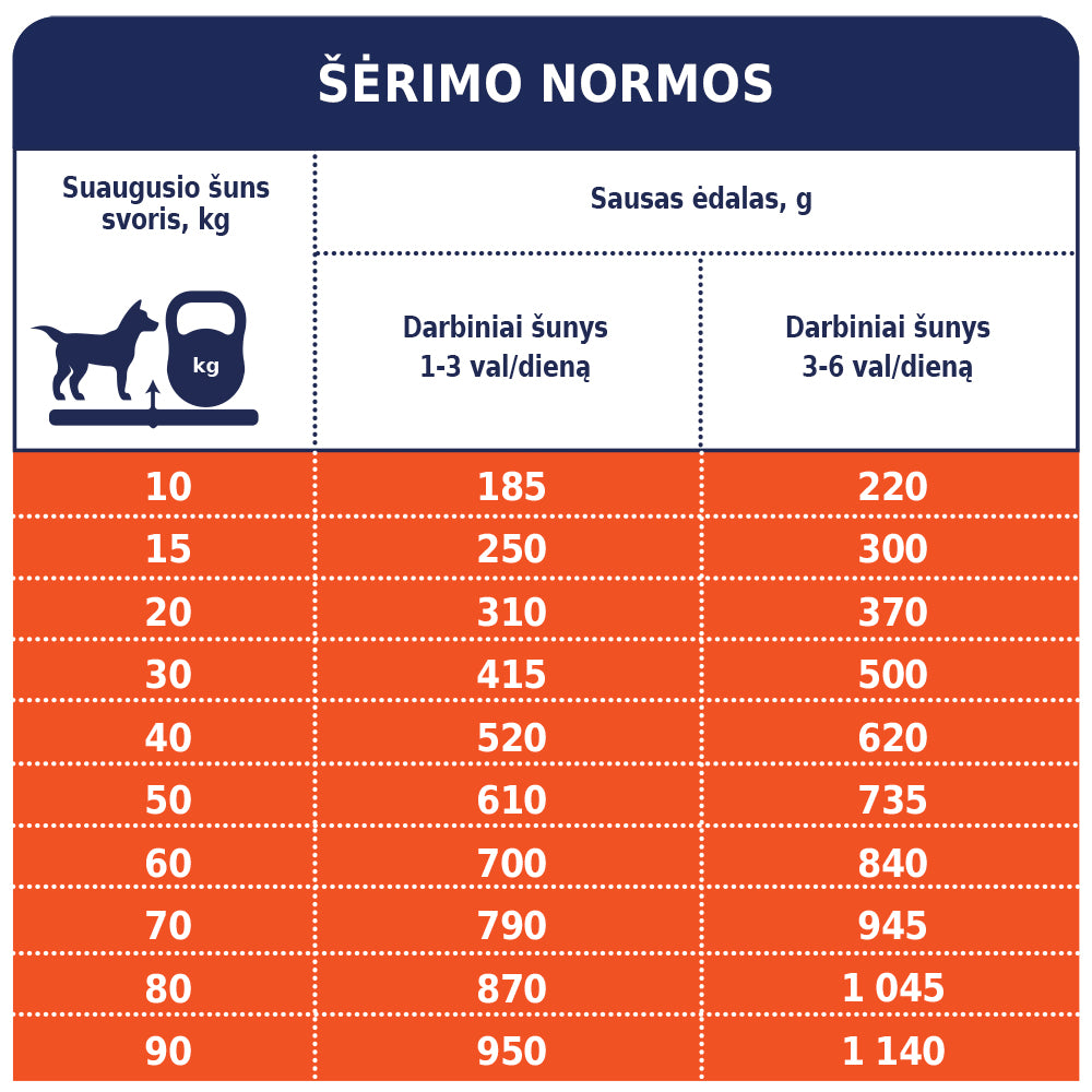 ANALITINĖS SUDEDAMOSIOS DALYS: žali baltymai 30 %, žali riebalai 15 %, žali pelenai 6,7 %, žalia ląsteliena 2,2 %, kalcis 1,4 %, fosforas 1,1 %, omega-3 riebalų rūgštys 0,36 %, omega-6 riebalų rūgštys 3,28 %.