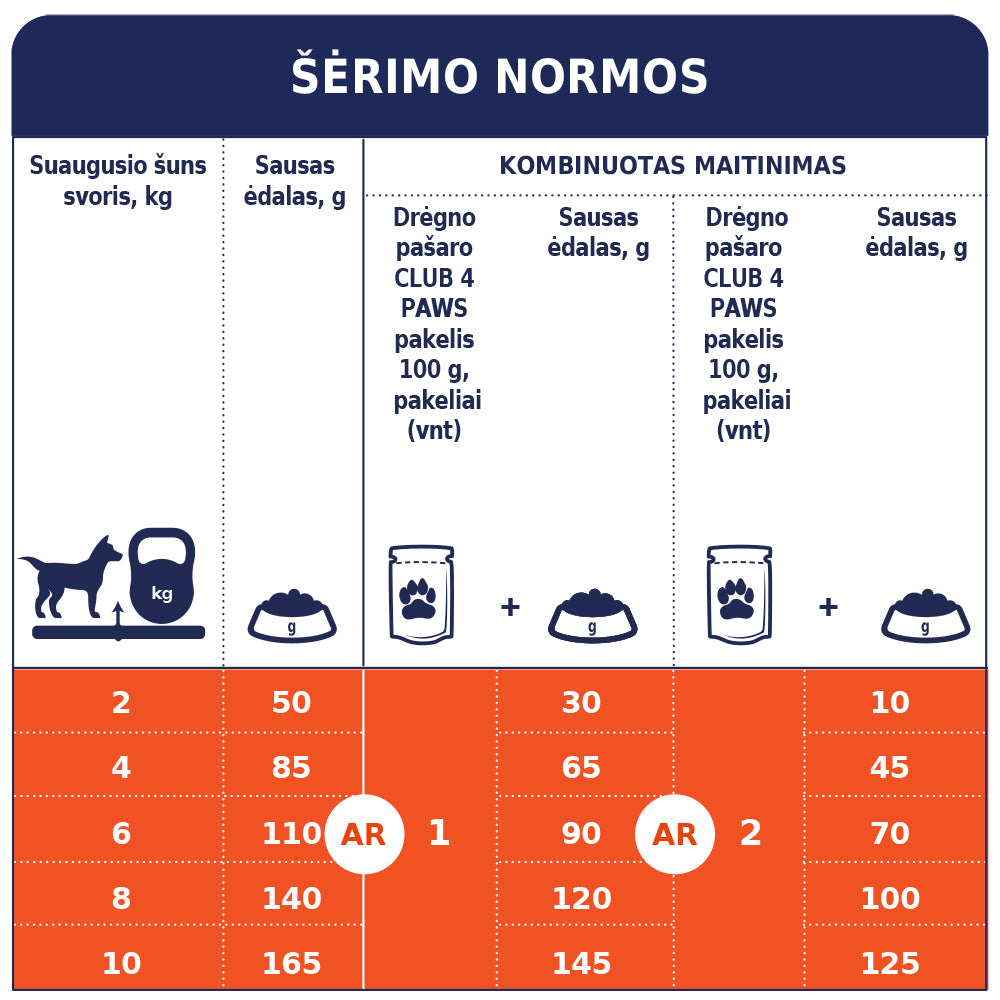 Laikyti vėsioje, sausoje ir apsaugotoje nuo tiesioginių saulės spindulių vietoje. Pašaras turėtų būti palaipsniui įvedamas į maitinimo racioną (bent jau pirmąsias 5 dienas). Užtikrinkite, kad gyvūnui būtų nuolat prieinamas švarus ir šviežias vanduo. Individualios šėrimo normos gali skirtis atsižvelgiant į amžių, veislę, aktyvumo lygį ir naminio gyvūnėlio buvimo aplinką. Derinkite šėrimą su visaverčiu konservuotu pašaru šunims CLUB 4 PAWS Premium “Su vištiena drebučiuose”. Pagaminimo data, “Geriausias iki”, partijos numeris nurodyti ant pakuotės.