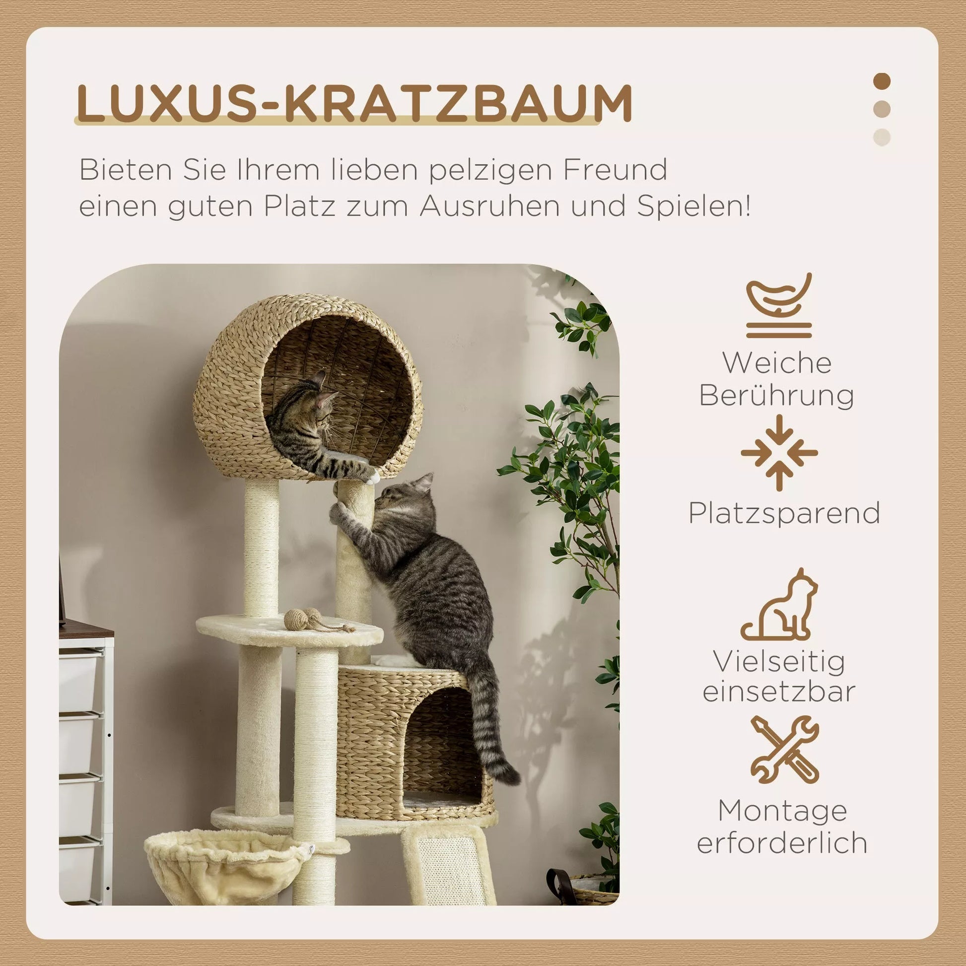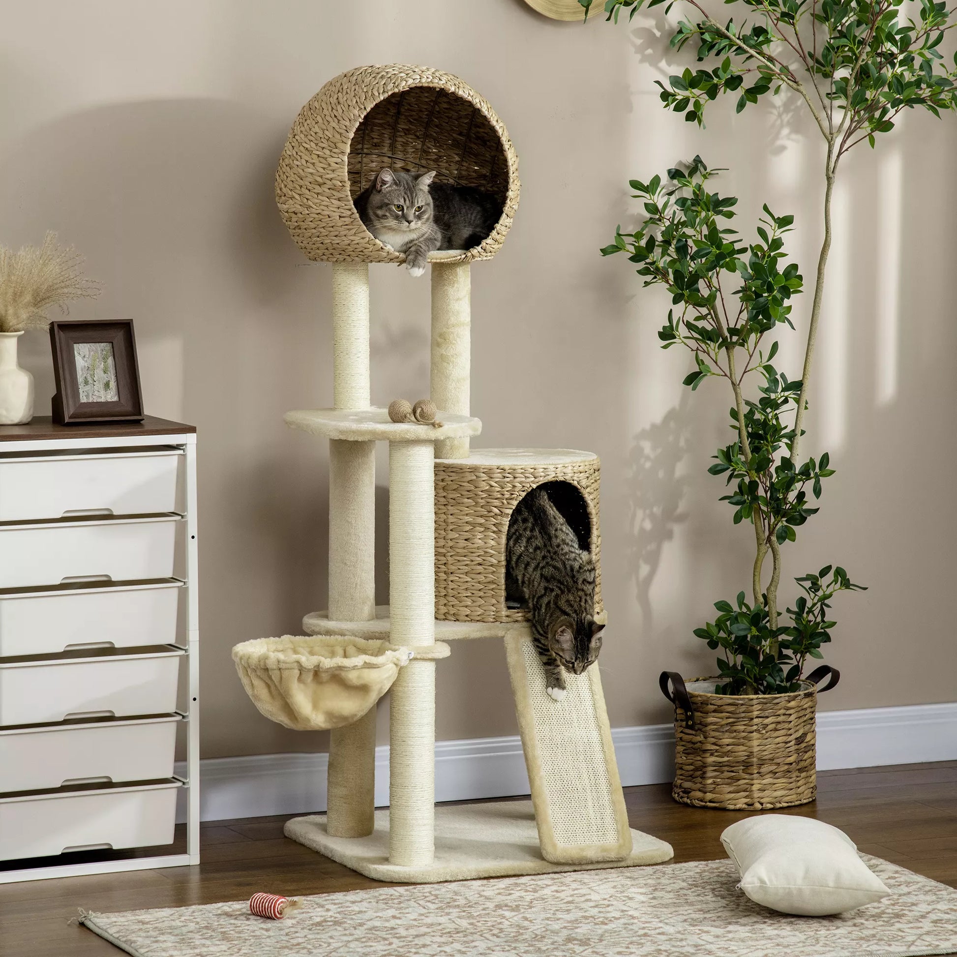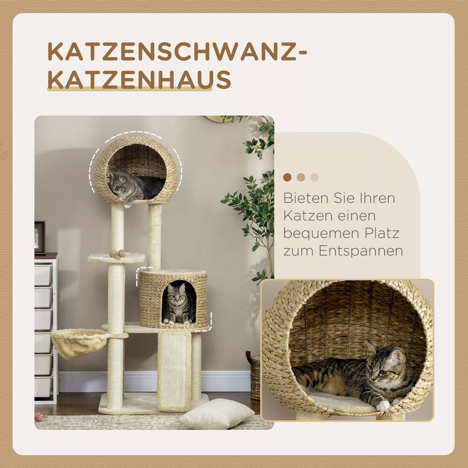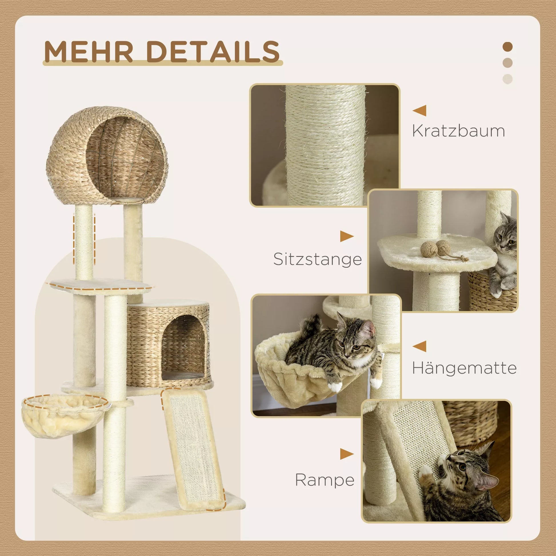 Draskykla su kačių nameliu, kelios platformos, hamakas, draskymo kilimėlis, apsauga nuo apvirtimo, smėlio spalvos, 60 x 60 x 150cm