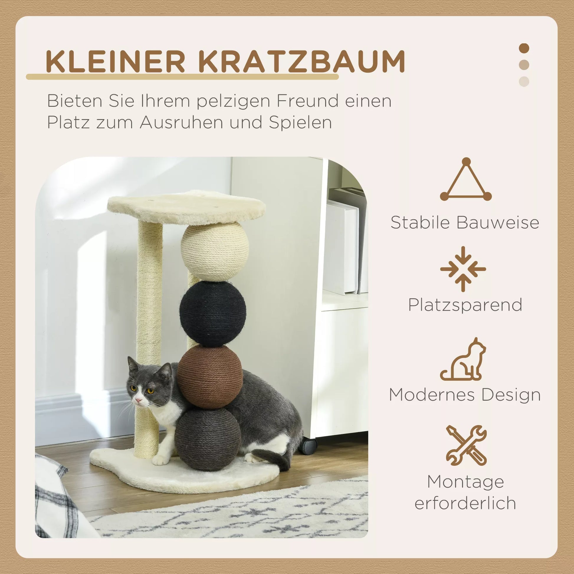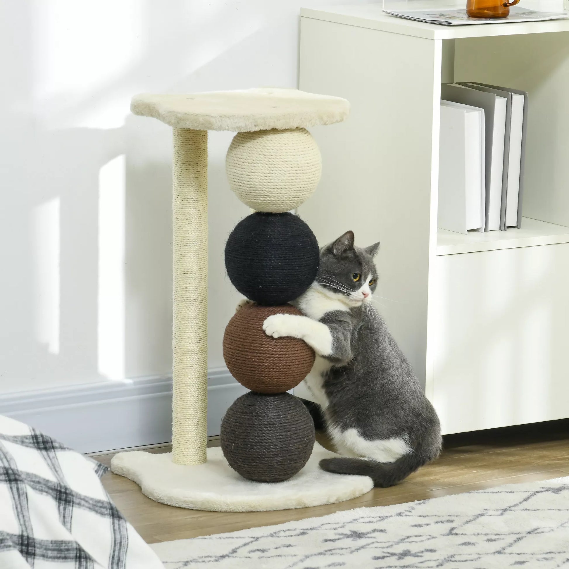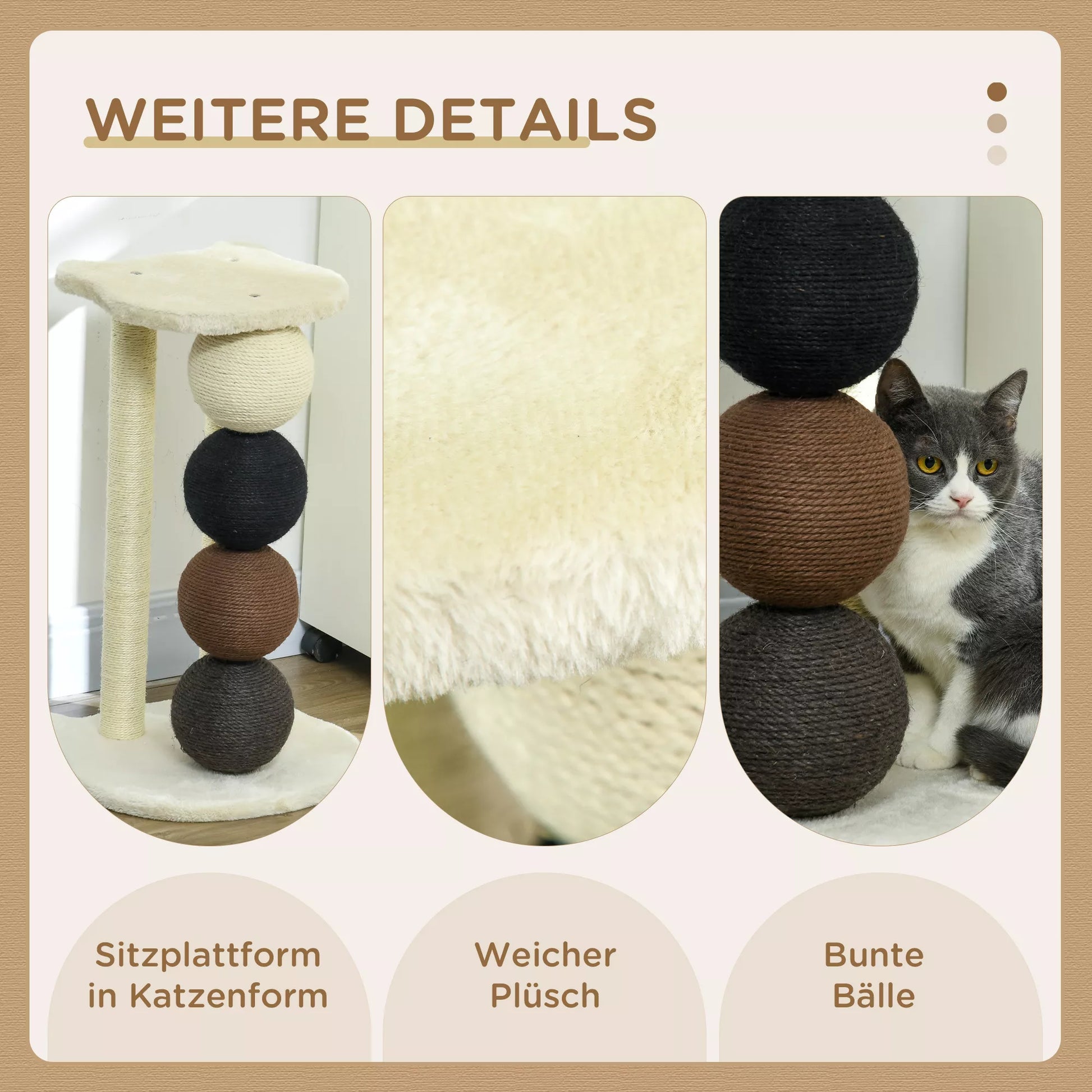 - ✔ Su 4 skirtingų spalvų kamuoliukais, kačių medis taip pat yra dekoratyvus priedas