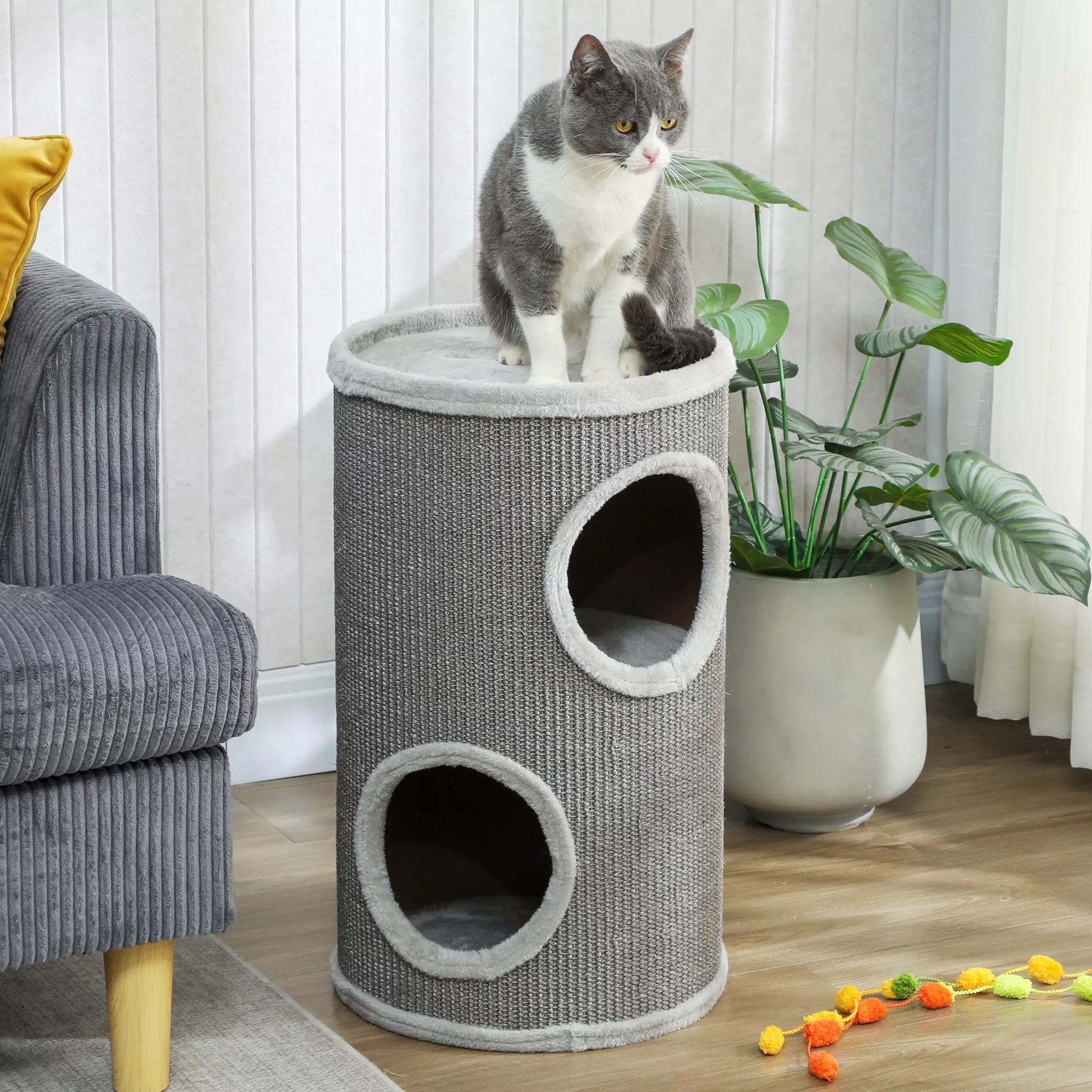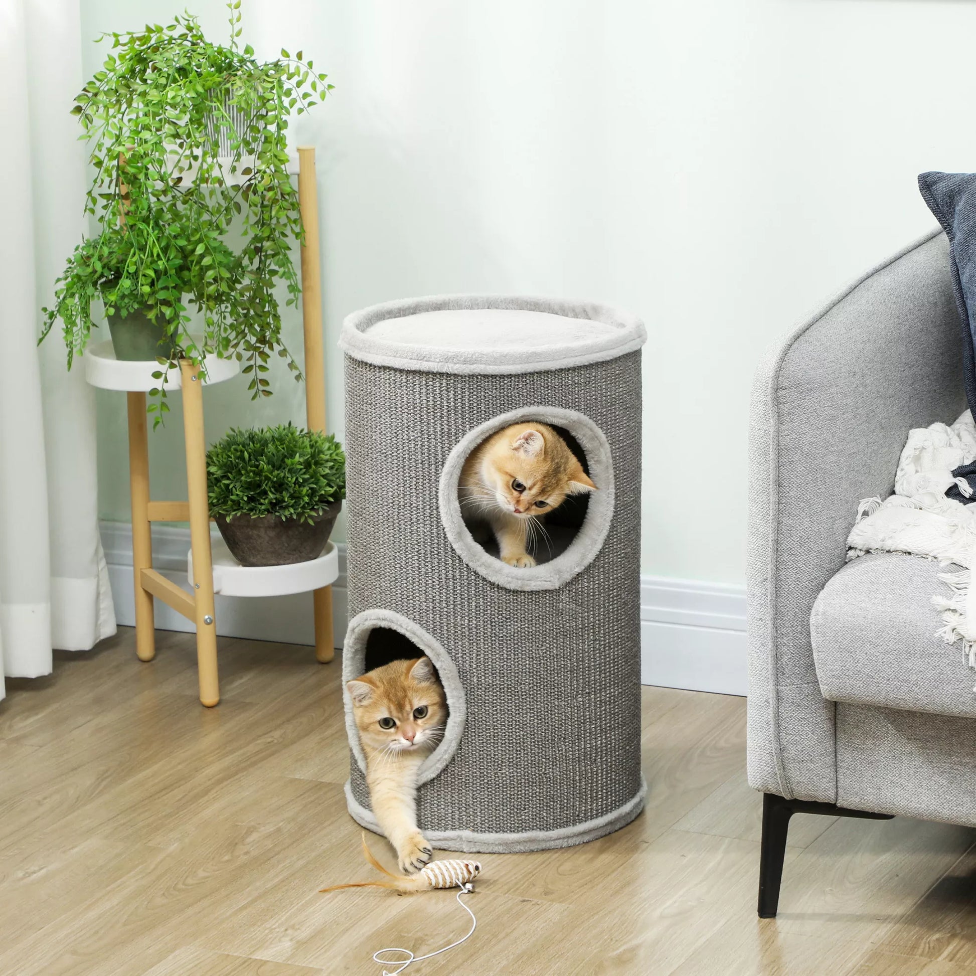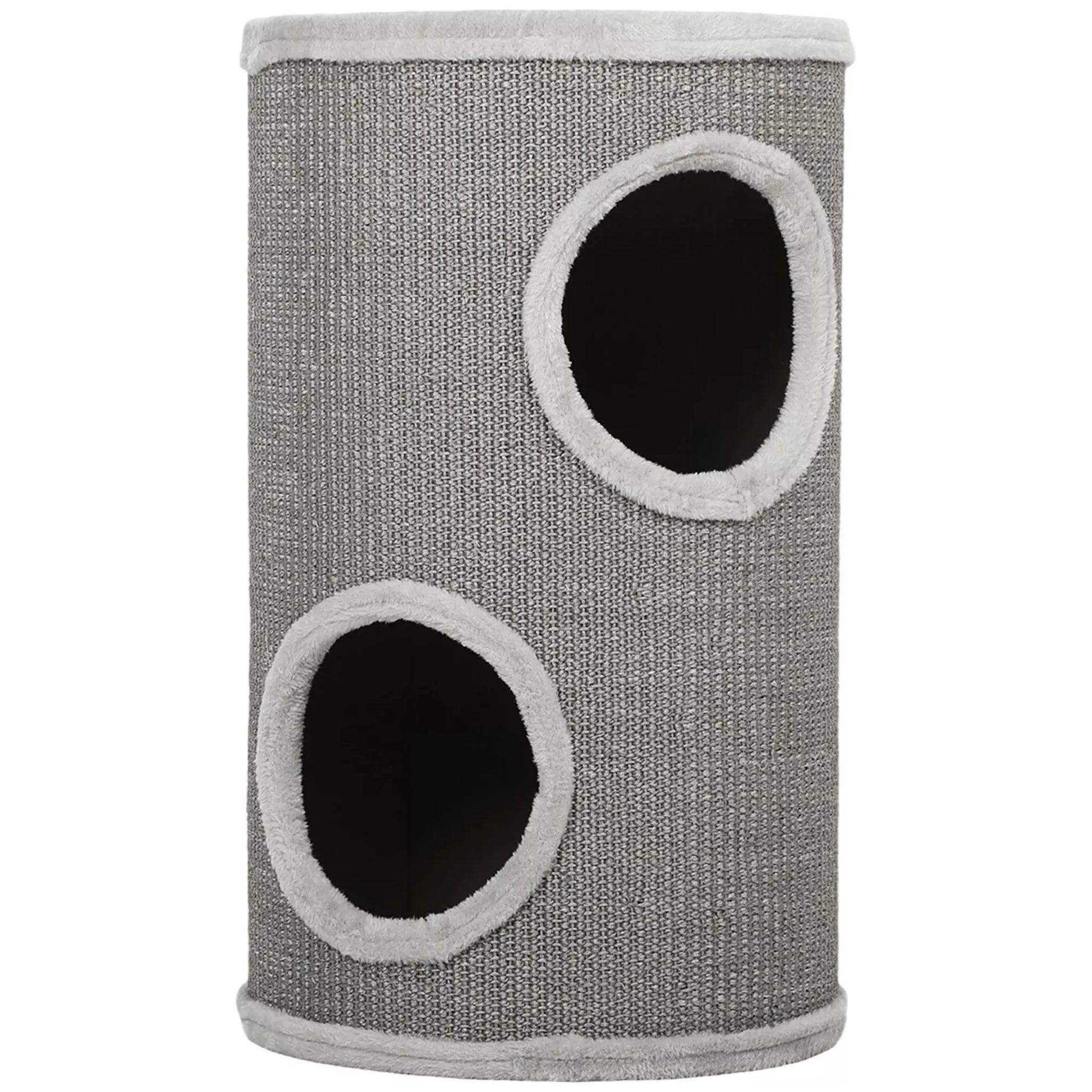 Dviaukštė draskyklė, 60 cm aukščio bokštas su 2 angomis ir pliušiniu kraštu, sizalis ir pliušas, 60x35x35 cm, šviesiai pilka