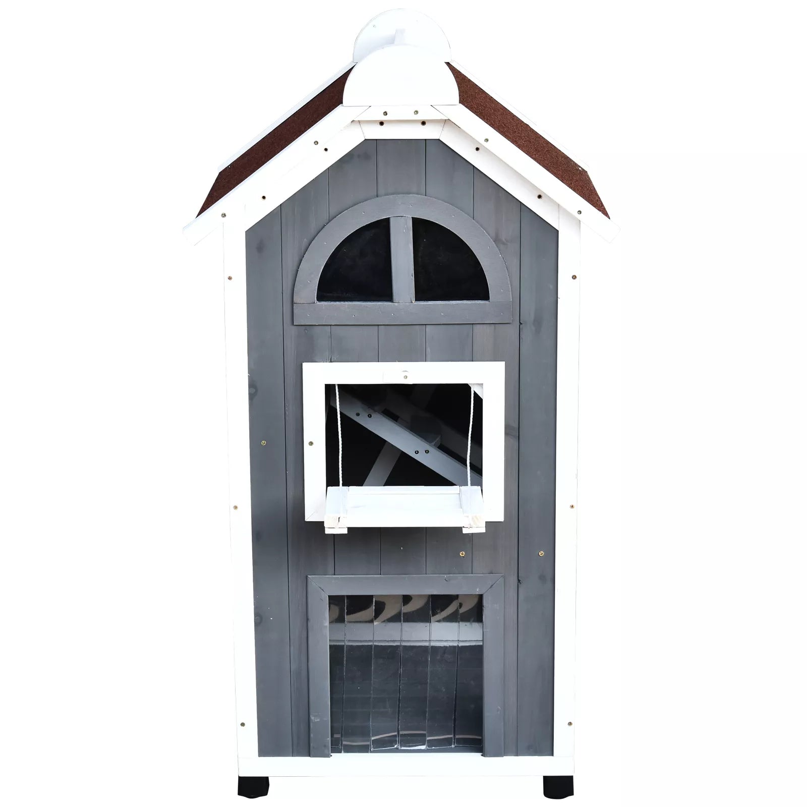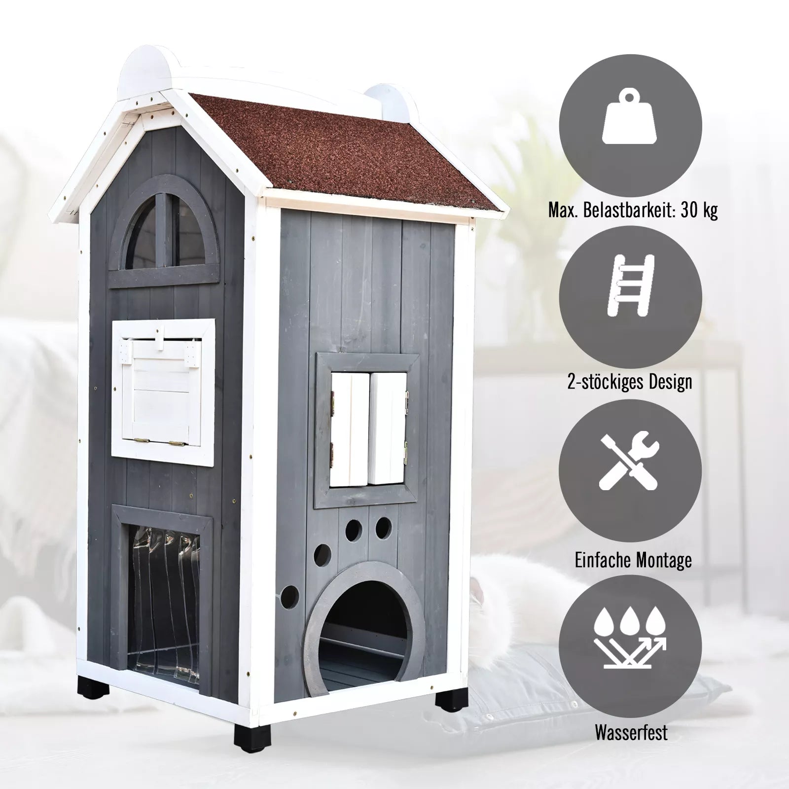 Daugiapakopis kačių namelis palieka jokių nepatenkintų pageidavimų: čia jūsų augintiniai gali žaisti, ilsėtis ir stebėti. Keli įėjimai, langas ir balkonas suteikia jiems gerus apžvalgos taškus, o viduje esanti hamakas kviečia miegoti. Kačių namelis pagamintas iš tvirto pušies medienos, padengtas asfalto danga ir atspariu oro sąlygoms dažymu. Taip jūsų augintiniai bus apsaugoti nuo oro poveikio net sode. Pasirūpinkite savo mažaisiais tigrais!