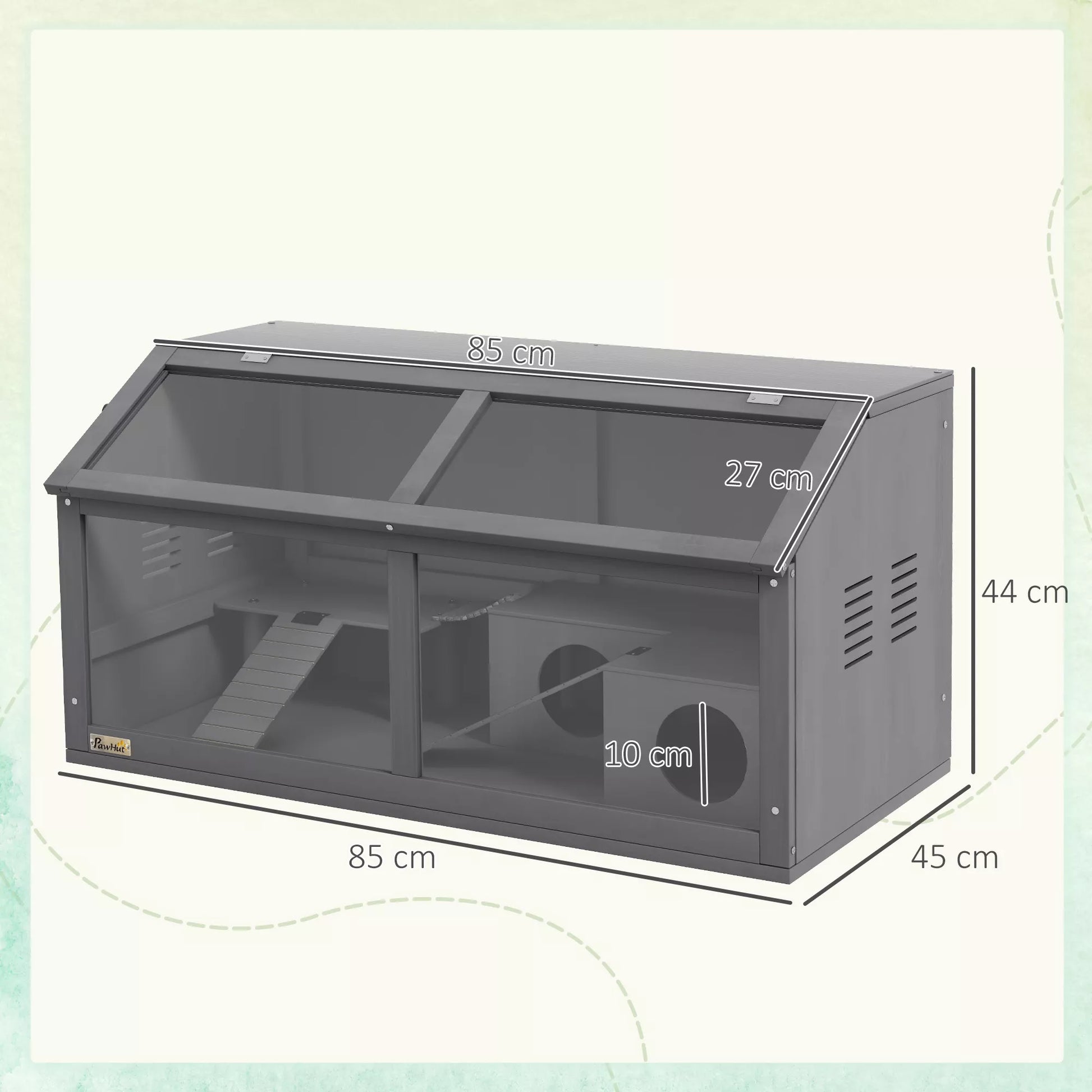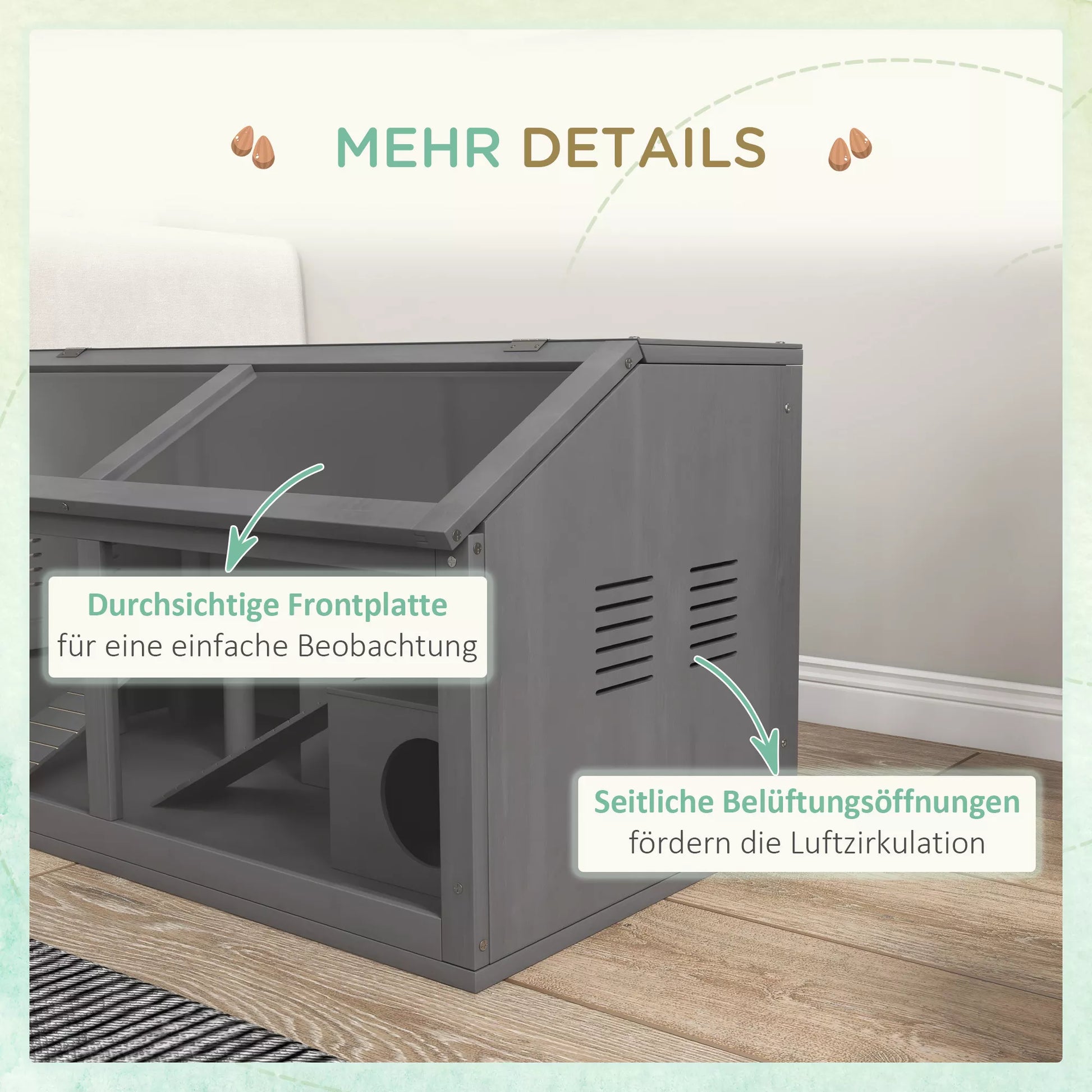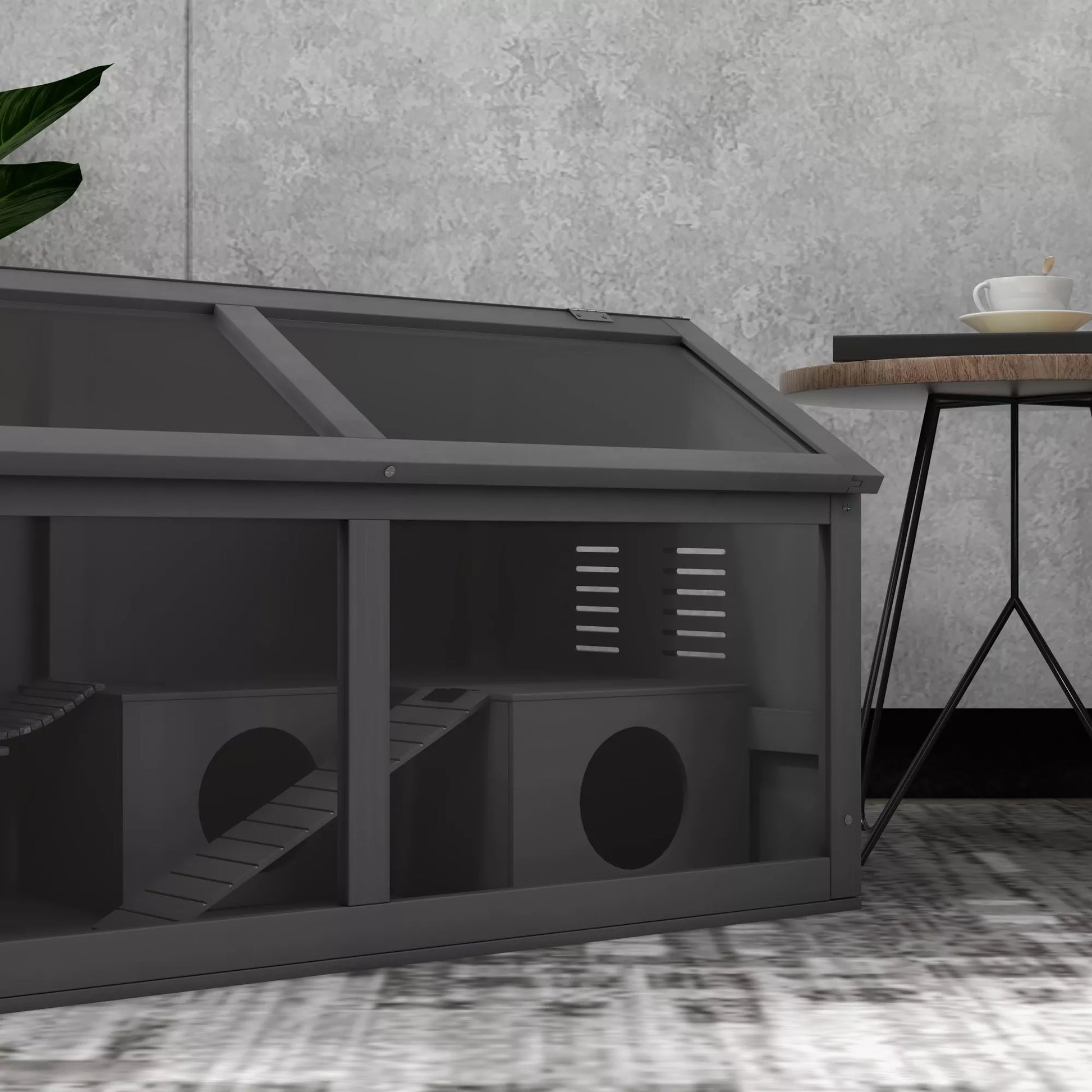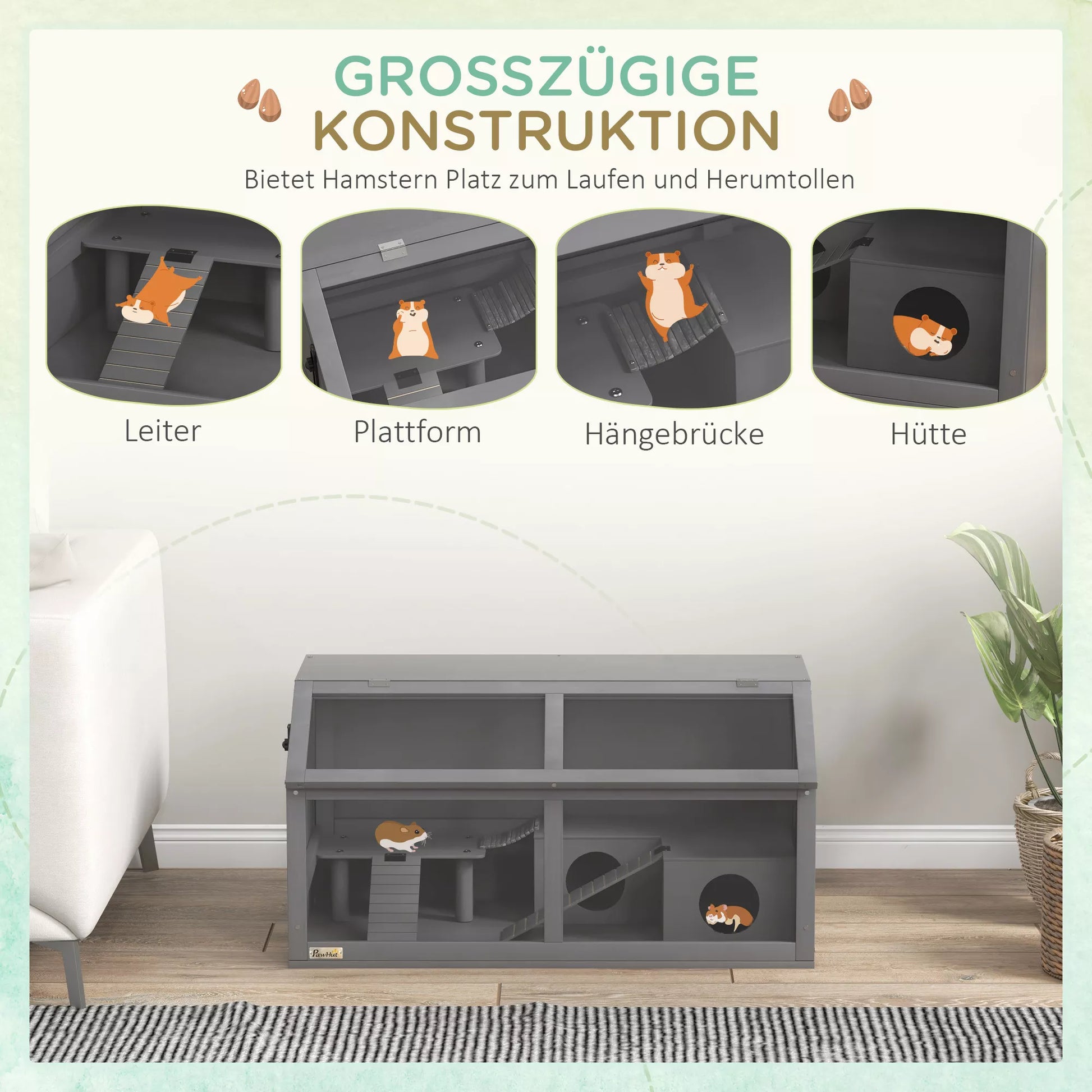 Hamsterių narvas, medinis smulkių gyvūnėlių narvas, kabantis tiltelis, laipteliai, namelis, 84 x 45 x 44 cm, smulkiesiems žiurkėnams, pilkos spalvos