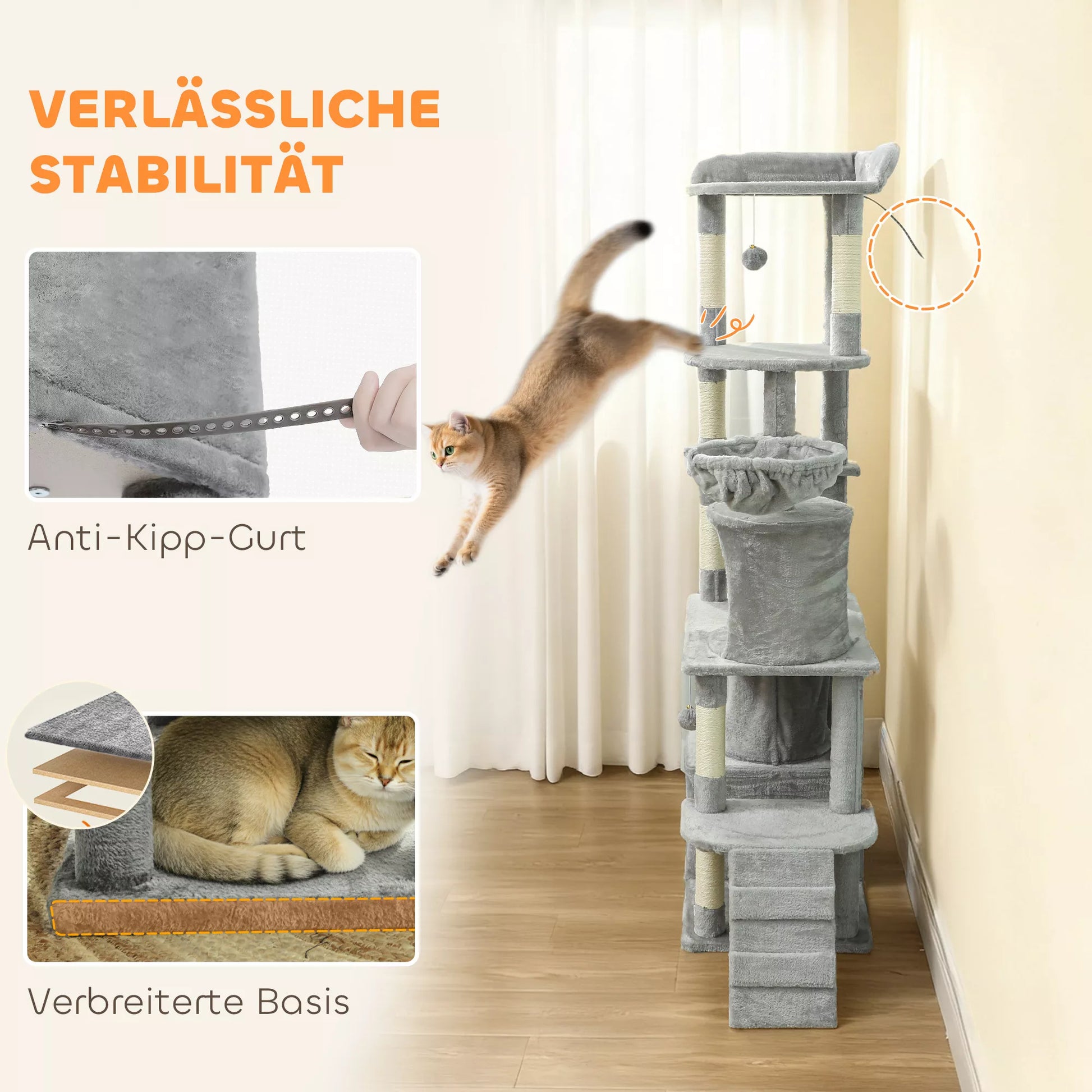 Kačių draskyklė, 170 cm, su tuneliu, nišomis, didele baze, sizaliniais stulpais, šviesiai pilka