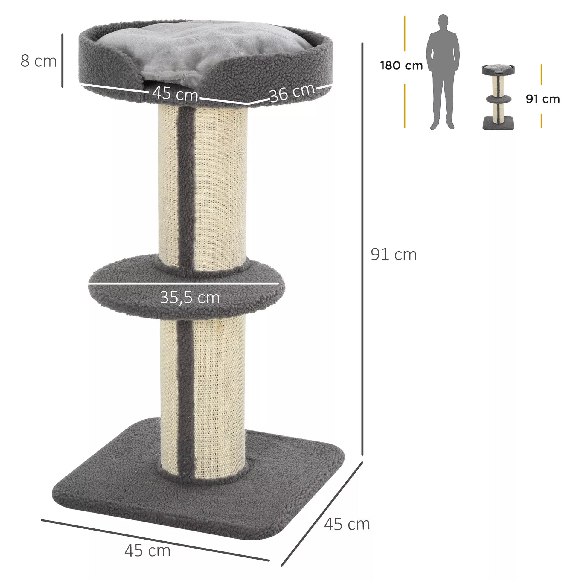Kačių draskyklė 91 cm su sizaliniais stiebais, platforma, pagalvėlėmis – daugiaaukštis kačių bokštas, laipiojimo medis vidutinio dydžio katėms, pilkos spalvos