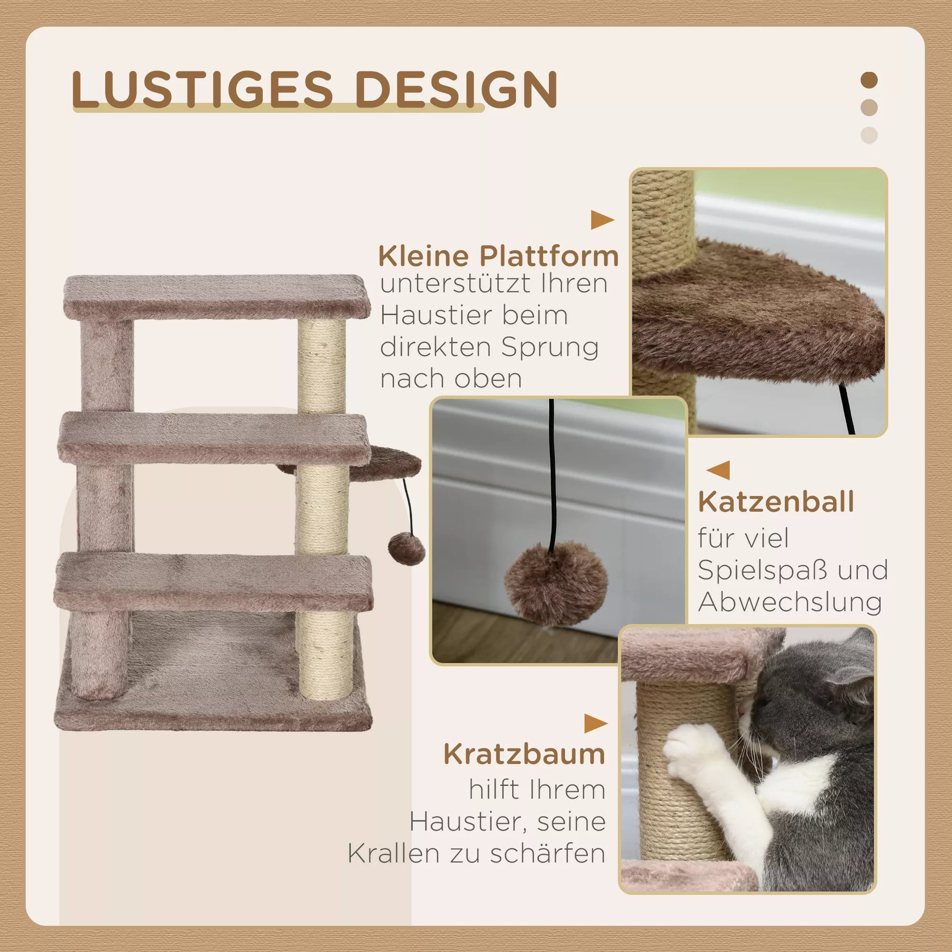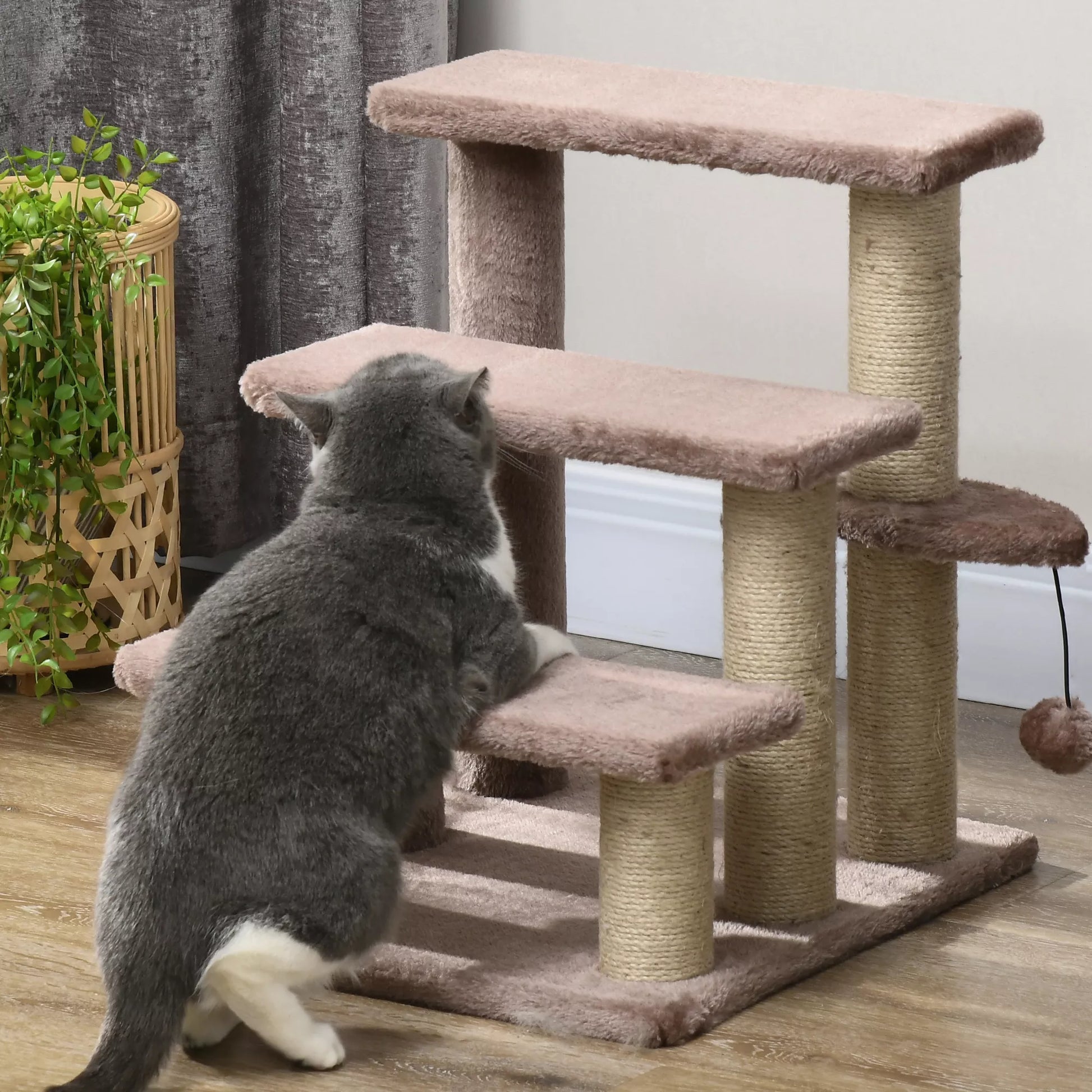 Kačių draskyklė, augintinio laipteliai, 3 pakopos, žaidimo kamuoliukas, iki 5 kg, 45x40x48cm, ruda