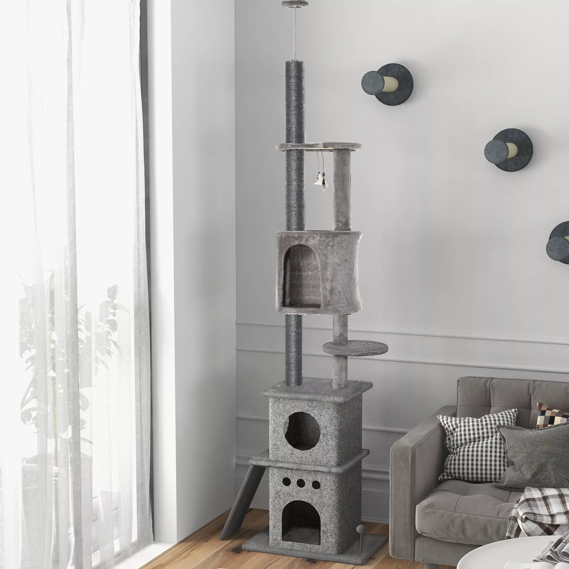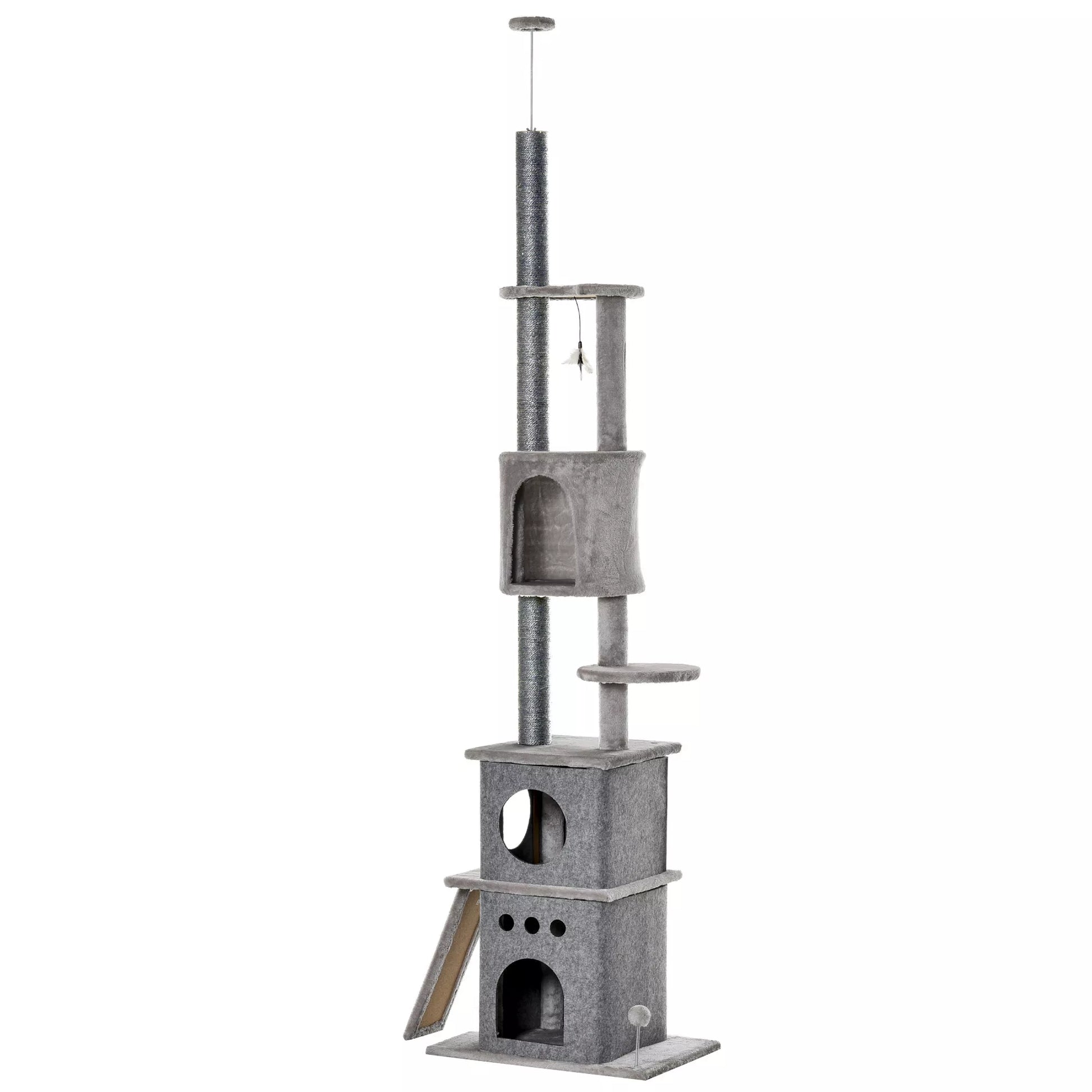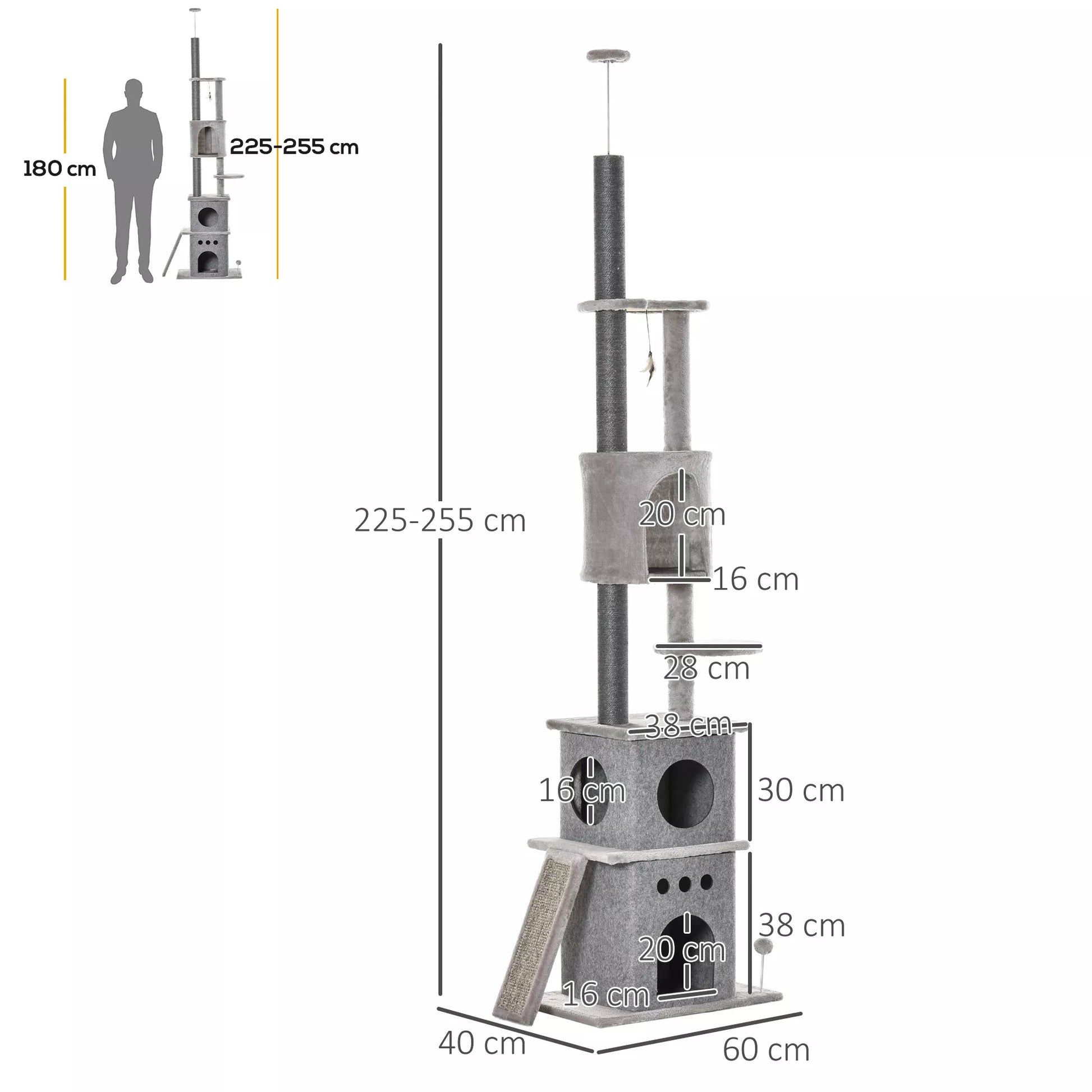 Kačių draskyklė, iki lubų, su žaislais, sizalis, pliušas, šviesiai pilka, reguliuojamo aukščio, 60 x 40 x 225-255 cm