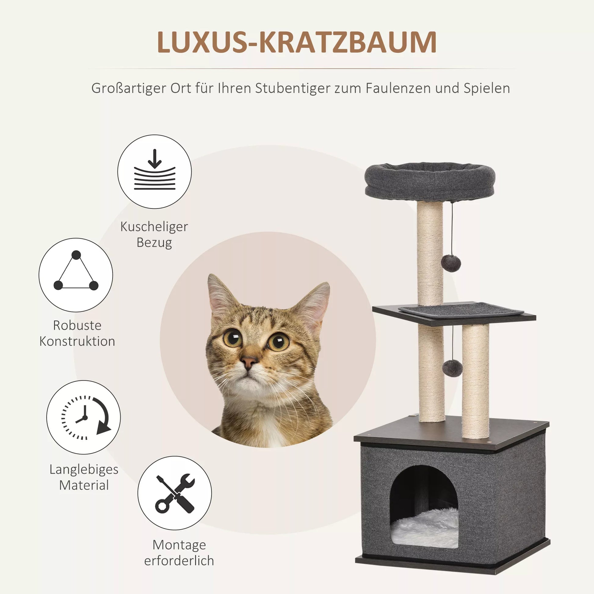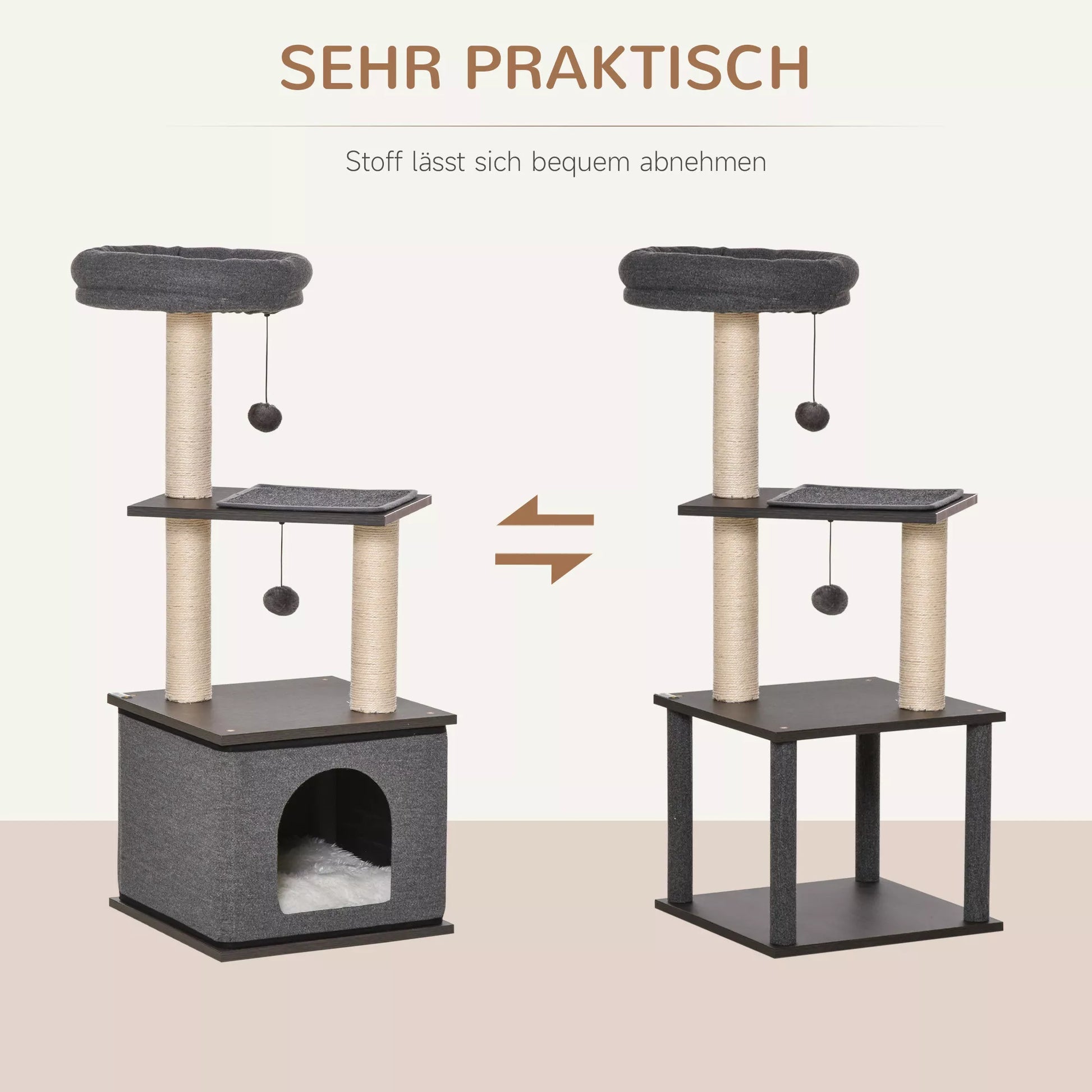 Kačių draskyklė, kačių žaislas, laipiojimo medis, žaidimo galimybės, žaidimų sizalis, sizalinė virvė, MDP plokštė, tamsiai pilkos spalvos, 40 x 40 x 104 cm
