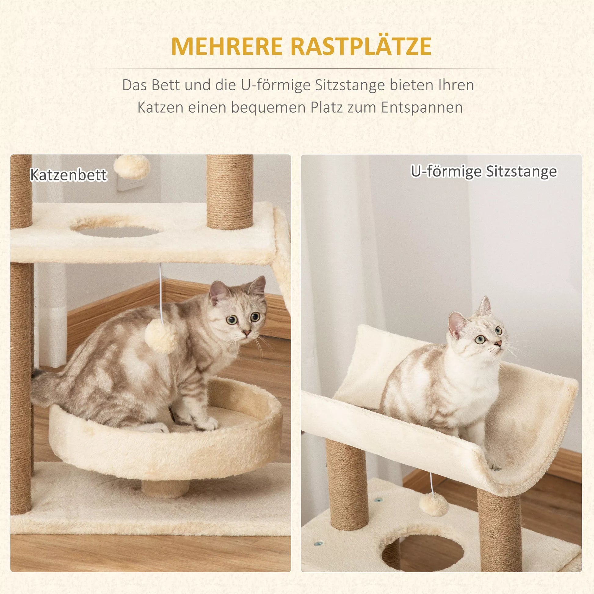 Kačių draskyklė-namelis, su žaislu ir kačių guoliu, 60 cm x 30 cm x 76 cm, kremas + natūralios spalvos