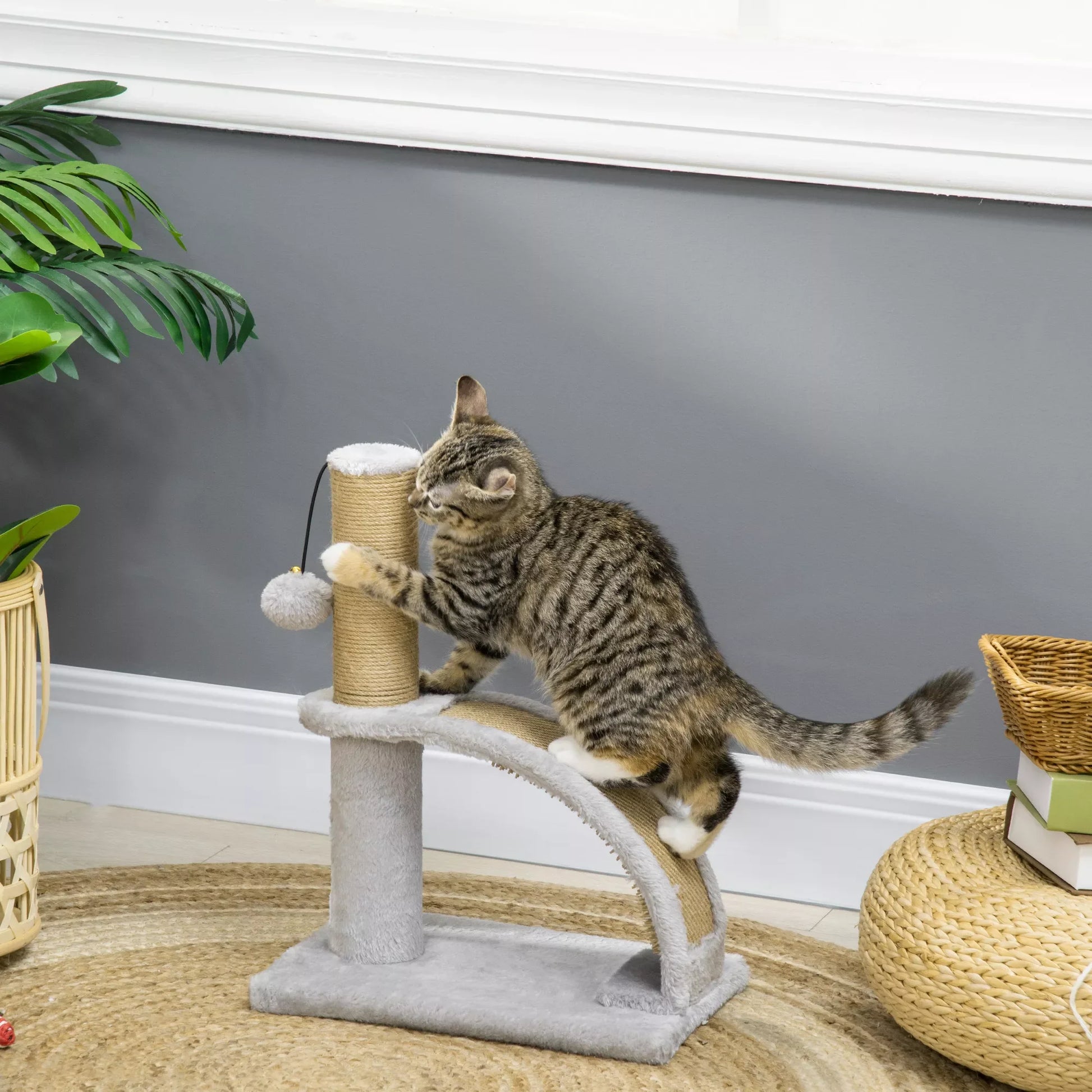 Kačių draskyklė su džiuto apmušalu, kabantis kamuoliukas su varpeliu, draskymo lenta, 34 ilgis x 24 plotis x 43 aukštis cm, pilka