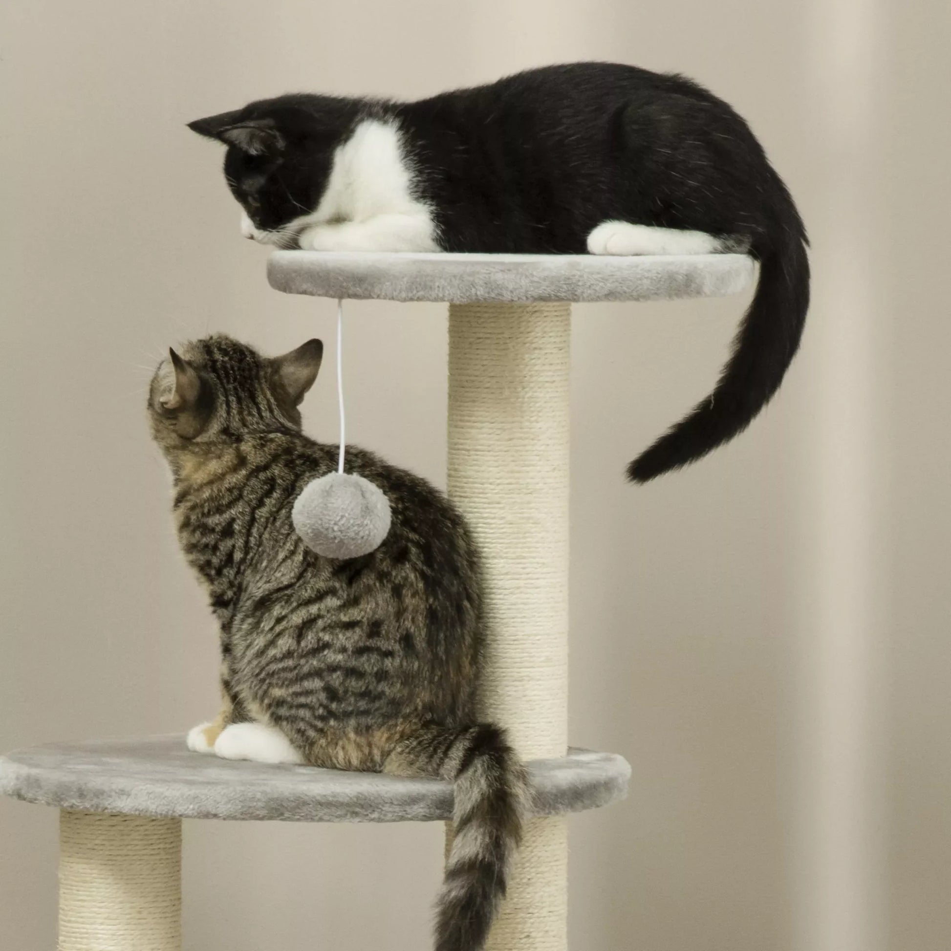 Kačių mėgstamiausios veiklos – draskymas ir miegas. Šis modernus draskymo medis suteikia dvi patogias poilsio vietas, keturias šokinėjimo platformas, daugybę stulpų ir kamuoliukų nagams galąsti bei pakabinamą kamuoliuką žaidimams. Tvirtos konstrukcijos dėka jūsų pūkuotas draugas šiuo daugiafunkciu laipiojimo bokštu galės džiaugtis daugelį metų. Apsaugokite savo baldus ir nudžiuginkite savo katytę su vienu draskymo, laipiojimo medžiu ir kačių guoliu.