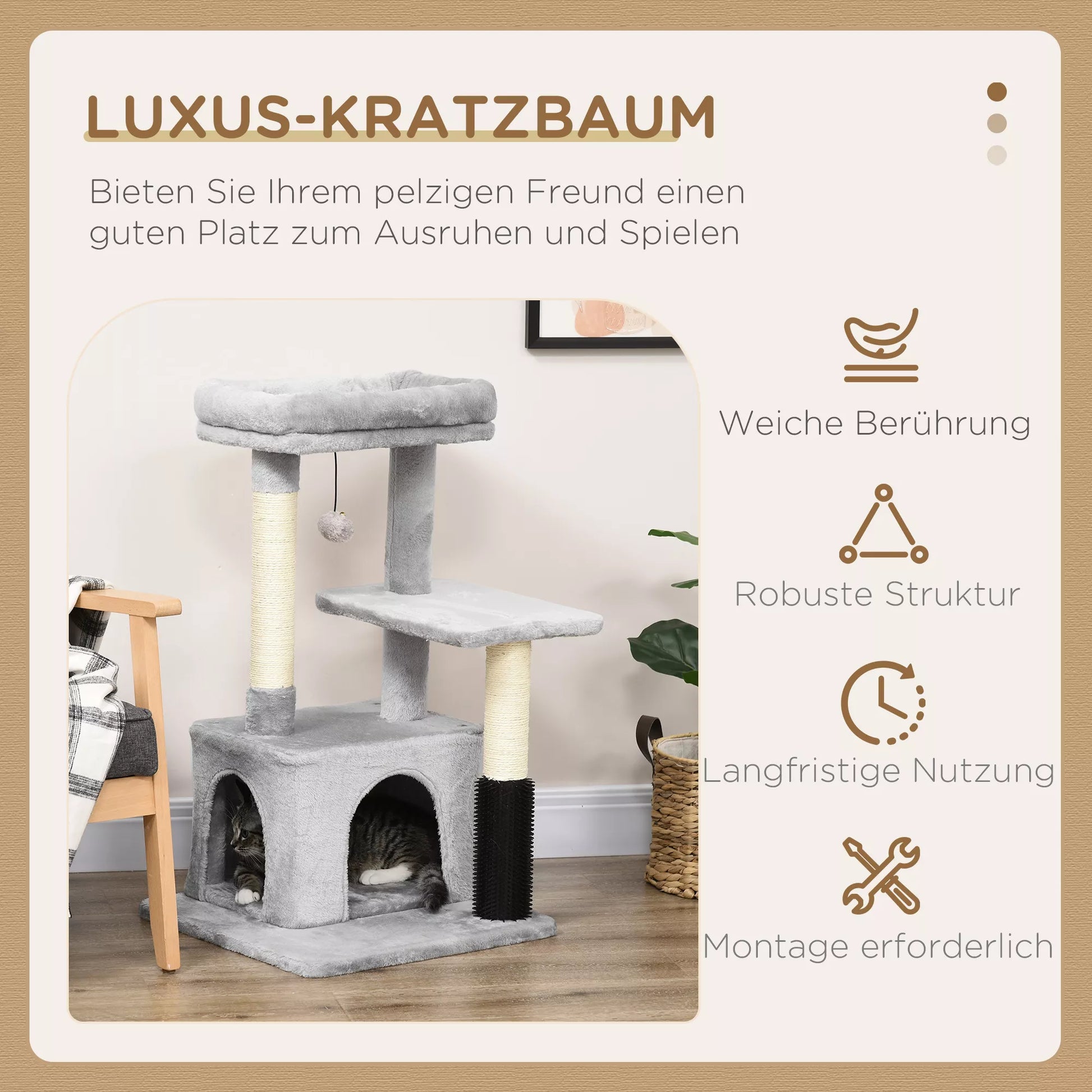 Kačių draskyklė su masažo kampeliu, katės guoliu, žaidimo kamuoliuku, sizalinio lyno stulpeliais, šviesiai pilka, 48 x 48 x 85 cm