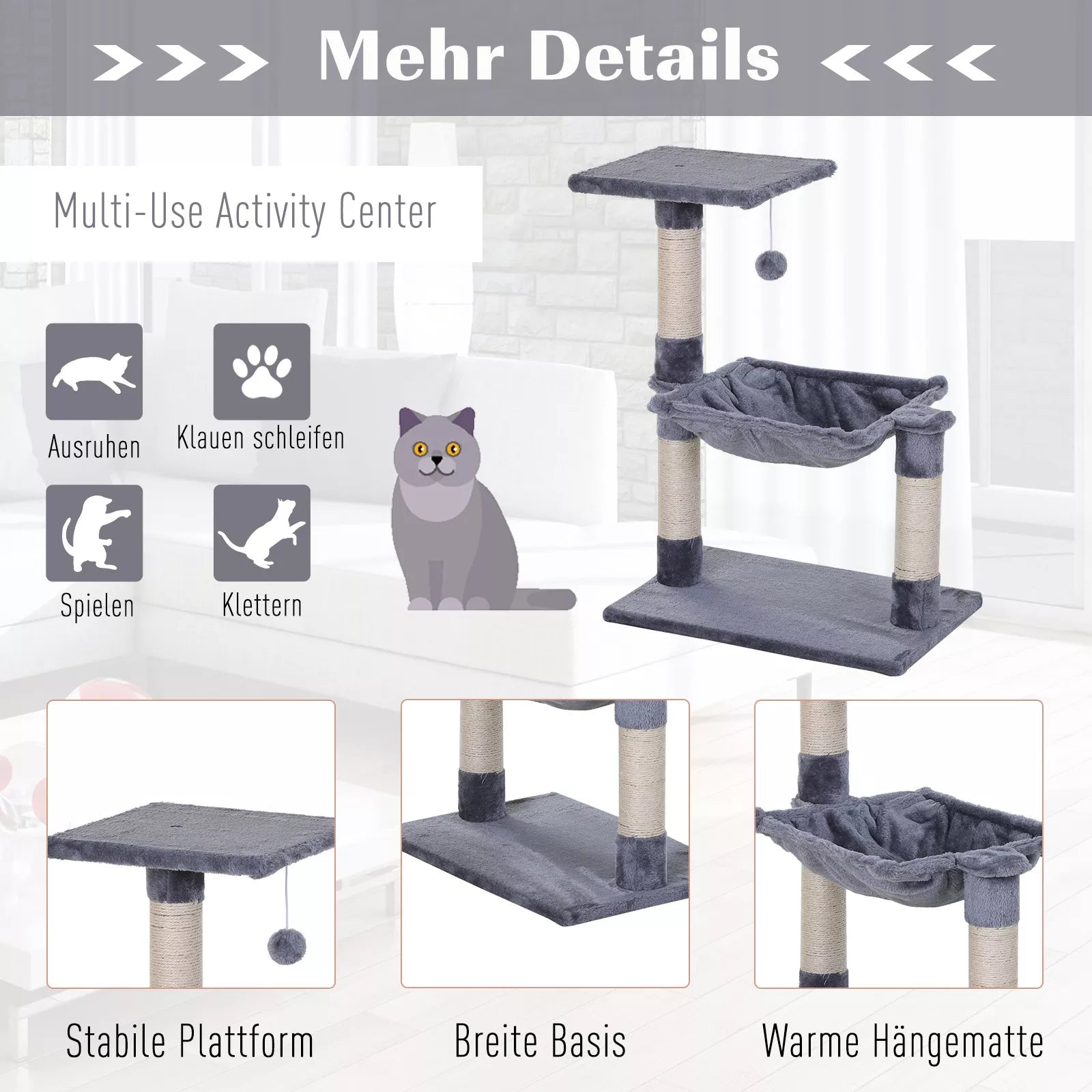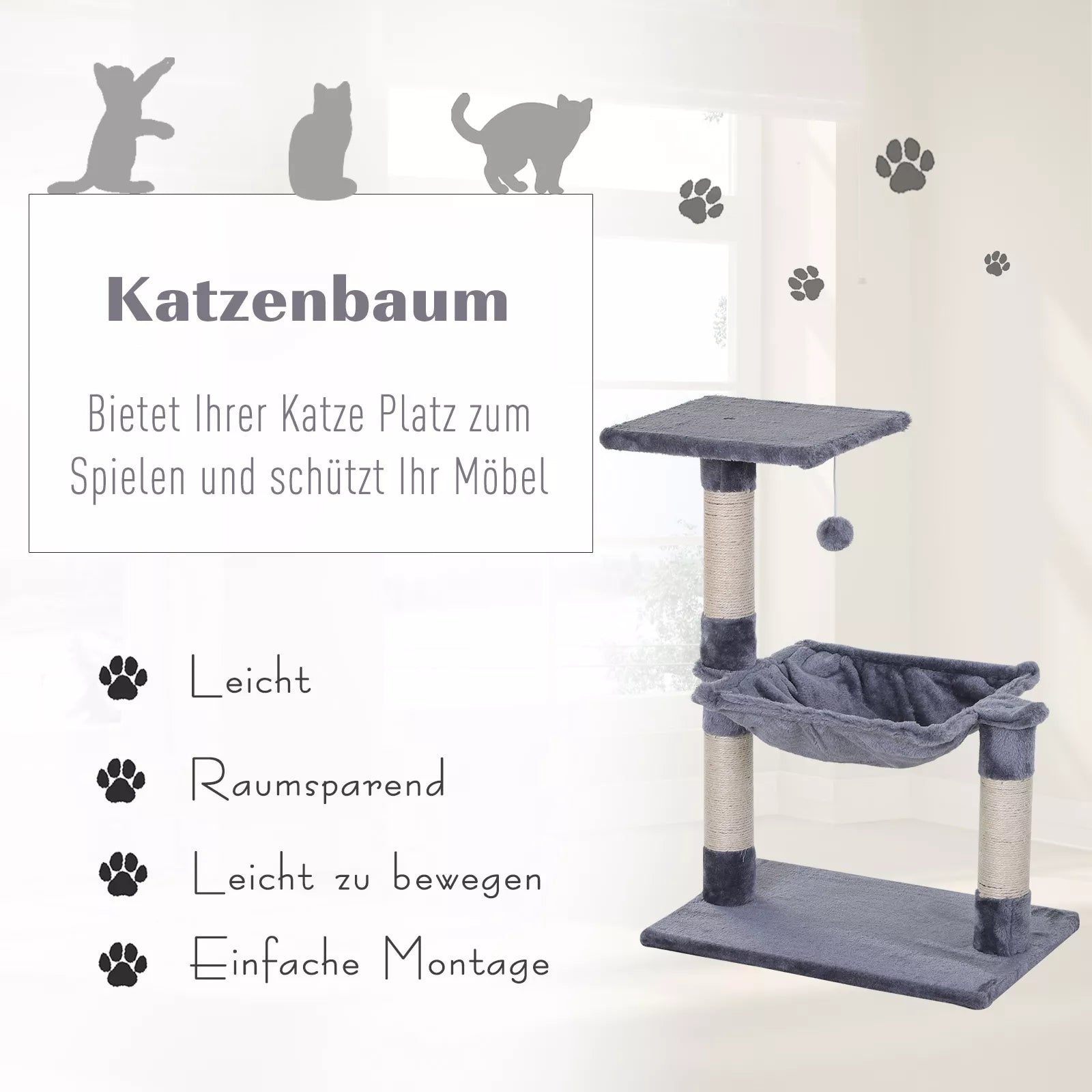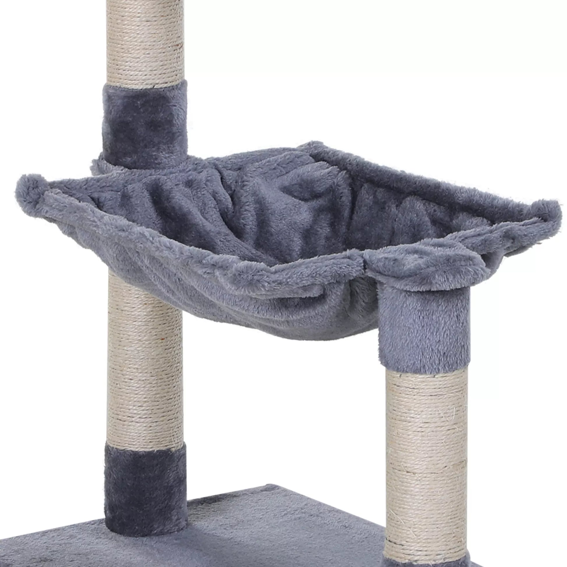 Kačių draskyklė su sizalio stulpu, pliušine hamaka, medžio drožlių plokštė, pilka, 50 x 36 x 70 cm