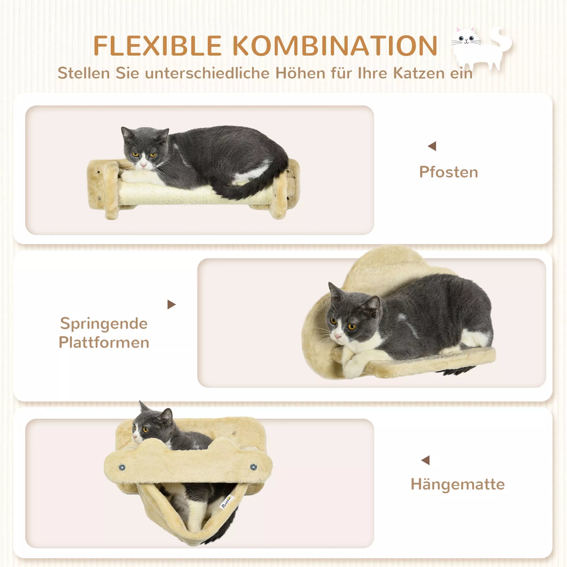 Su šiais katės laipiojimo baldais jūsų namų tigras įgys gražią, aukštą vietelę žaisti ir ilsėtis. Šį laipiojimo baldų komplektą sudaro hamakas snaudimui, du draskyklės stiebai, skirti nagams galąsti ir atitraukti gyvūnėlius nuo jūsų baldų, bei dvi platformos. Komplektas tinka ir mažesniems kambariams, nes neužima grindų ploto: tiesiog pritvirtinkite jį prie sienos ir stebėkitės, kaip greitai jūsų katė čia jausis kaip namie.