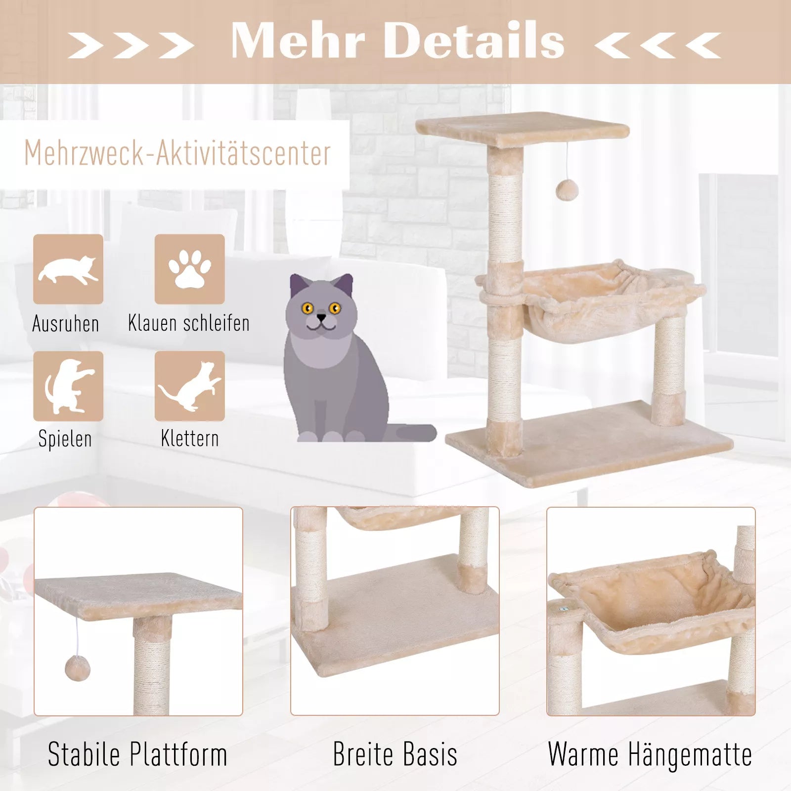 Kačių medis / braižymo medis su sisalio stulpeliu, pliušiniu hamaku, medžio drožlių plokšte, smėlio spalvos, 50 x 36 x 70 cm