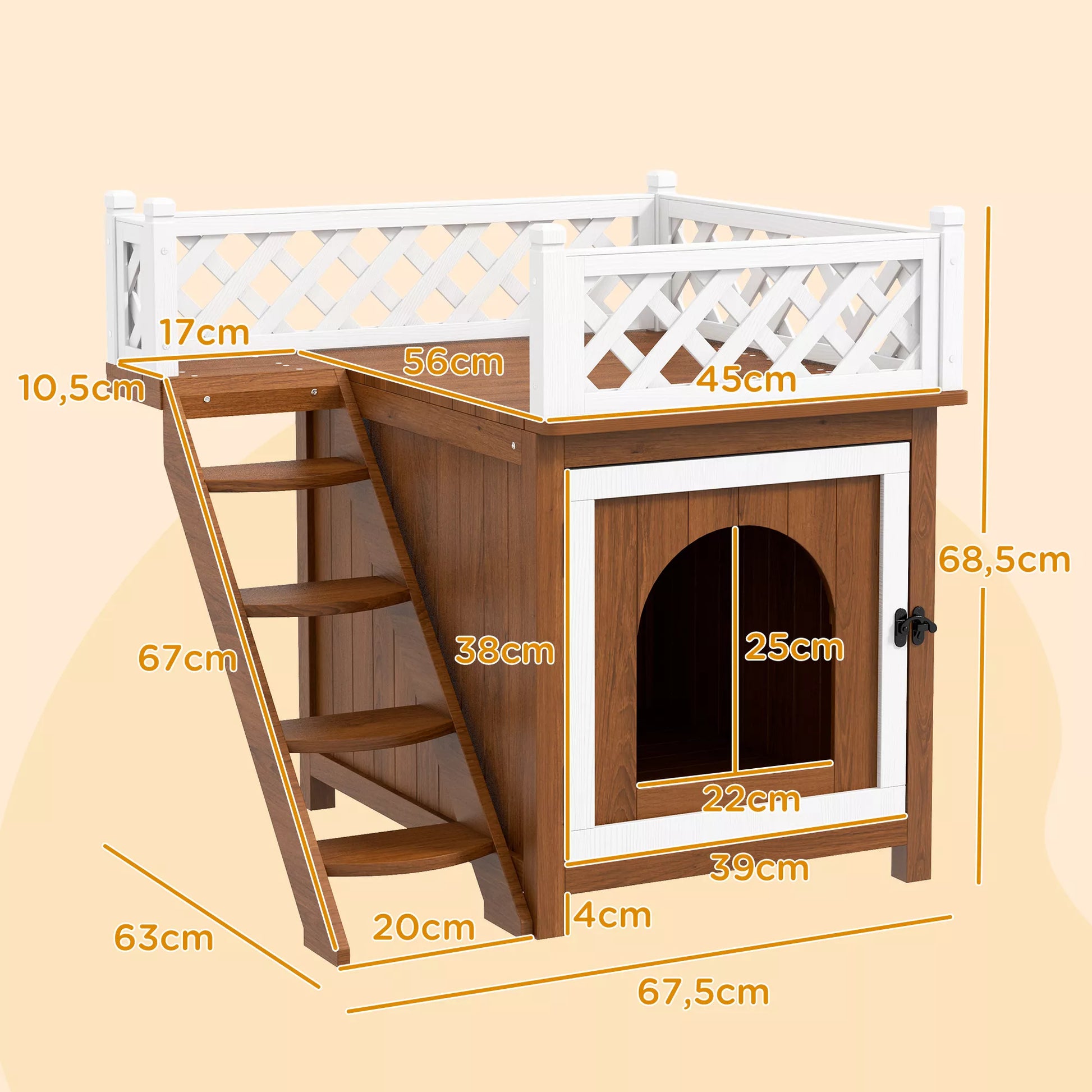 Atraskite žavingą kačių namelį: Jaukus, dviejų aukštų namelis, kur jūsų katė gali atsipalaiduoti balkone viršuje arba pasitraukti į apsaugotą erdvę apačioje. Šis smulkių gyvūnų namelis turi laiptus, leidžiančius lengvai užlipti, ir paaukštintą dizainą papildomam jaukumui. Ši universali lauko kačių būda taip pat gali tarnauti kaip nepastebima vieta kačių tualetui, pagaminta iš natūralios eglės medienos ir tinka naudoti tiek viduje, tiek lauke.