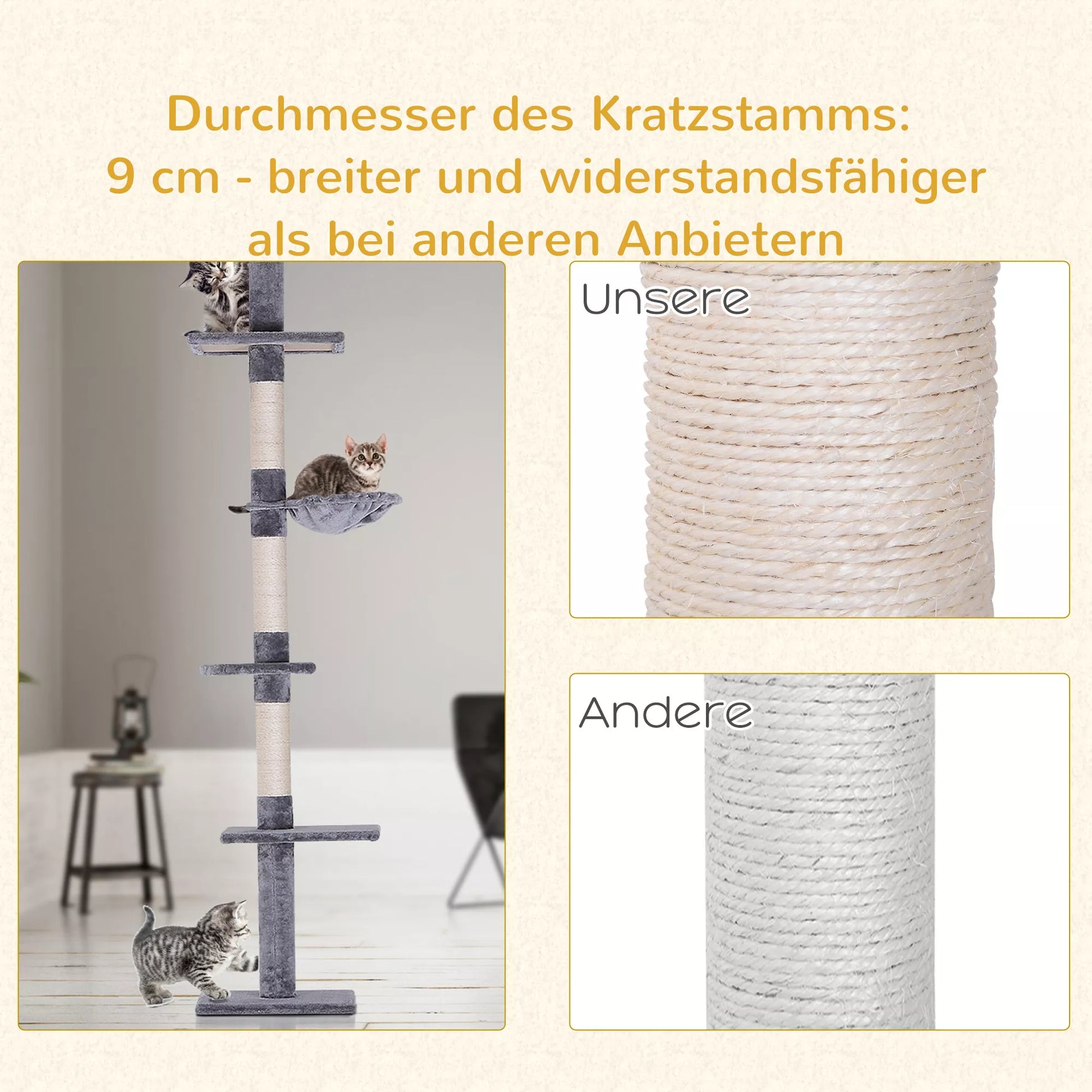 Nudžiuginkite savo pūkuotus numylėtinius su šia penkių aukštų draskykle. Tarp grindų ir lubų išsidėstę skirtingos minkštos pliušinės platformos laipiojimui ir poilsiui, kur jūsų katė tikrai mielai leis laiką. Centrinis stulpas apvyniotas sizaliu, kad jūsų katės galėtų galąsti nagus, o jūsų baldai liktų nepažeisti. Ši draskyklė džiugins ne tik kates, bet ir jų šeimininkus!