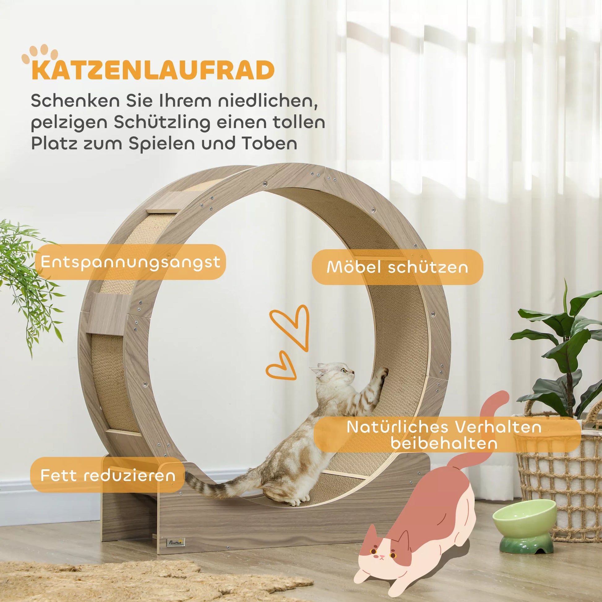 Katės bėgimo ratas, 91 cm, su stabdžiu ir draskykle, sveikam judėjimui, riešuto spalvos