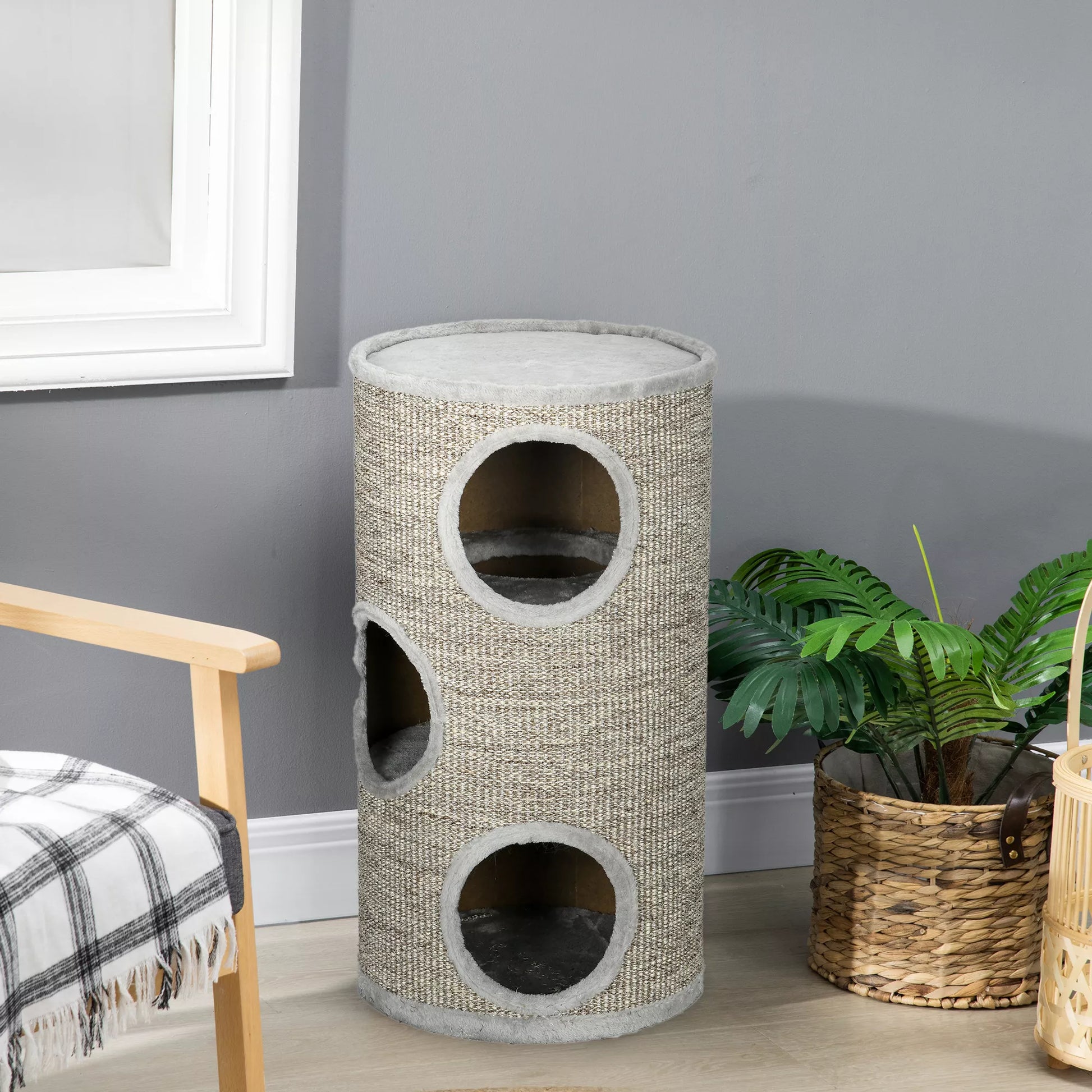 Katės draskomasis vamzdis su 3 lygiais, įsk. draskomasis paviršius iš sizalio virvės, katės draskomasis vamzdis, 38 cm x 38 cm x 70 cm, šviesiai pilkas