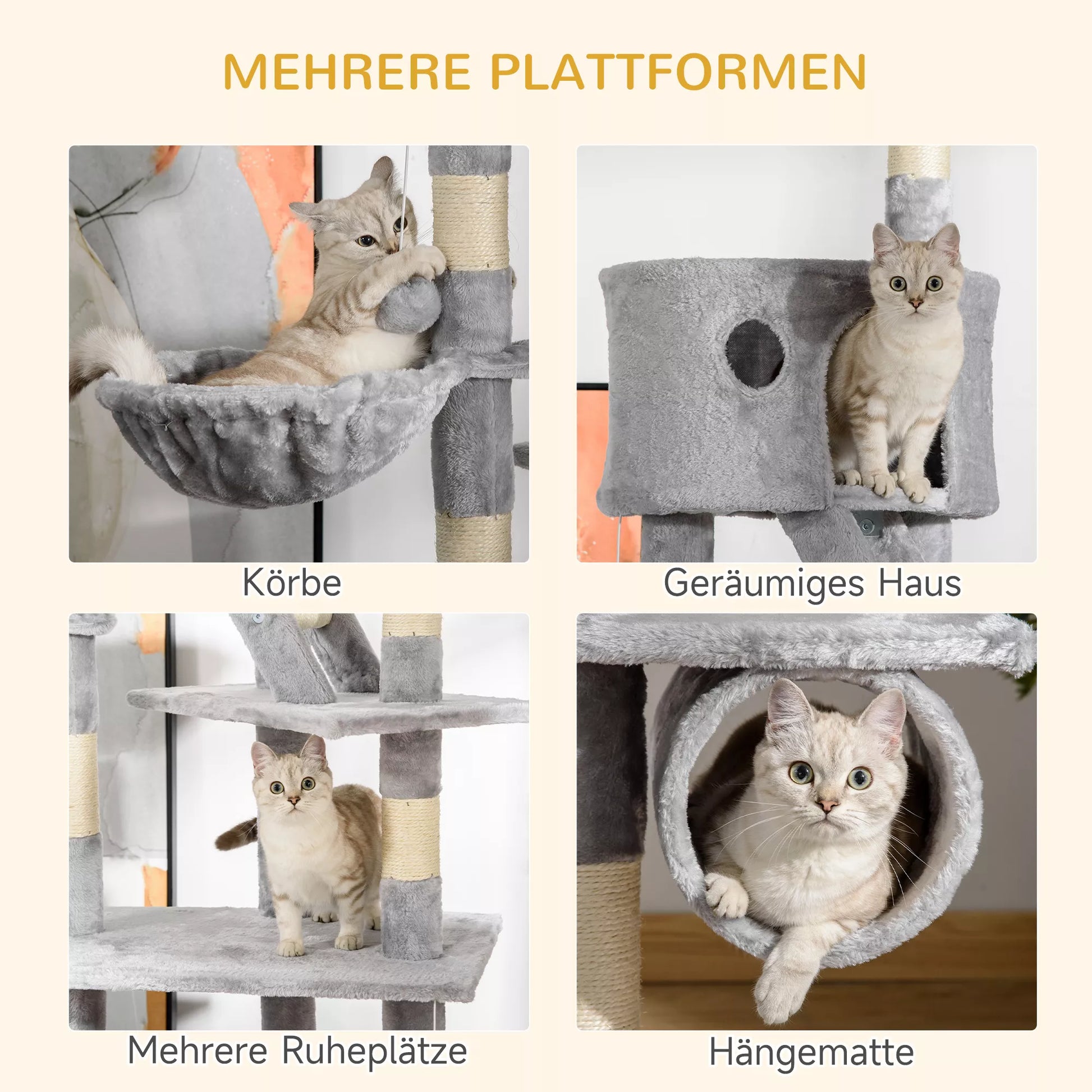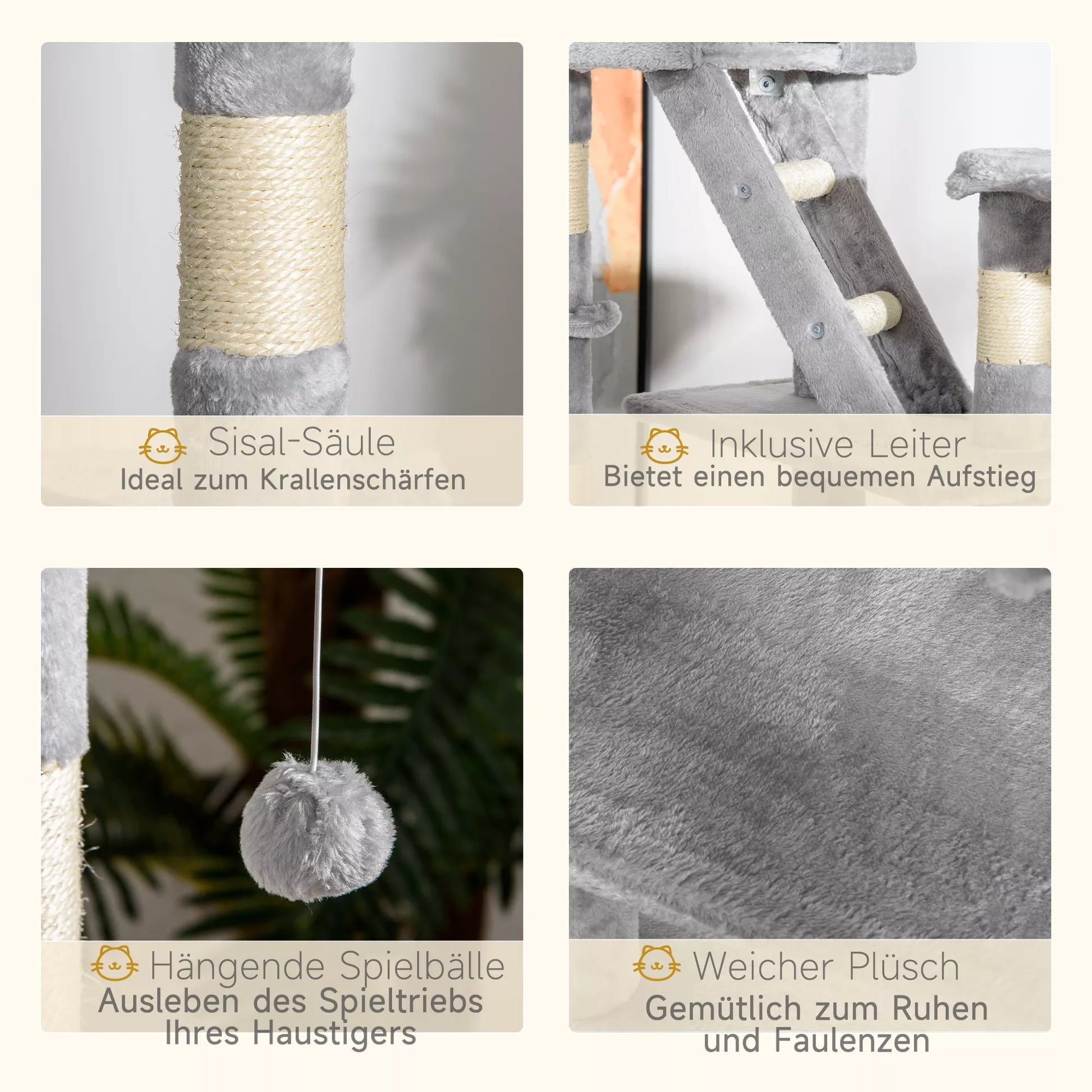 - ✔ Nuo lubų iki grindų siekiantis kačių medis su daugybe draskymo, glaudymosi, žaidimų ir miego galimybių
