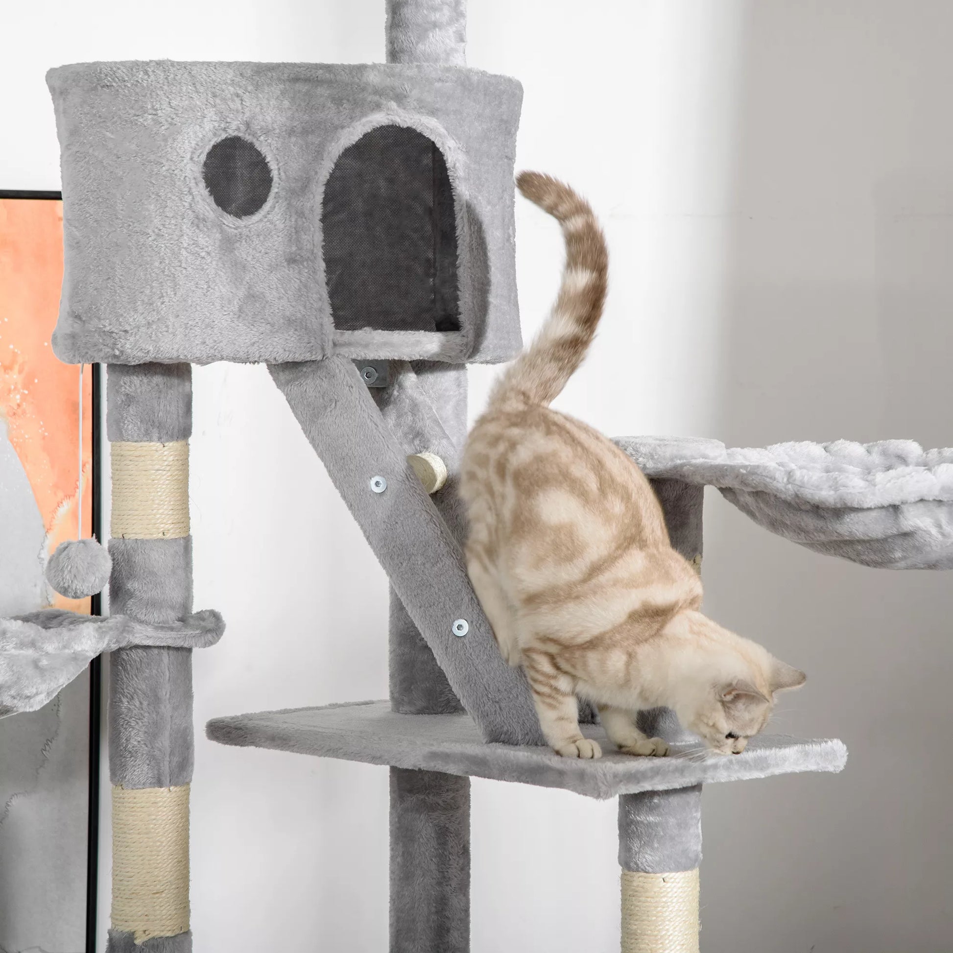 Katės draskyklė 240-260 cm, siekianti lubas, didelė draskyklė, laipiojimo medis katėms, draskyklė didelėms katėms su sizaline virve, šviesiai pilka