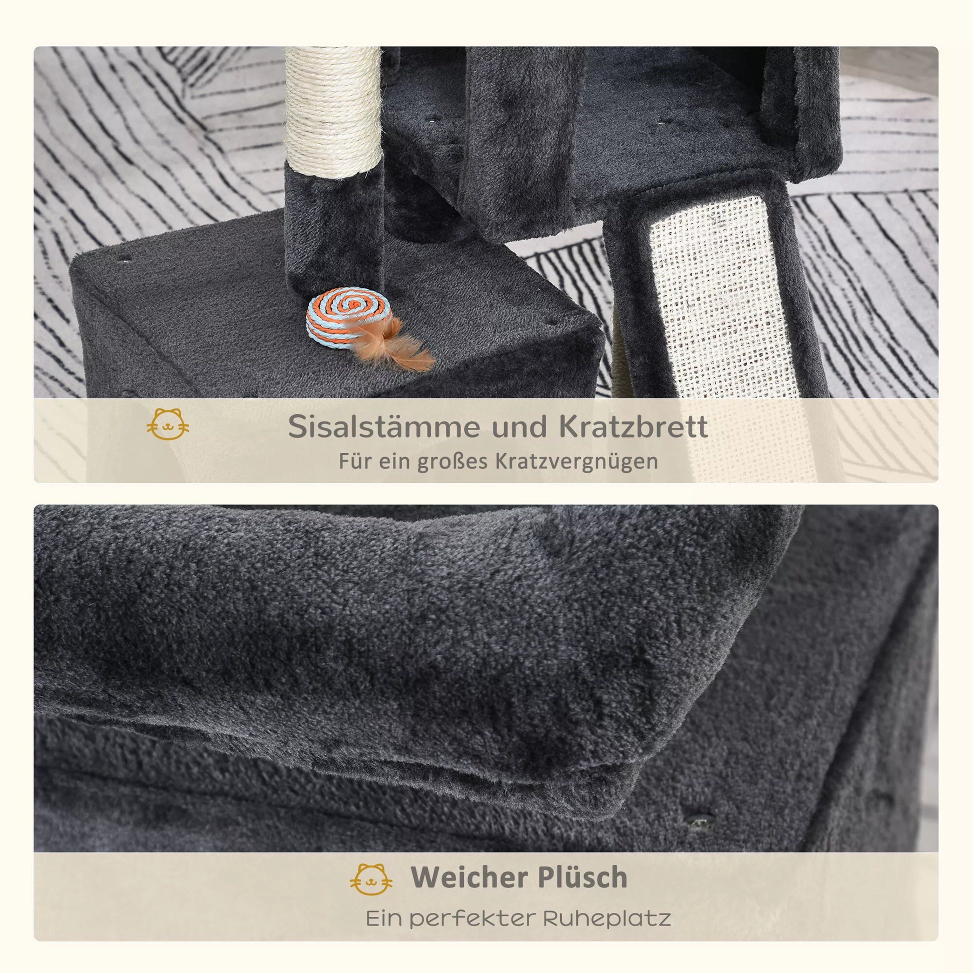 Šis katino draskykla gali jūsų augintinius užimti valandų valandas. Jis siūlo vietą žaisti, ilsėtis ir galimybę galąsti nagus. Katino draskyklą sudaro dvi nišos ir kelios poilsio platformos, visos padengtos minkštu pliušu. Nagams galąsti yra sizalio stulpas ir draskymo lenta. Ant šio tvirto katino baldo jūsų numylėtiniai galės dūkti iki soties.