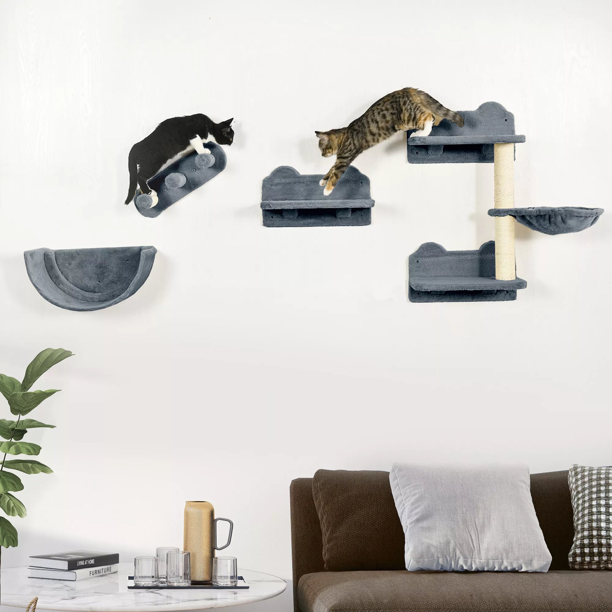Katės laipiojimo sienelės komplektas, hamakas, draskyklė, šokinėjimo platformos, pliušas, sizalis, pilka spalva