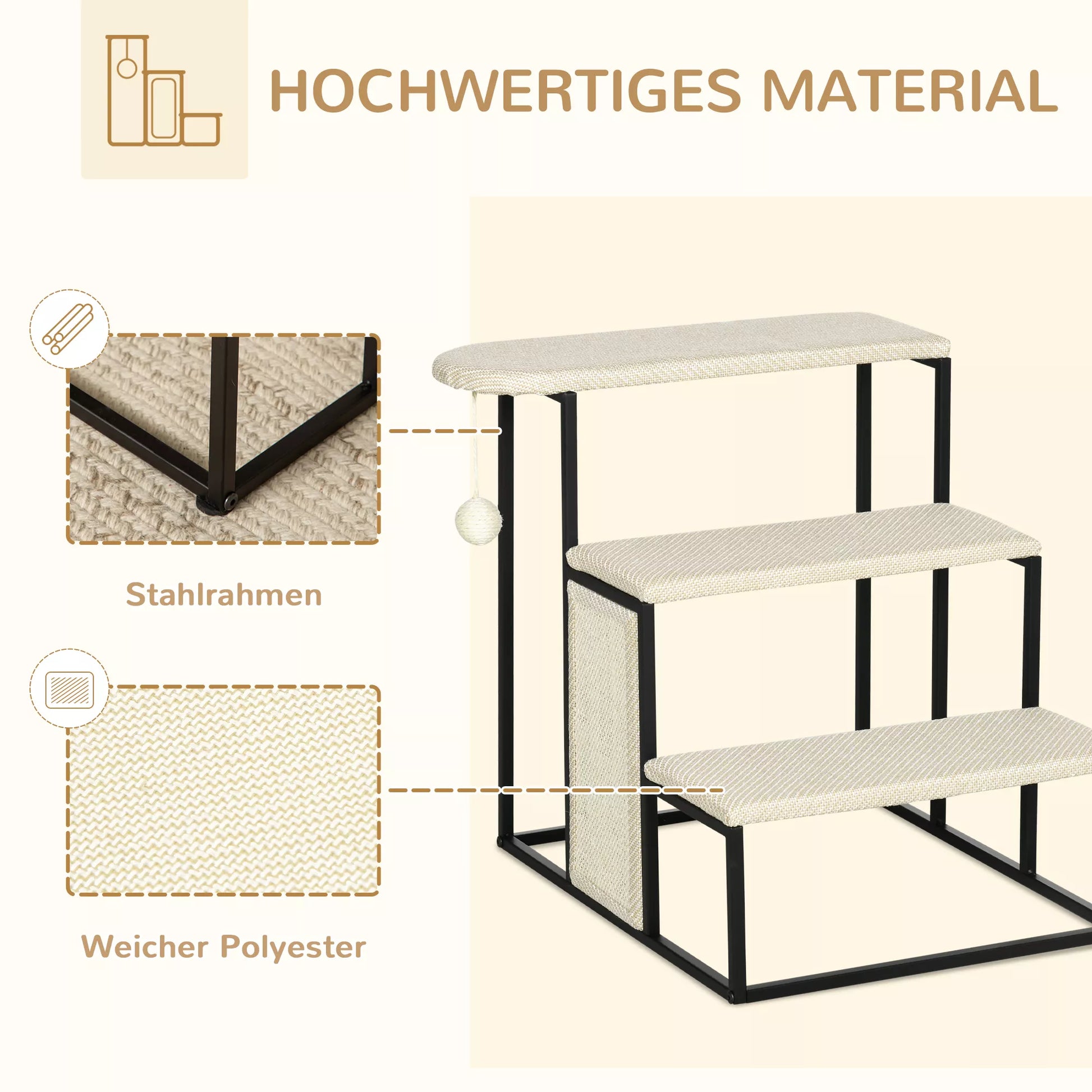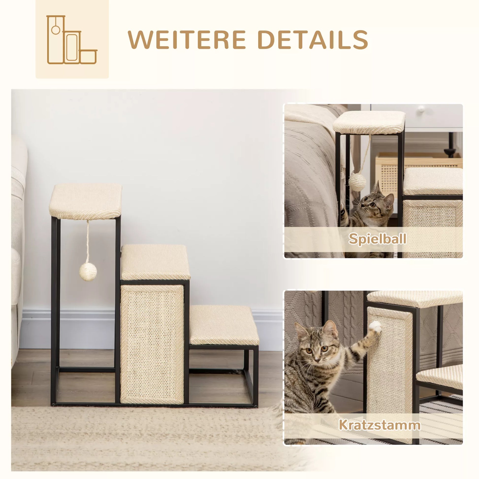 Katės laipteliai su draskykle, 3 pakopos, žaisliukas su kamuoliuku, tvirti, plienas+sisalas, kreminės baltos+juodos spalvos, 51 x 54 x 53cm