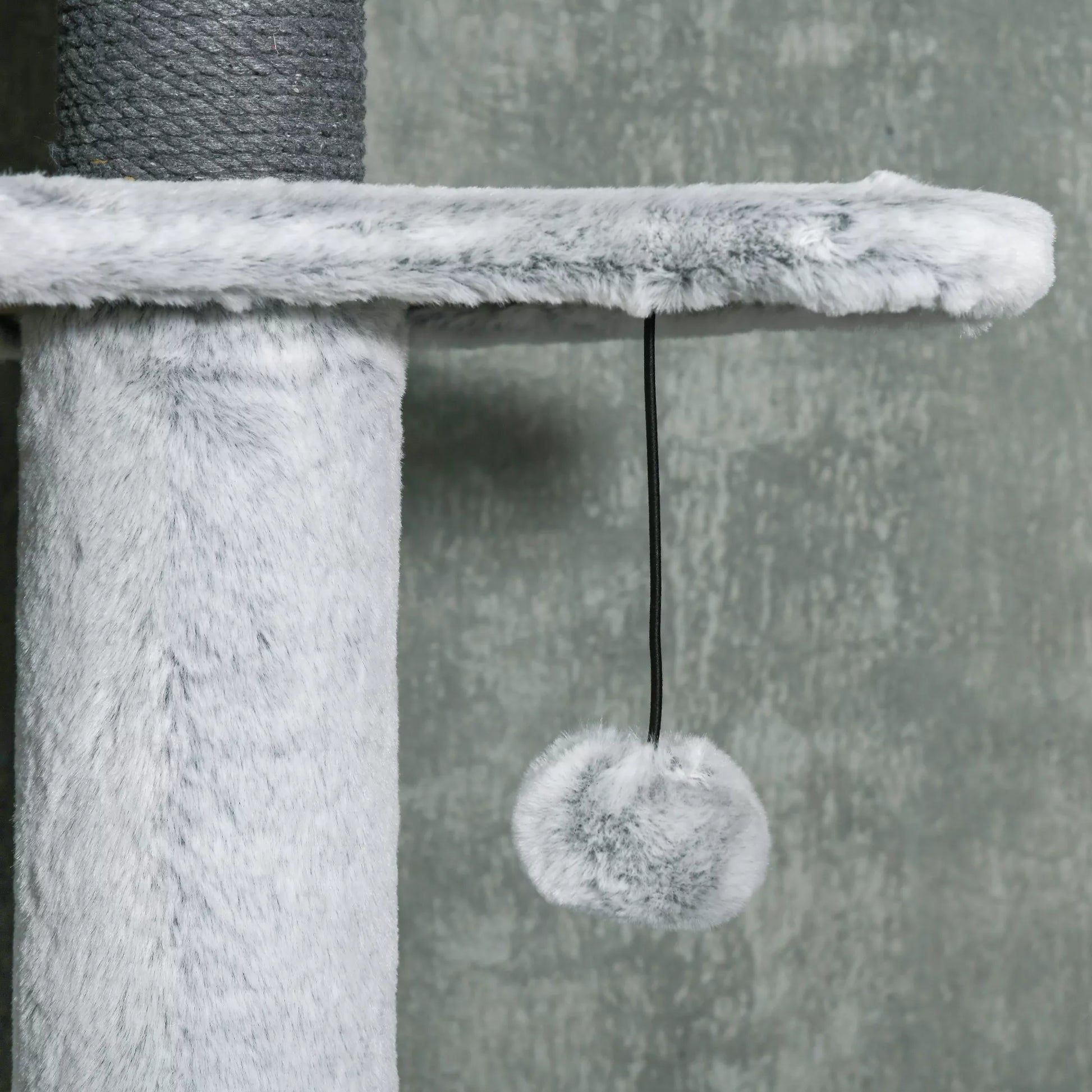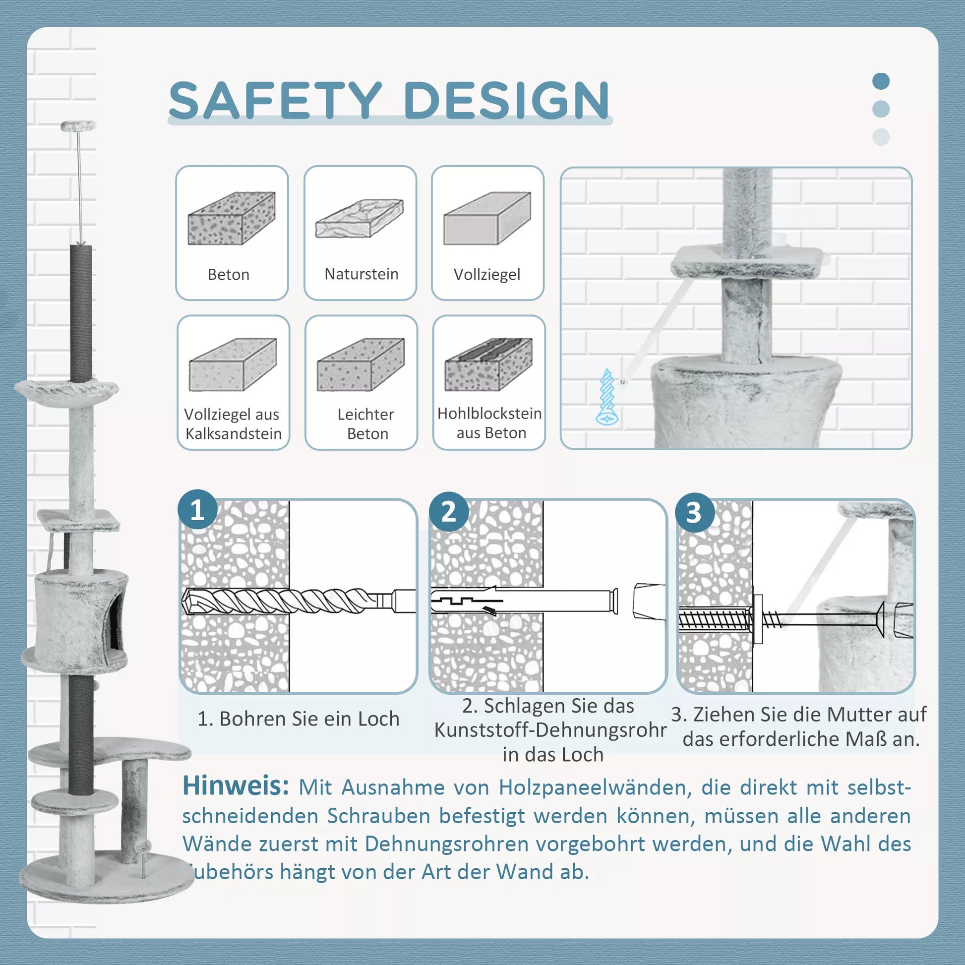 Katės medis su lubų įtempiu, hamaku, nameliu, platformomis, žaisliuku, 225-255cm, Pilkas