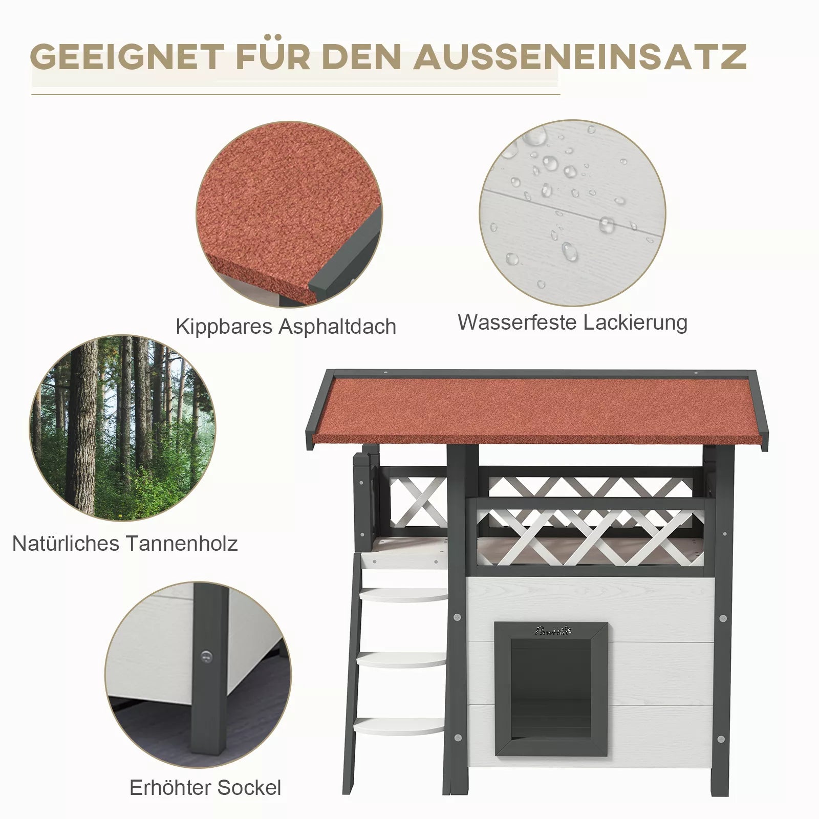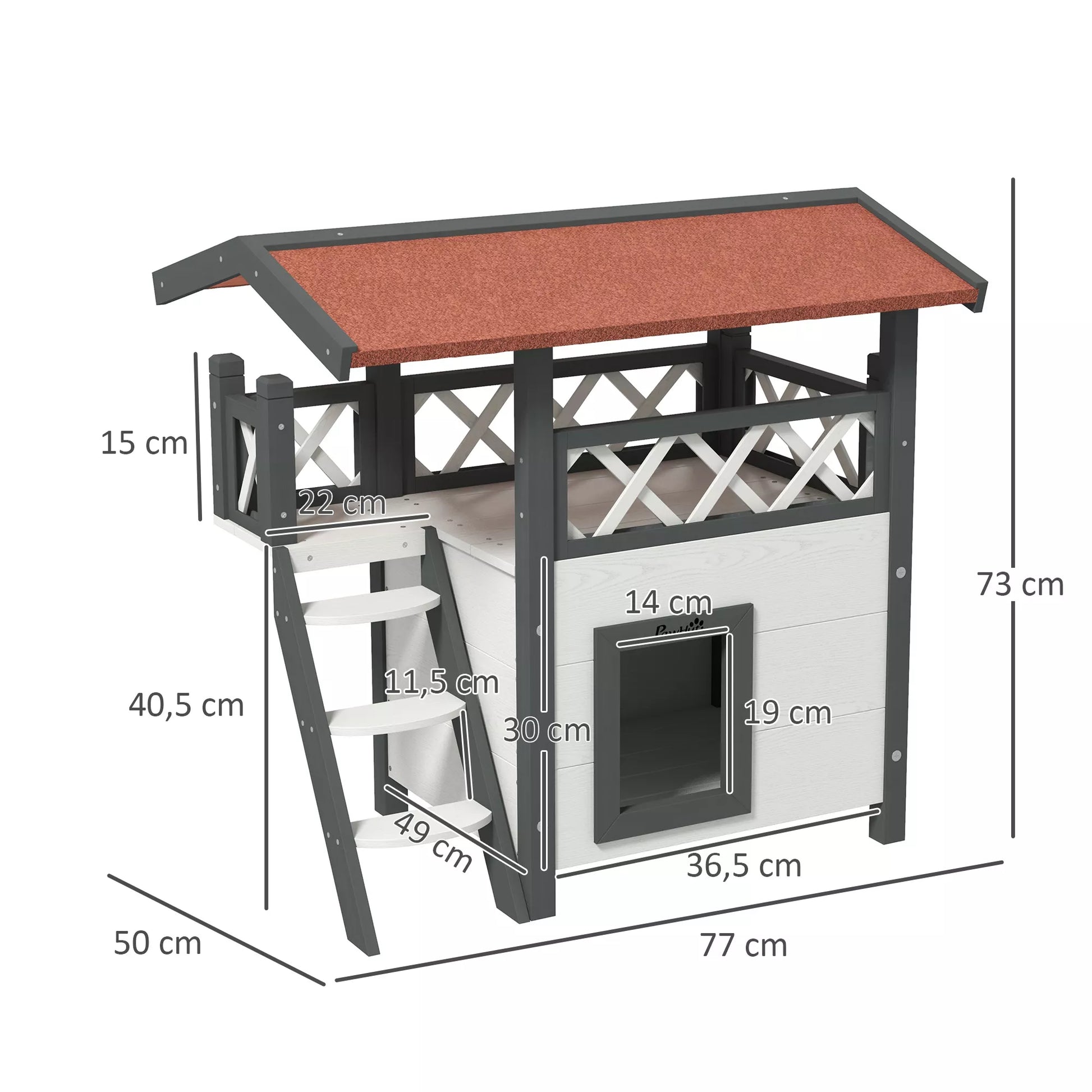 Mūsų dviejų aukštų kačių namelis PawHut idealiai tinka mažoms švelniapūkiams. Katčių namelis turi asfalto stogą ir vandeniui atsparų dažymą, todėl yra atsparus vandeniui ir oro sąlygoms. Namelis turi tris kačių landas, šokinėjimo lentas, duris ir smagų įėjimą jūsų katei. Apatinėje oloje galima pastatyti kačių tualetą. Šis kačių namelis yra nuostabūs jūsų katės namai.