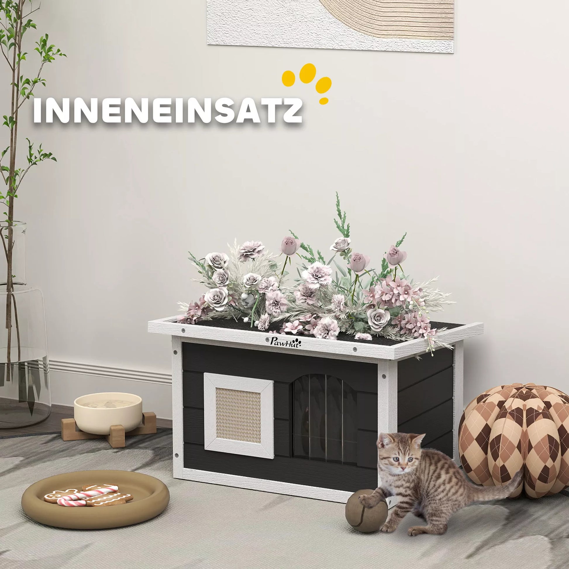 Katės namelis, pasislėpimo vieta katėms ir triušiams, medinis namelis su draskykle, durelėmis, 61 x 45 x 36,5 cm, pilkos spalvos