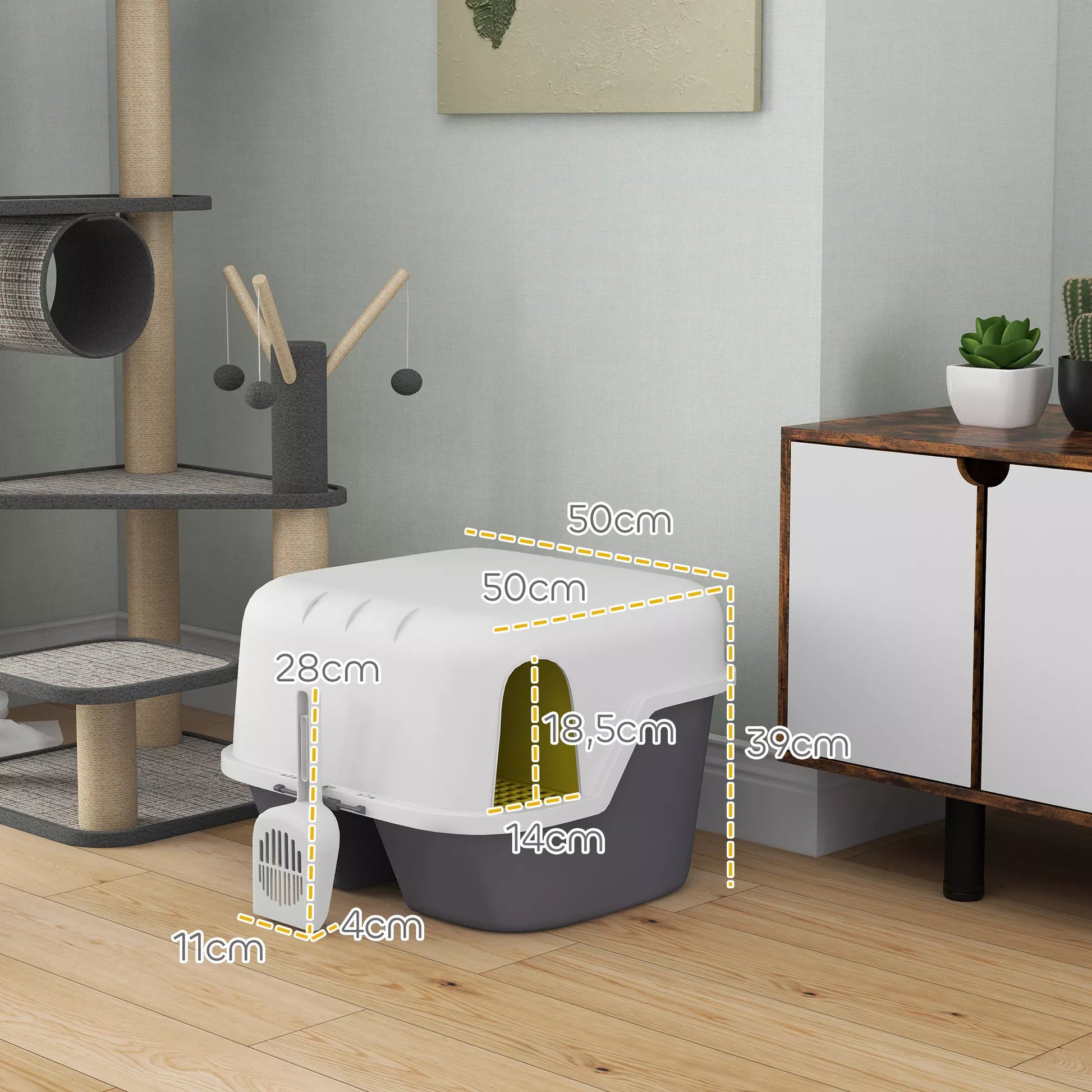 Katės tualetas, katino dėžutė su dangčiu ir kastuvėliu, lengvai valomas, uždaromas, balta