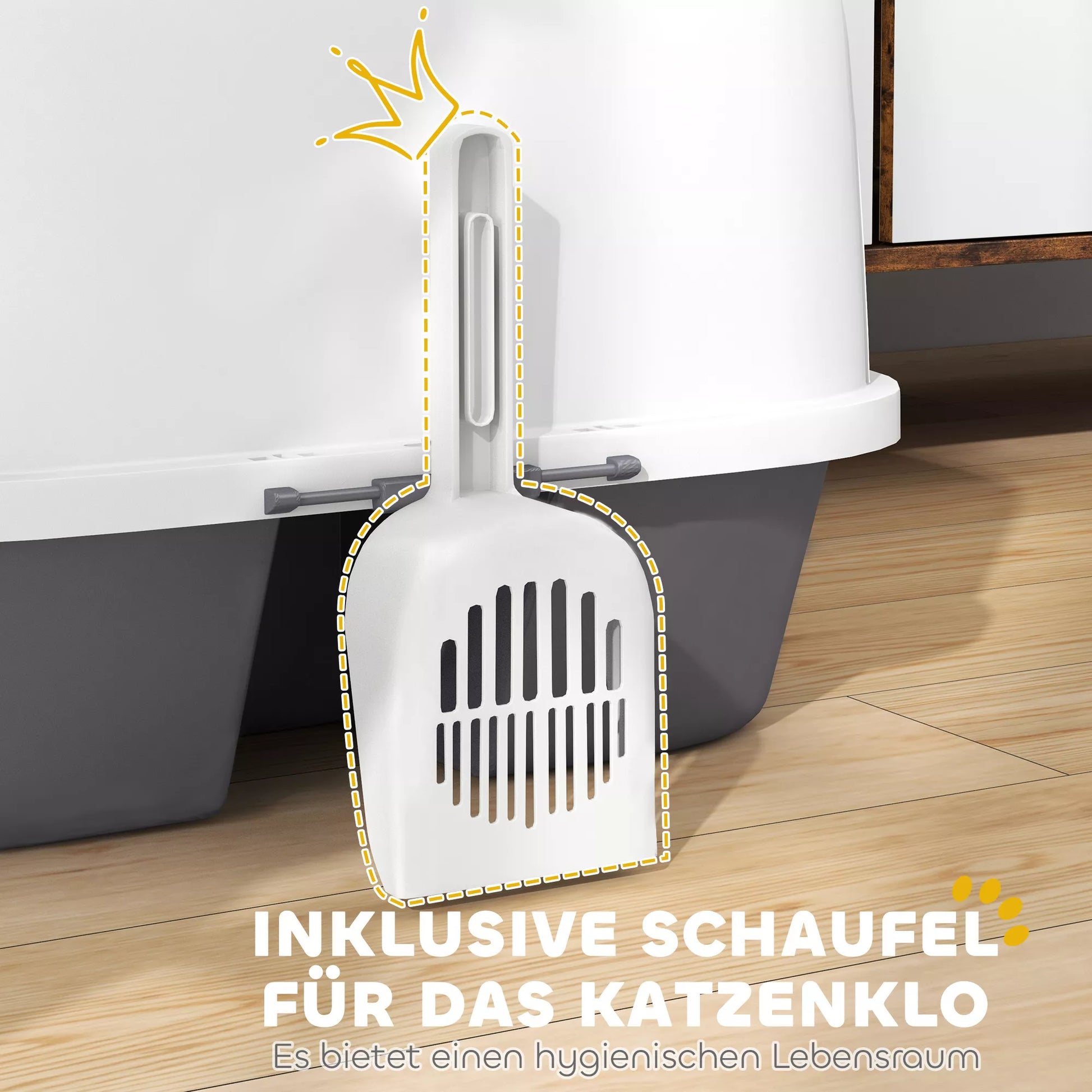 - ✔ Pusiau uždara kačių tualeto konstrukcija užtikrina privatumą ir sumažina kraiko išbėrimą